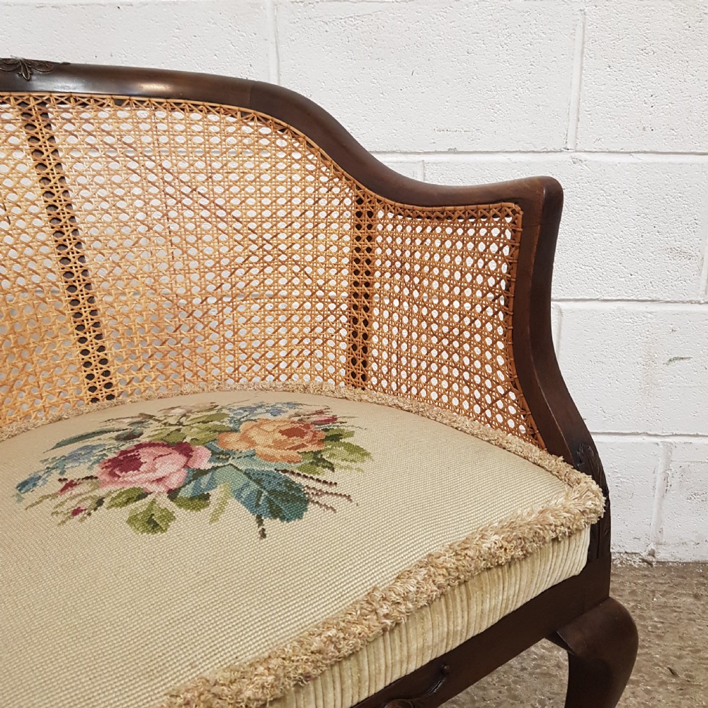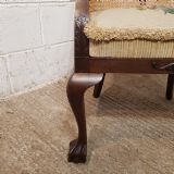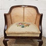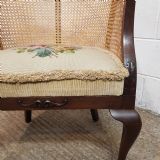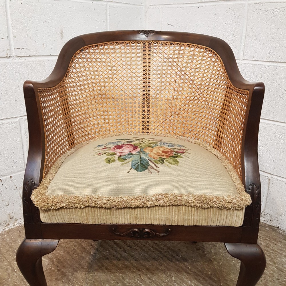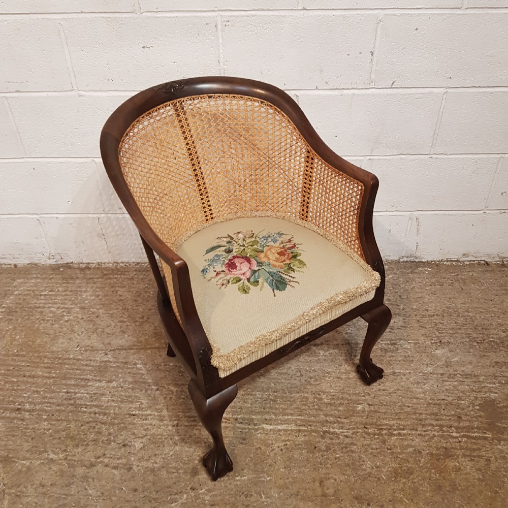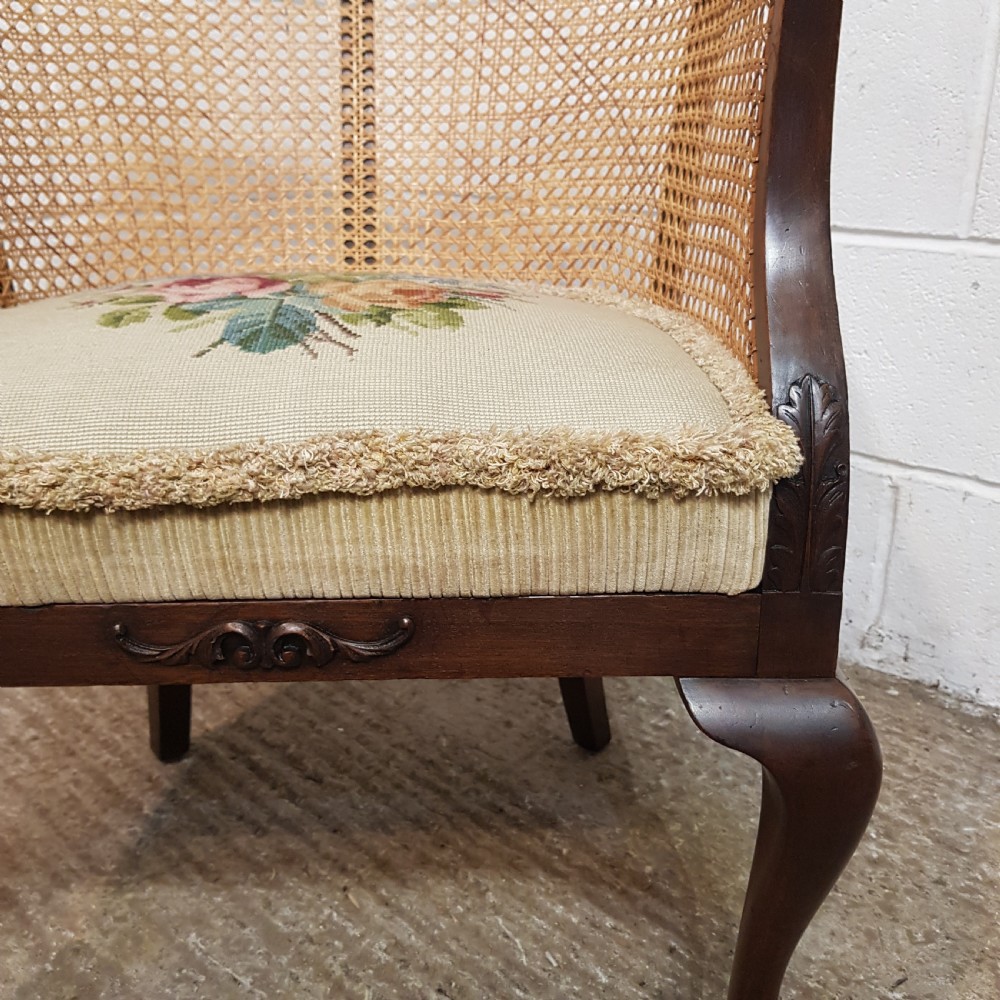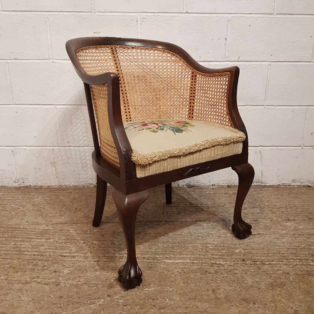 A Denby & Spinks Mahogany framed bergere backed tub chair and dating from around 1920. This wonderful piece has a curved frame to the top with a small carved catouche to the centre of the back and carved Acanthus leaves to the bottom of the arms. It has a needle point drop in seat pad which is in very good condition and a mahogany rail underneath which is carved to the centre. It stands on cabriole legs on a claw and ball foot. The bergere is in very good condition.
