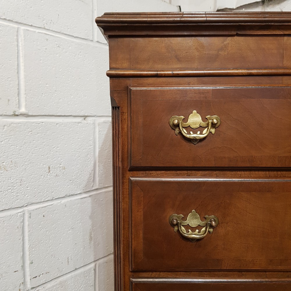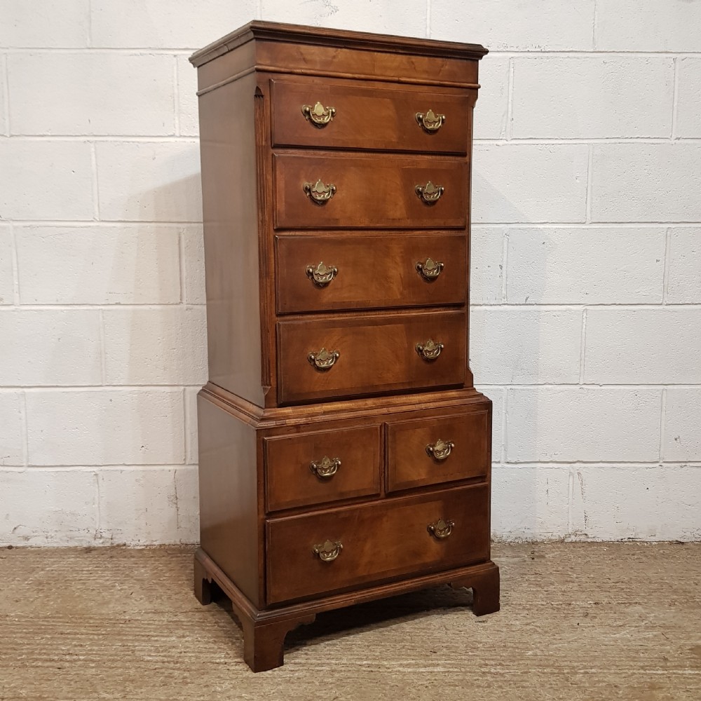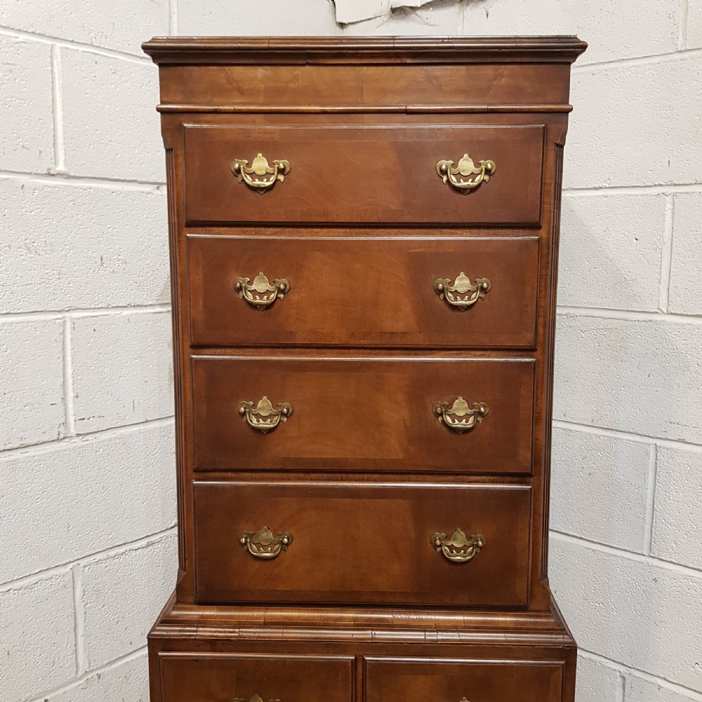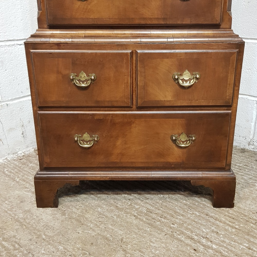 An antique Walnut dwarf chest on chest and dating from around 1920. The chest on chest features a cross banded and moulded edge to the top. The top lifts up to reveal an open compartment. It has four long graduating drawers all of which are Oak lined with original brass handles. The base is moulded around the top with two short drawers and one long drawer, again all Oak lined with original brass handles. It is moulded around the bottom and stands on bracket feet. The top lifts off the base for ease of movement.