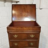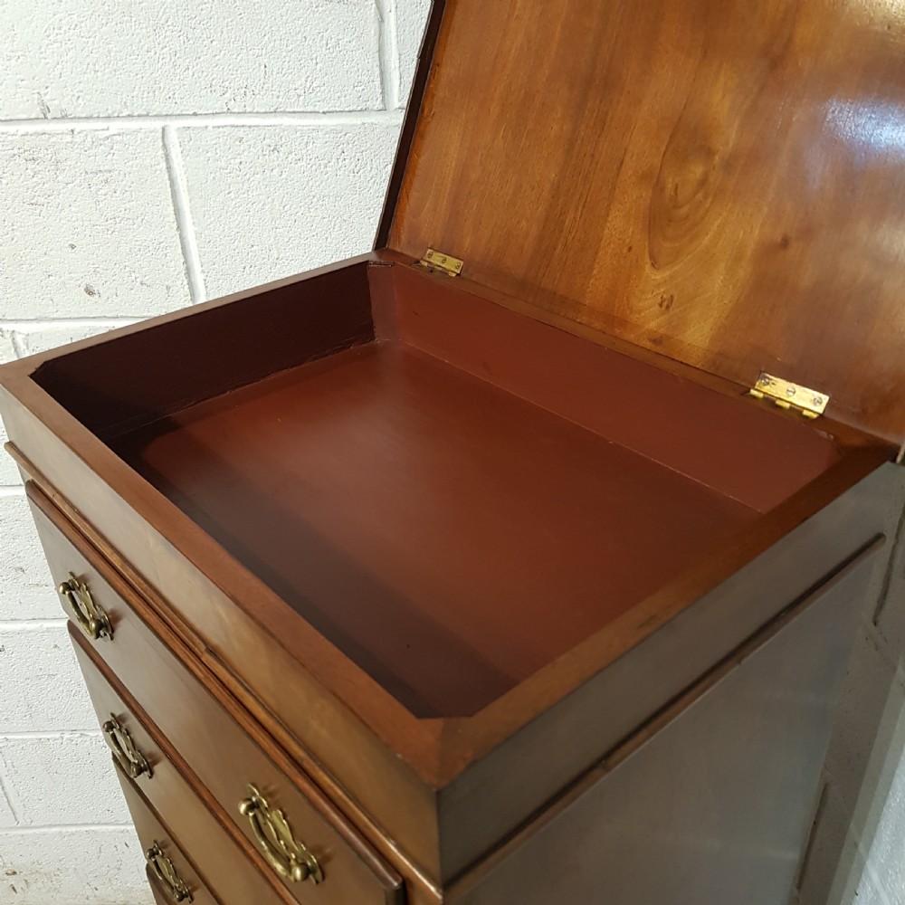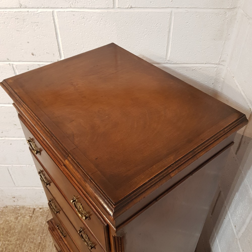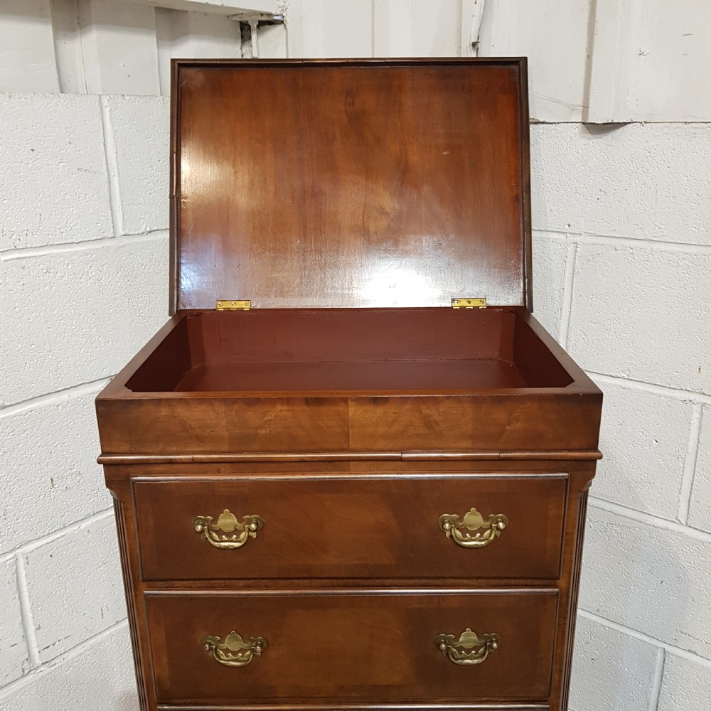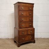 An antique Walnut dwarf chest on chest and dating from around 1920. The chest on chest features a cross banded and moulded edge to the top. The top lifts up to reveal an open compartment. It has four long graduating drawers all of which are Oak lined with original brass handles. The base is moulded around the top with two short drawers and one long drawer, again all Oak lined with original brass handles. It is moulded around the bottom and stands on bracket feet. The top lifts off the base for ease of movement.