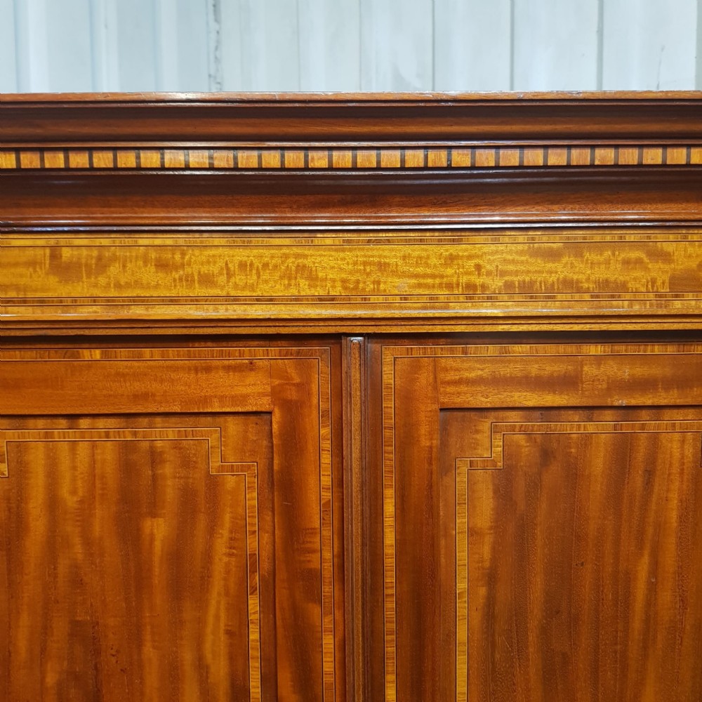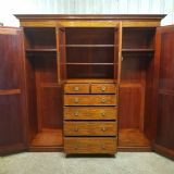 An Edwardian Mahogany triple wardrobe by Maples and dating from around 1900. This stunning wardrobe has a moulded cornice with inlaid dental moulding and a wide lip under. To the centre are two doors, each has a strung and moulded panel with original brass handles. Inside are two shelves. Under the doors are two short over four long graduating drawers, all of which are Mahogany lined with original brass handles. To each end is a mirrored door with a strung frame and original brass handles. Inside both of these doors is a shelf with a rail underneath. The wardrobe stands on a plinth base and separates into seven pieces for ease of movement.