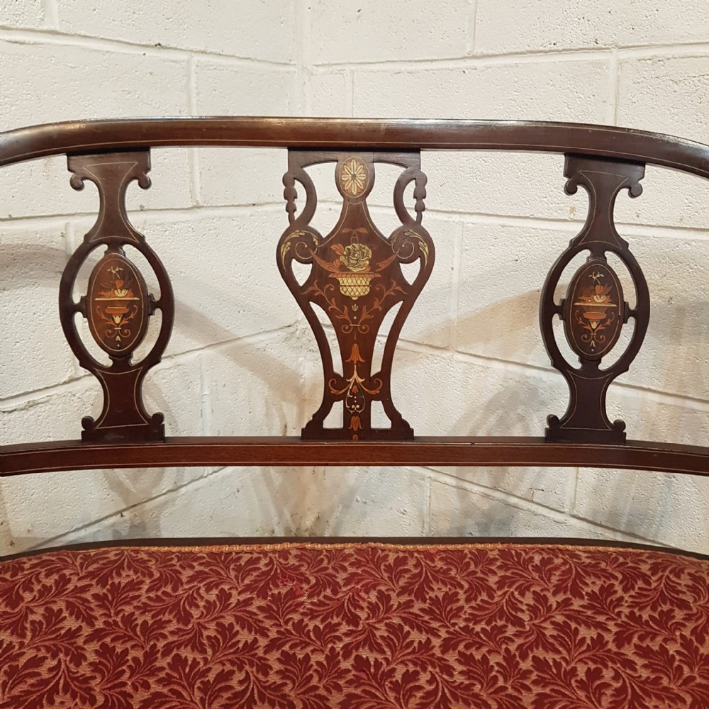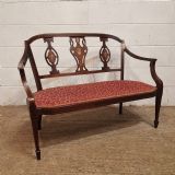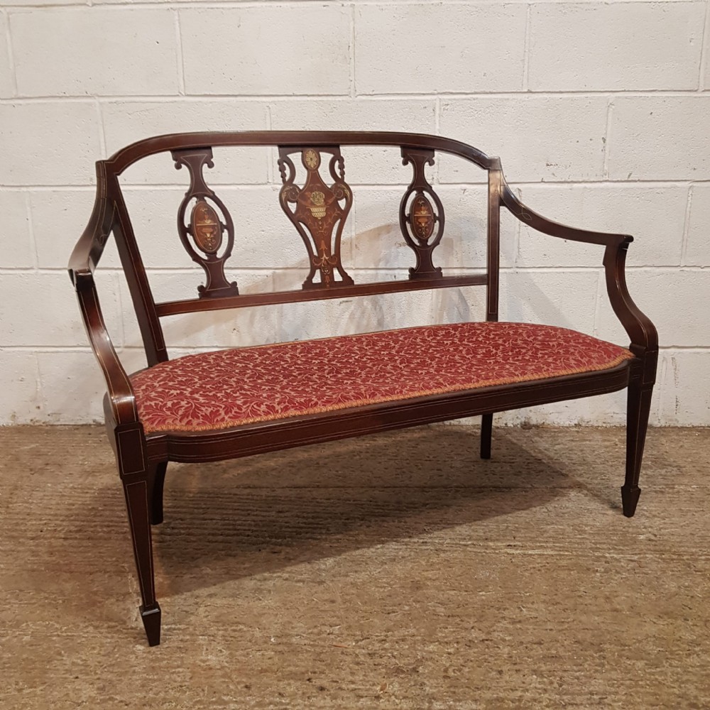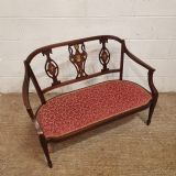 An Edwardian Mahogany Salon sofa and dating from around 1900. This lovely example has a curved back rail strung in satin wood with three inlaid splats underneath. It has Shepard Crook arms which are also strung in Satin wood and the padded seat is in very good condition. It has a strung rail underneath the seat to the front. It stands on square tapered legs on a spade foot.