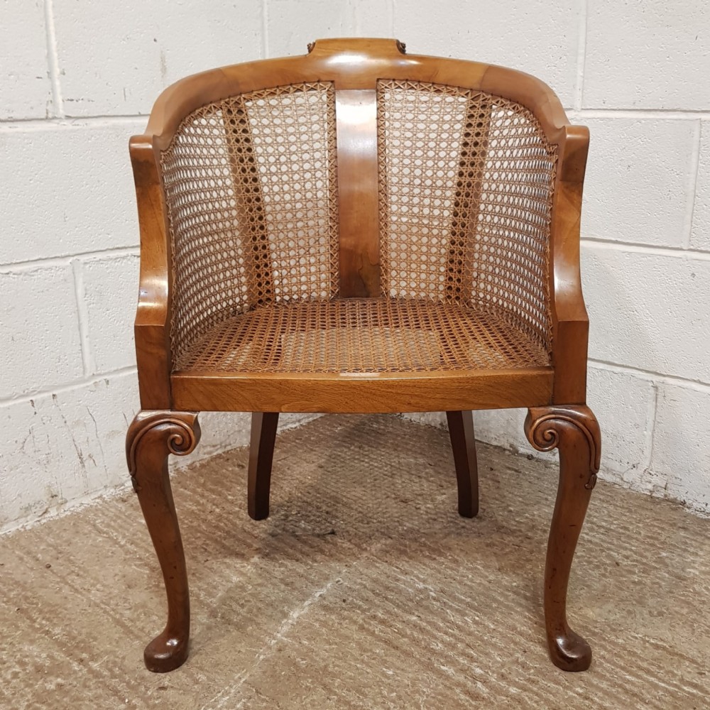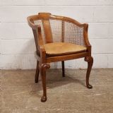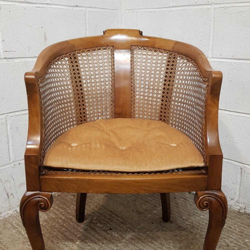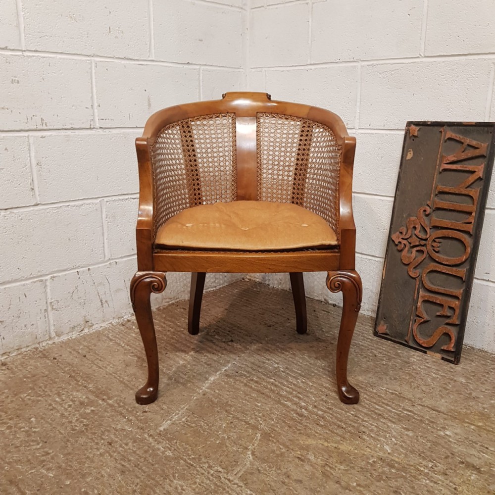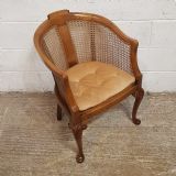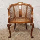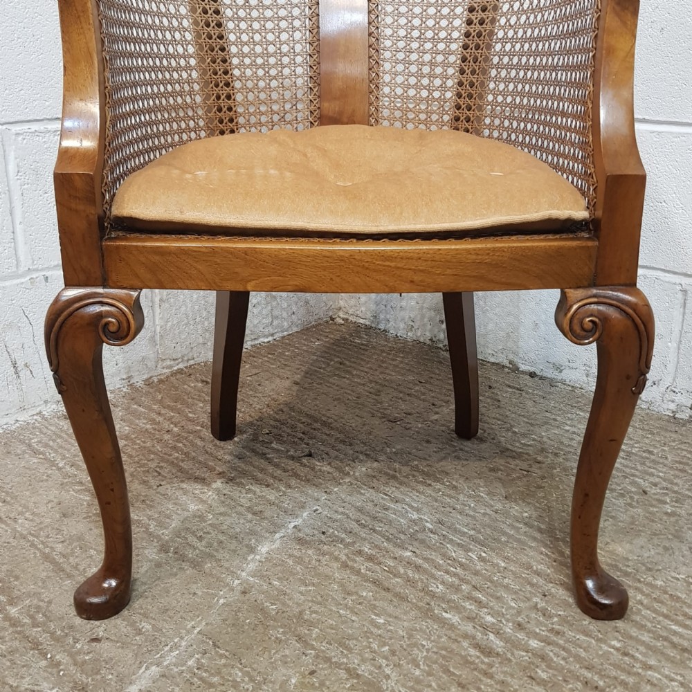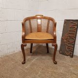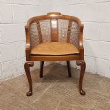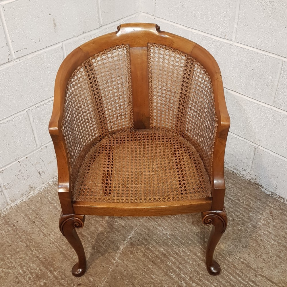 An Edwardian Bergere Walnut framed tub chair and dating from around 1900. This lovely chair has a curved top rail to the back with a raised centre and a central splat and shepherd crook supports to the front. It features Bergere panels and seat with a removable padded seat pad. It stands on cabriole legs which are carved to the shoulder.