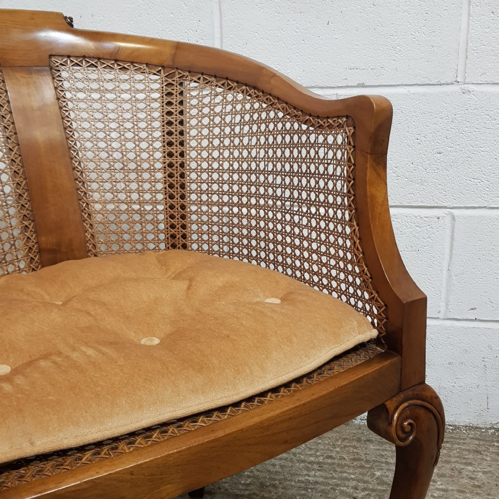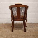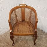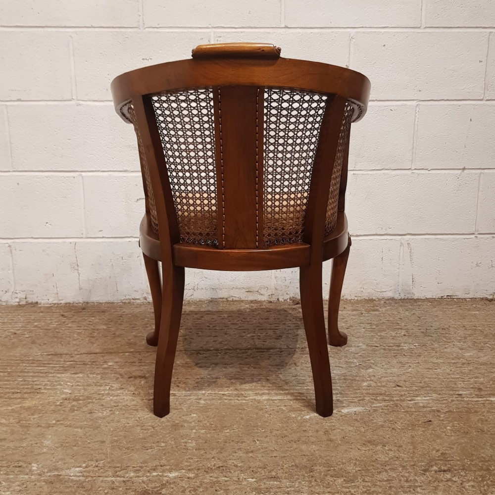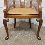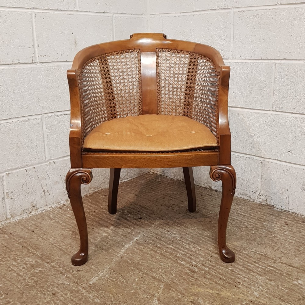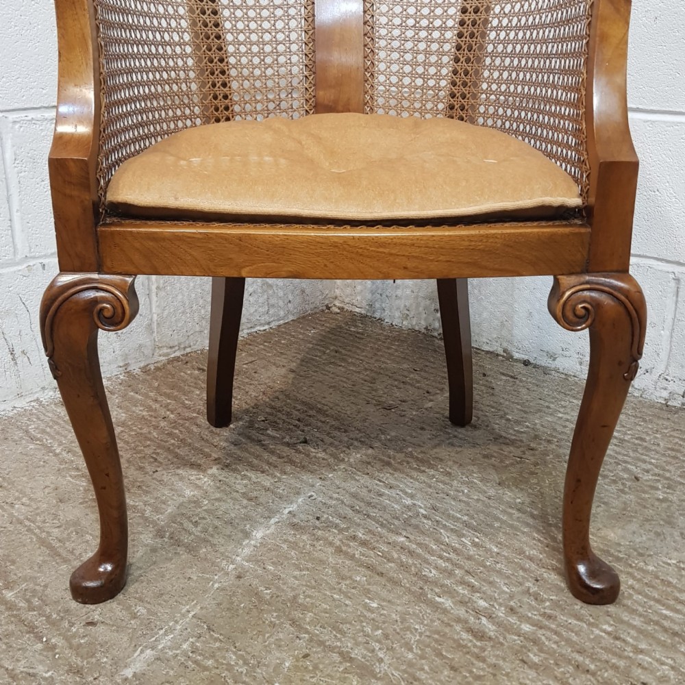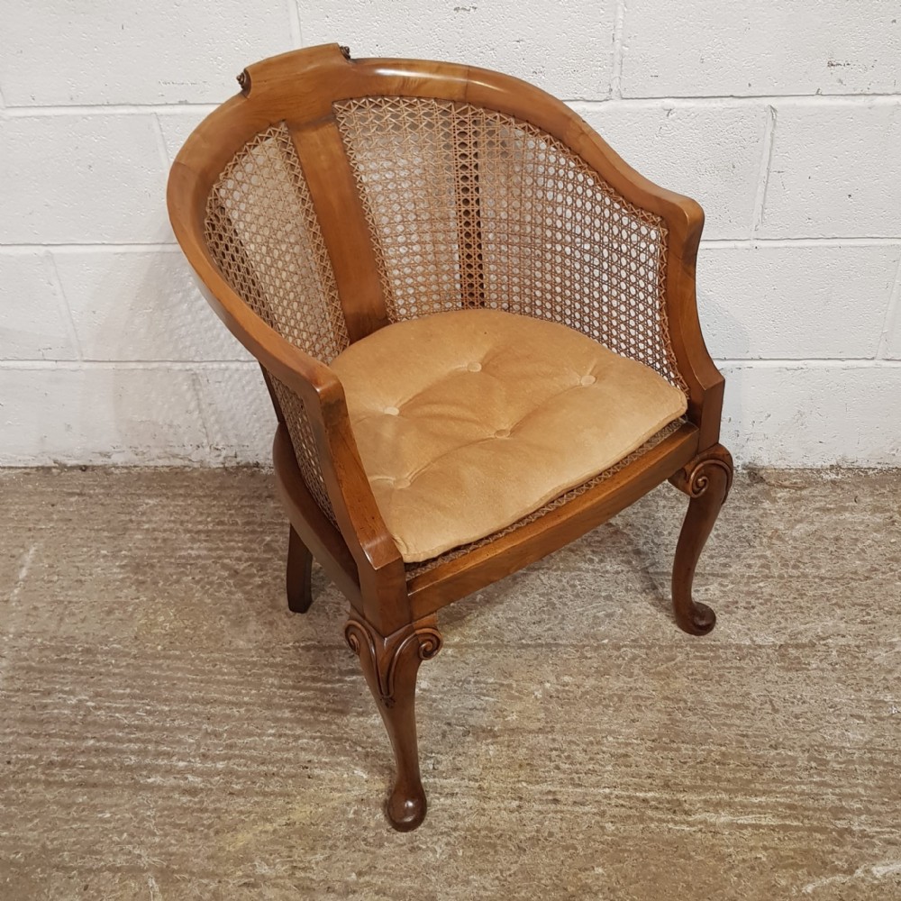 An Edwardian Bergere Walnut framed tub chair and dating from around 1900. This lovely chair has a curved top rail to the back with a raised centre and a central splat and shepherd crook supports to the front. It features Bergere panels and seat with a removable padded seat pad. It stands on cabriole legs which are carved to the shoulder.