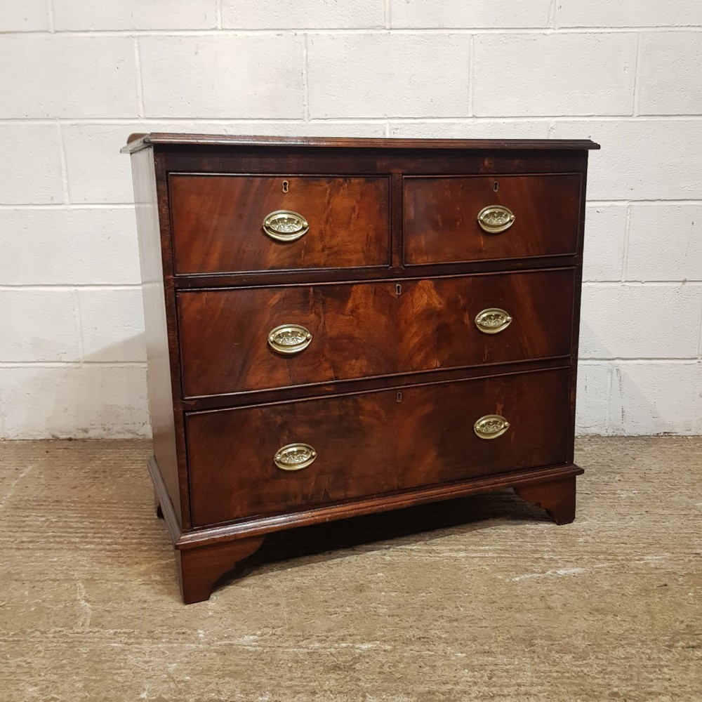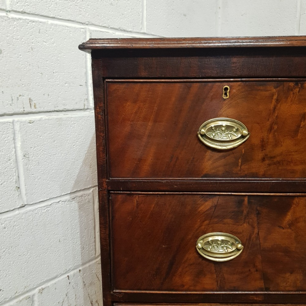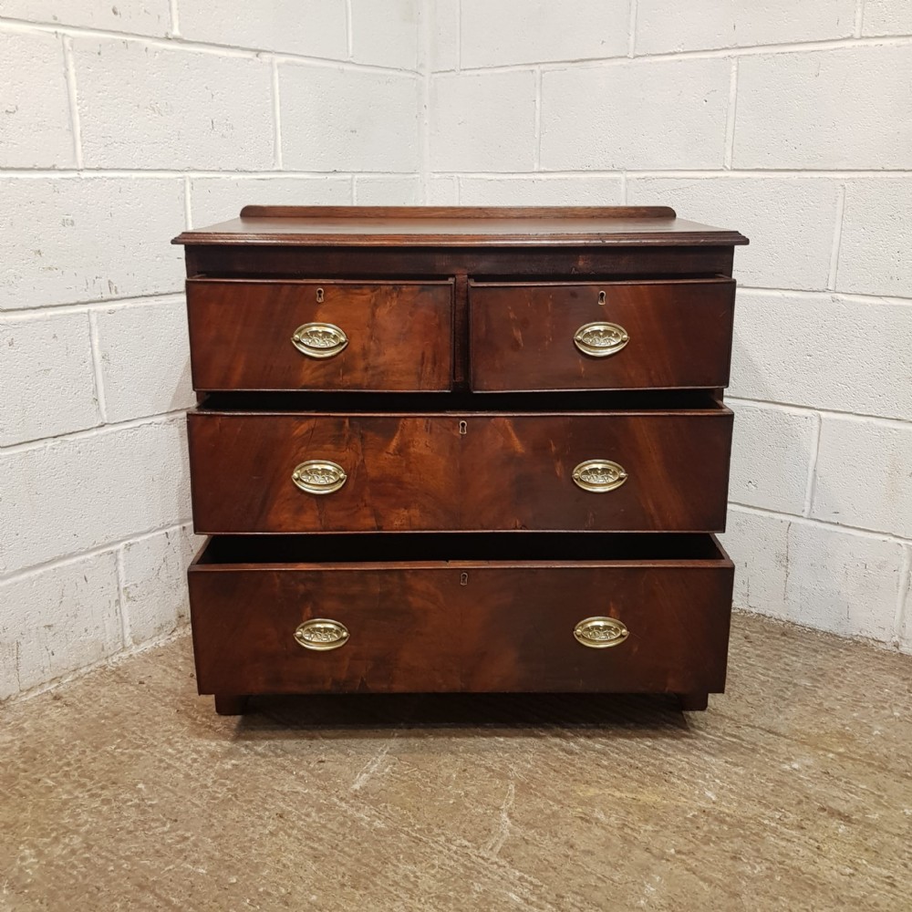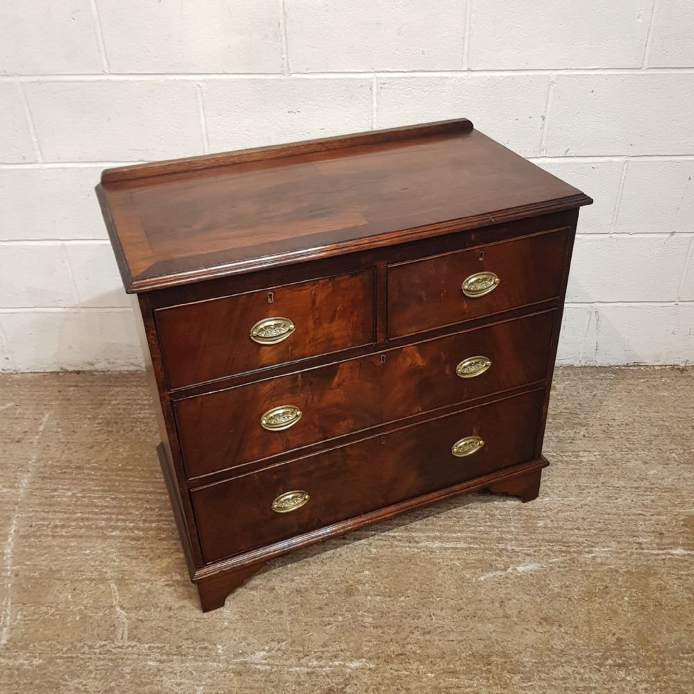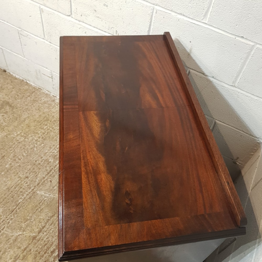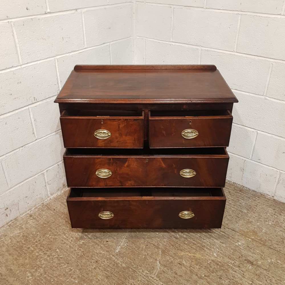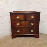 A 3 height Mahogany chest of drawers and dating from around 1920. The top of this chest of drawers has a low gallery back and a wide and cross banded and moulded edge to the top. It has two short drawers over two long graduating drawers all of which are Oak lined with original brass handles. It is moulded around the bottom and stands on bracket feet.