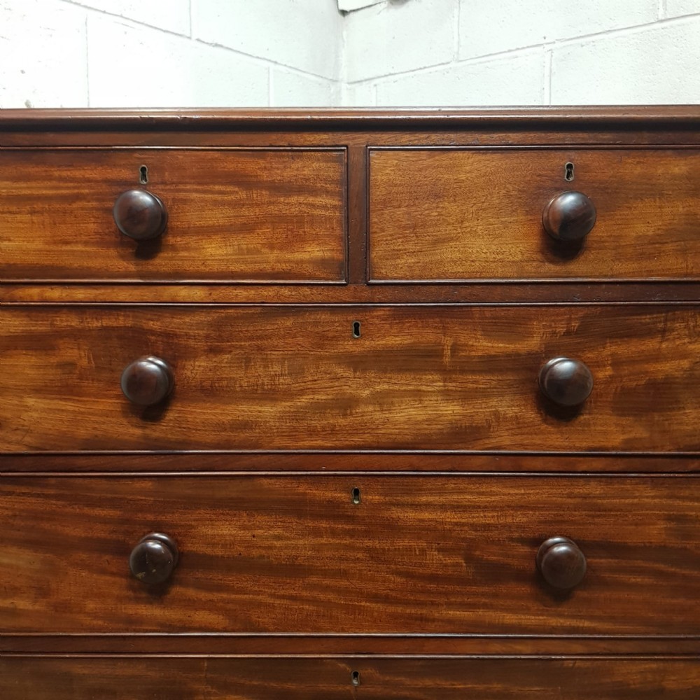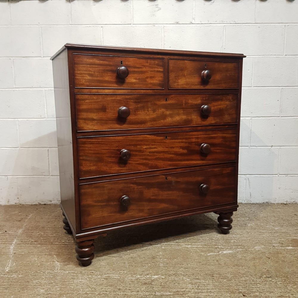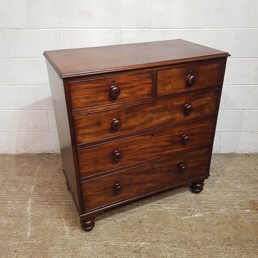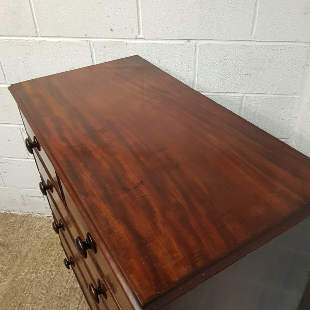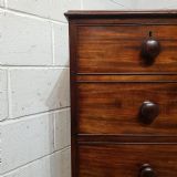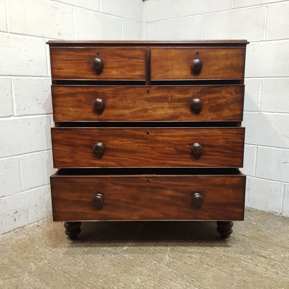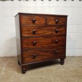 A Victorian Mahogany 4 height chest of drawers and dating from around 1880. This chest of drawers has a moulded edge to the top, with two short drawers over three long graduating drawers all of which are Oak lined with original knob handles. It is moulded around the bottom and stands on turned bun feet.