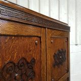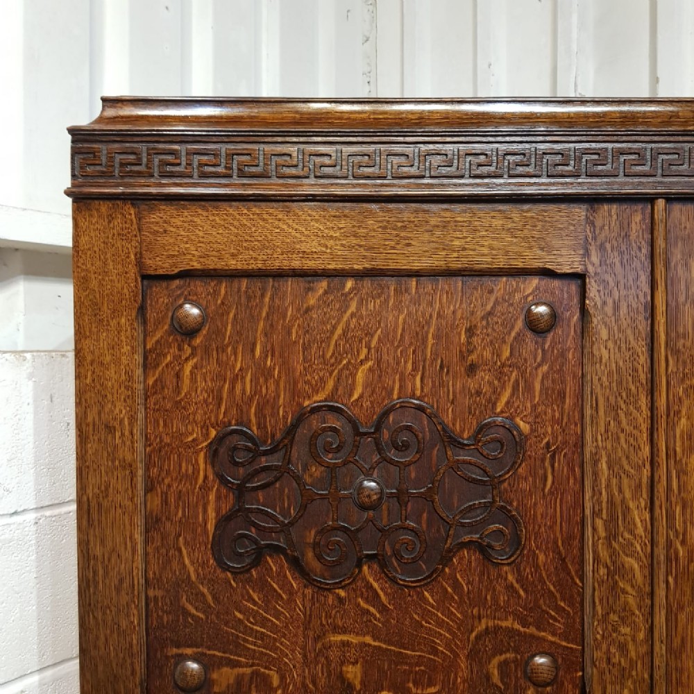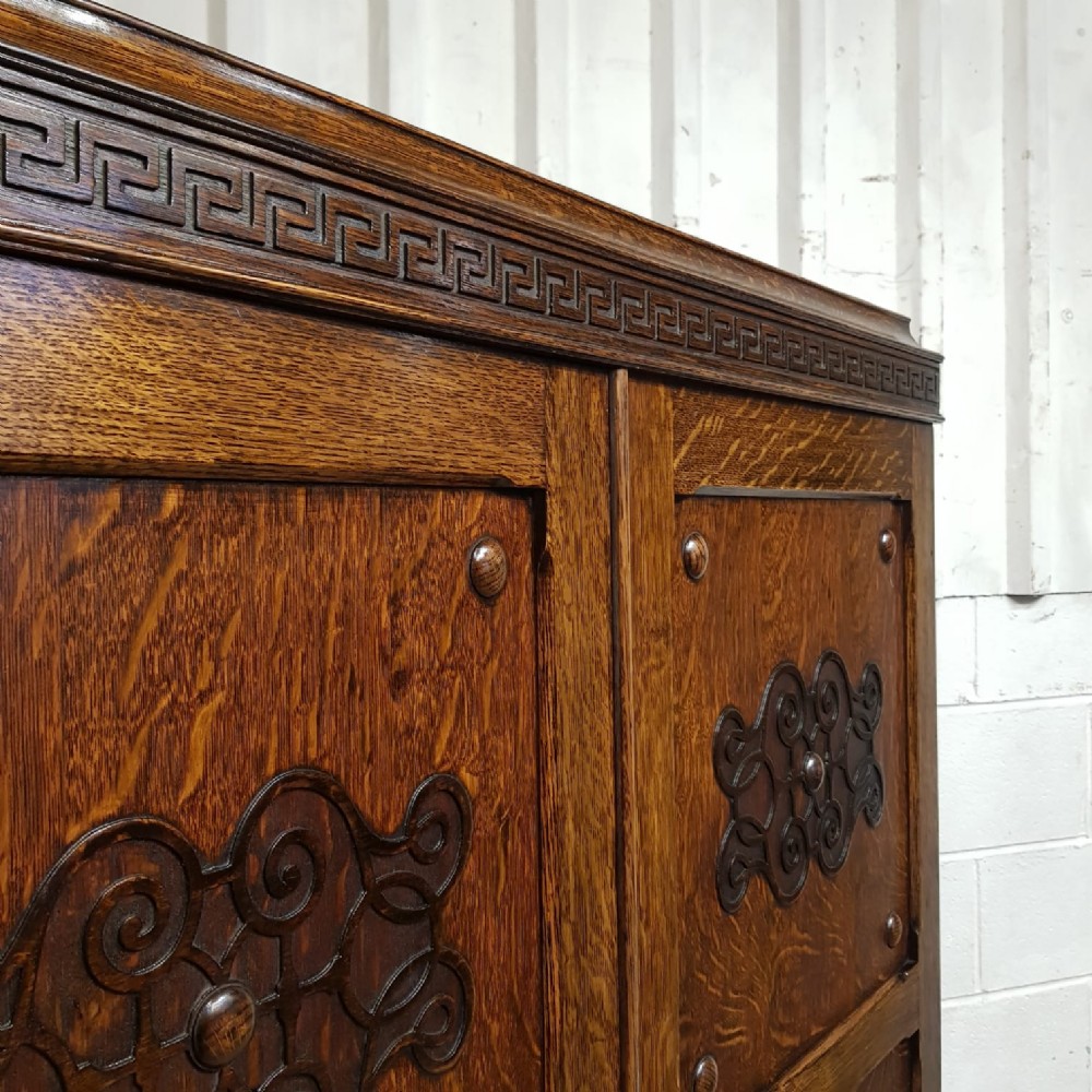 An antique Oak double wardrobe and dating from around 1920. This lovely original wardrobe has a moulded caddy cornice with a wide Greek key carved lip underneath. Both doors have three panels with the top panel being carved centre with Oak roundals and two rectangular panels underneath both with original handles. Inside is a rail with hooks underneath with a mirror to the back of the right hand door. The wardrobe stands on a moulded plinth base on turned bun feet.