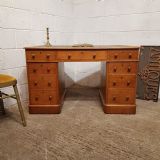 A Victorian golden Oak twin pedestal writing desk and dating from around 1880. This writing desk has an embossed leather writing surface and moulded edge to the top. It has a long drawer above the knee hole with a drawer to each side. Each pedestal has three graduating drawers, all of which are mahogany lined. The pedestals have a plinth base on castors and the top lifts of for ease of movement,