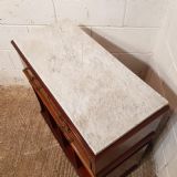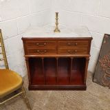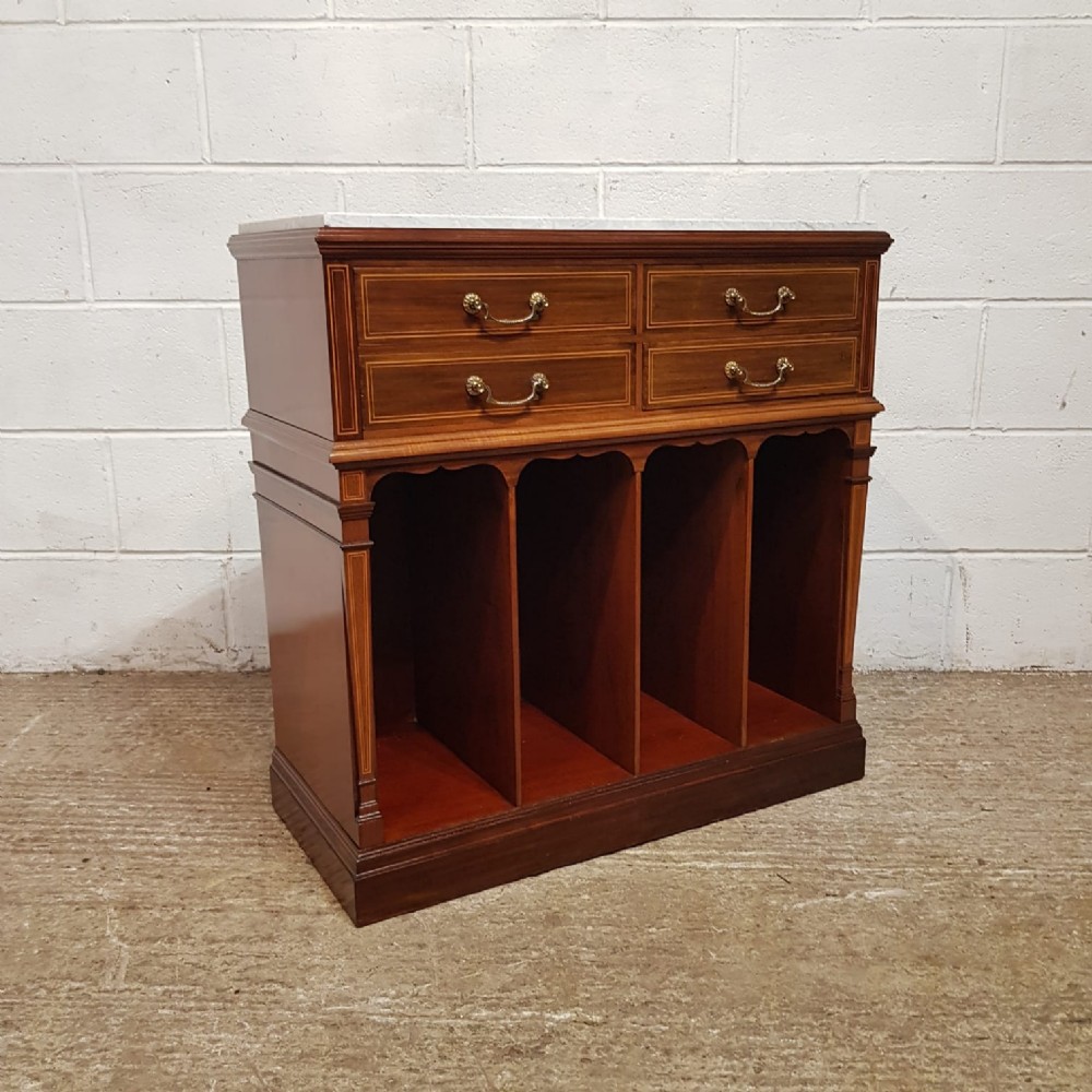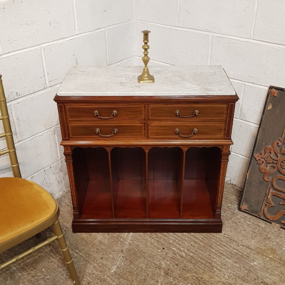 An Edwardian Mahogany side cabinet by Collinson and Lock of London and dating from around 1900. This beautiful side cabinet has an inset marble top and moulded edge to the top. It has two small drawers above a further two small drawers all of which are mahogany lined with original brass handles and satinwood strung drawer fronts. It is moulded underneath the drawers and then four open compartments. Down the side of the front is a tapered strung column. Its moulded around the bottom and stands on a plinth base.