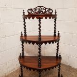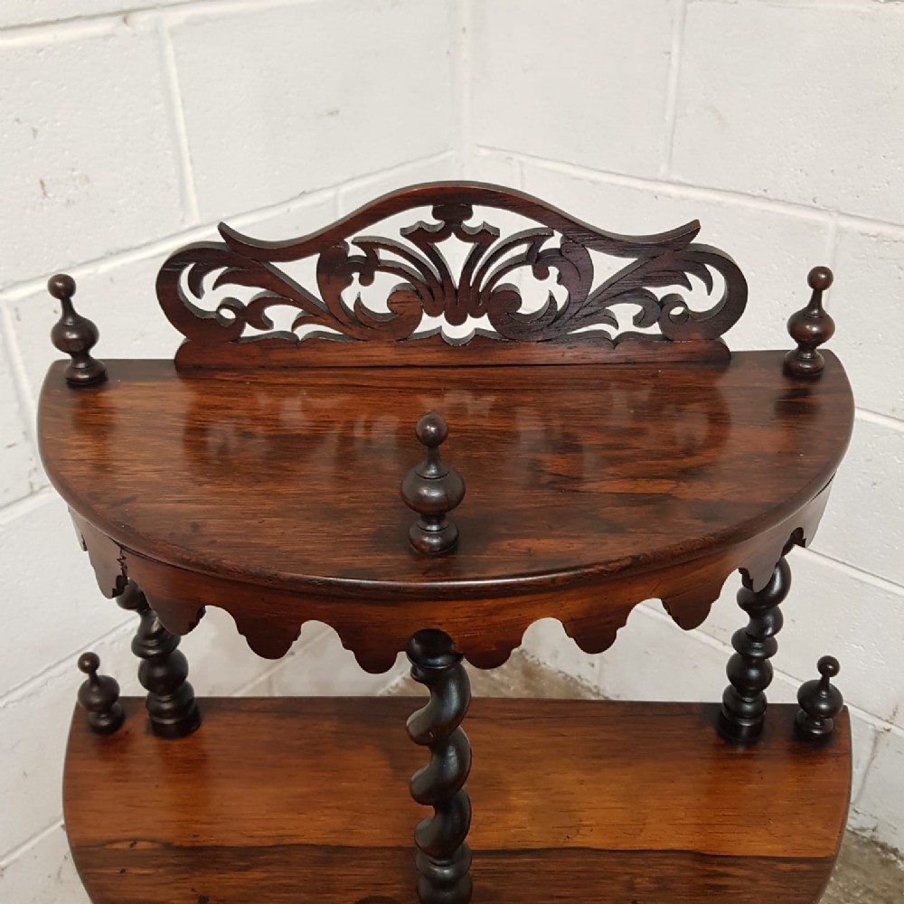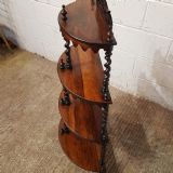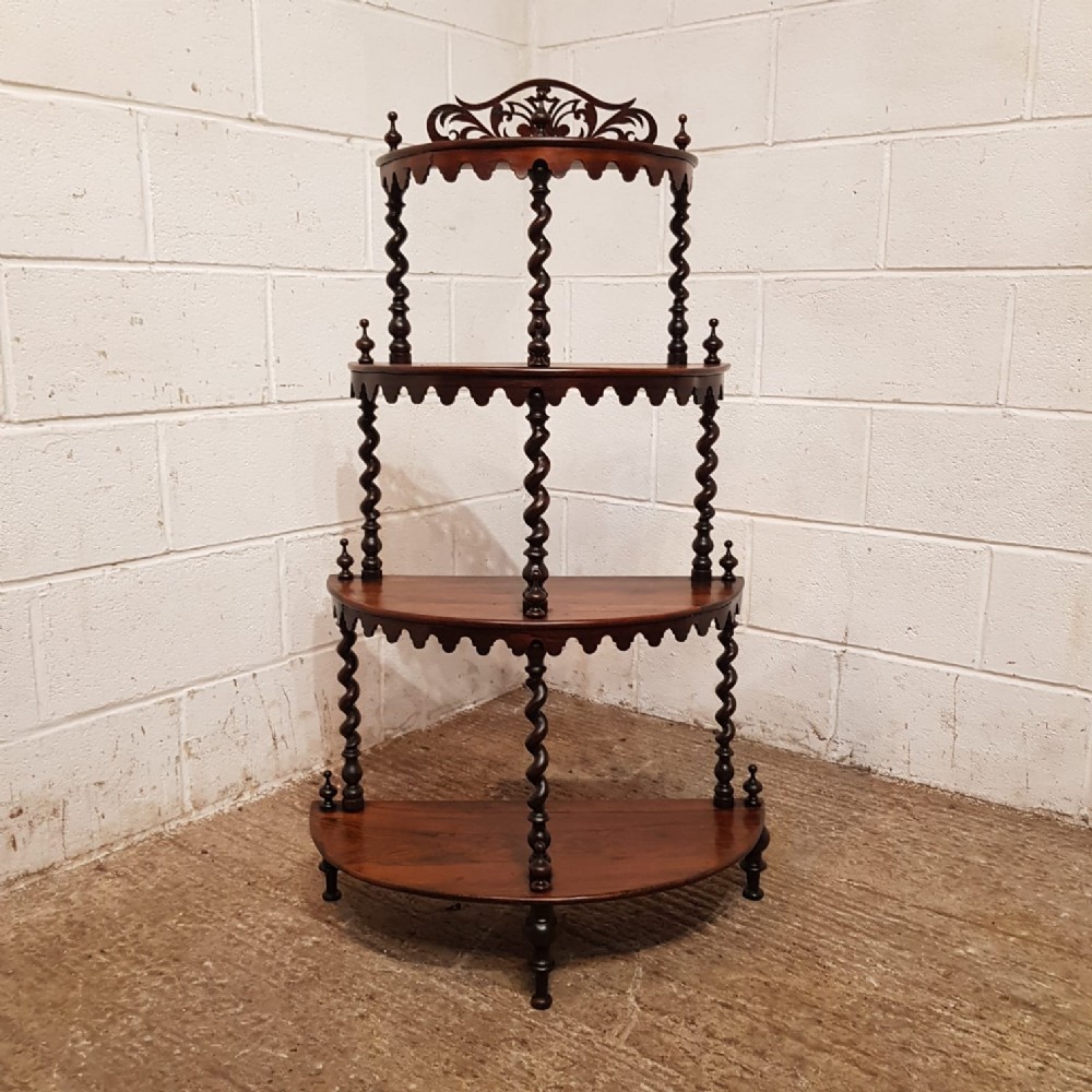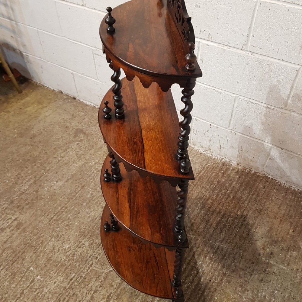 A Victorian Rosewood Demi Lune shaped Wot Not and dating from around 1880. This lovely Rosewood Wot Not has four graduating shelves on turned supports with finials above. There is a shaped frieze under each shelf, the top shelf has a carved and pierced raised back and it stands on turned feet.