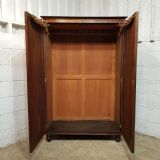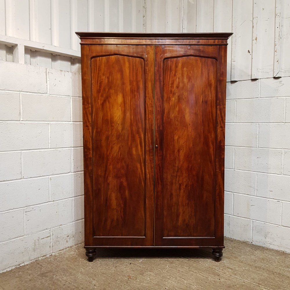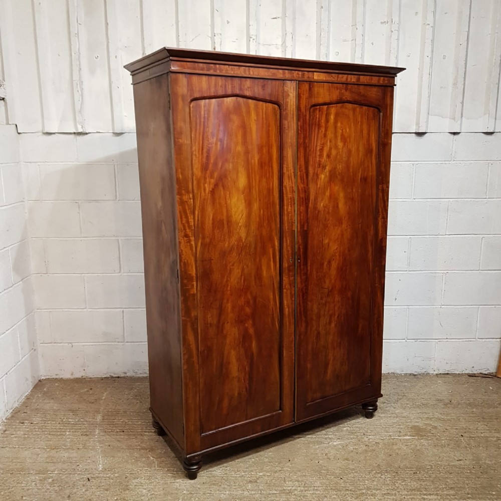 A Regency Mahogany double wardrobe and dating from around 1810. This original piece has a moulded cornice with a lip underneath. Two large doors to the front and each has a long arched top, moulded panel and original brass handles and door divider with a key. Inside is a brass rail and original wooden hanging pegs inside. It is moulded around the bottom and stands on turned feet.