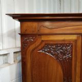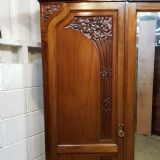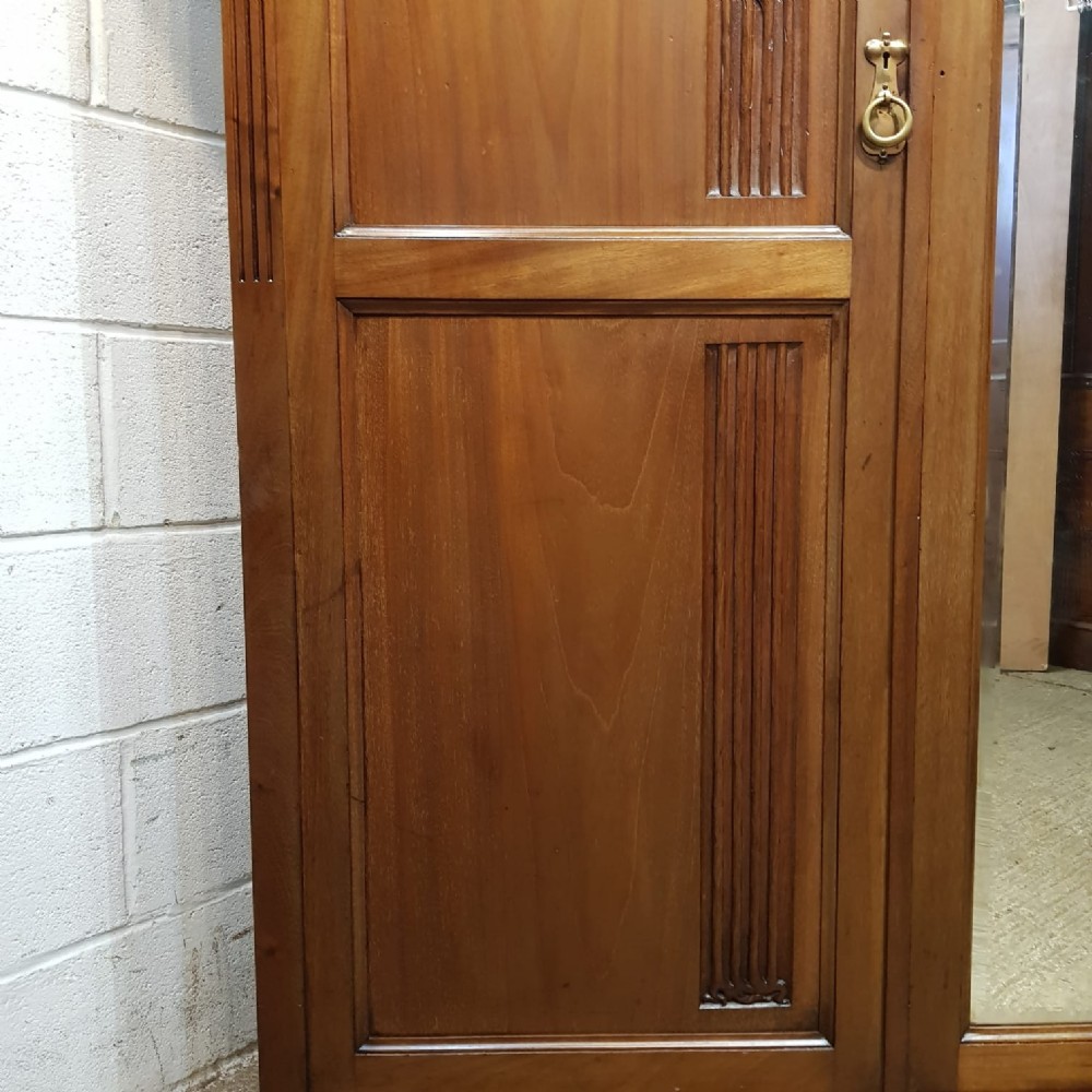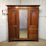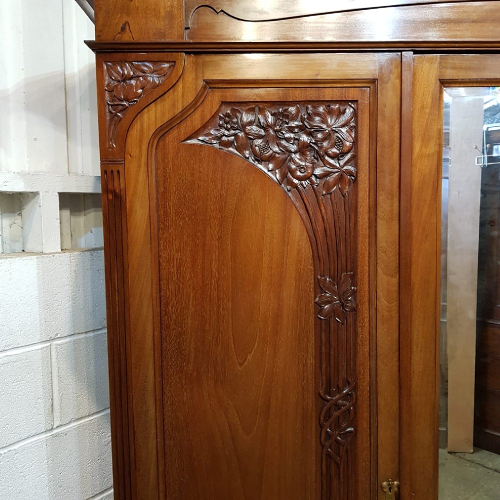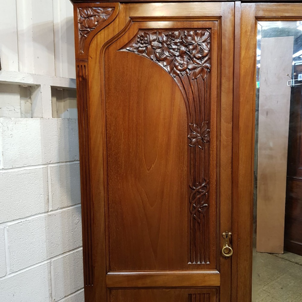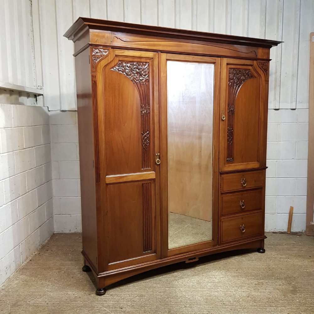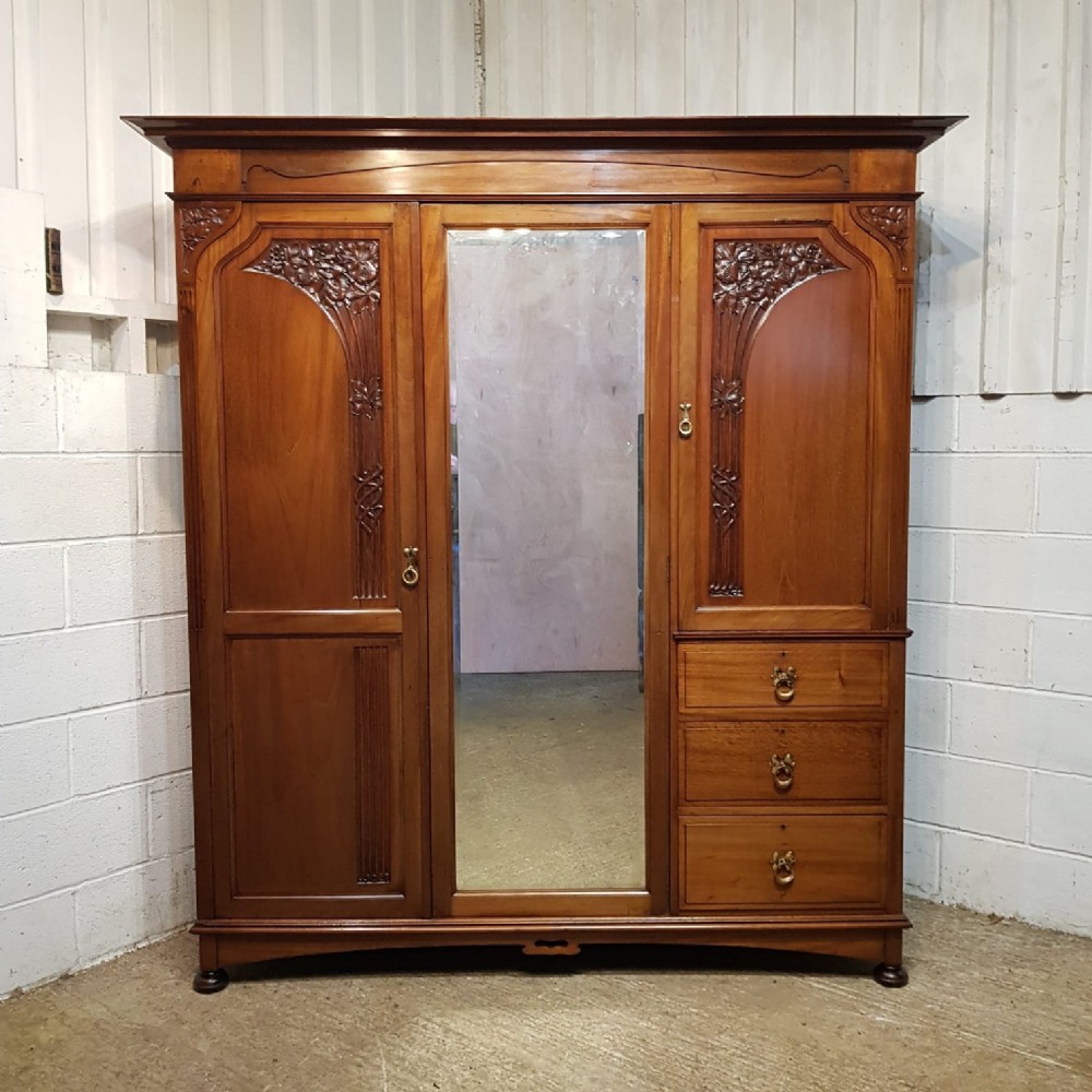 An Art Nouveau Mahogany triple wardrobe and dating from around 1900. This beautifully designed wardrobe has a flared moulded cornice with a wide frieze lip underneath. It has a central mirrored door in very good condition. The door on the left has a carved and moulded panel to the top with a moulded and carved panel underneath and original brass handle. Behind these two doors is a shelf with a rail underneath and on the right is a short door with the same carved panel as the top left also with original brass handle and a rail inside. Underneath this door are three graduating Ash lined drawers with original brass handles. The wardrobe is moulded around the bottom and sits on a plinth on bun feet. It separates into six pieces for ease of movement.
