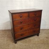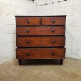 A Victorian Mahogany 4 height chest of drawers and dating from around 1880. This original Victorian chest of drawers has a carved edge to the top, with two short drawers over three long graduating drawers, all of which are Oak lined with original knob handles. It is carved around the bottom and stands on ring turned legs.