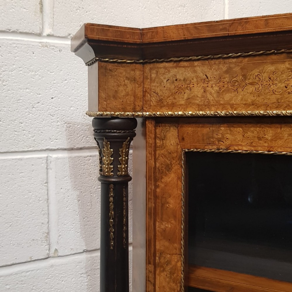 A Victorian Burr Walnut Credenza and dating from around 1880. This fine example and all original Credenza has a Satinwood strung edge to the top with a wide inlaid lip underneath. It features a central door with a Gilt metal mounted inlaid oval to the centre and in a gilt metal mounted panel. It has gilt mounted glazed doors to each side. All doors have original key with two shelves behind them. It has four embossed columns with gilt metal acanthus leaves to the top. It stands on a gilt metal mounted plinth base on turned feet. Both ends are also strung in Satinwood and gilt metal mounted.