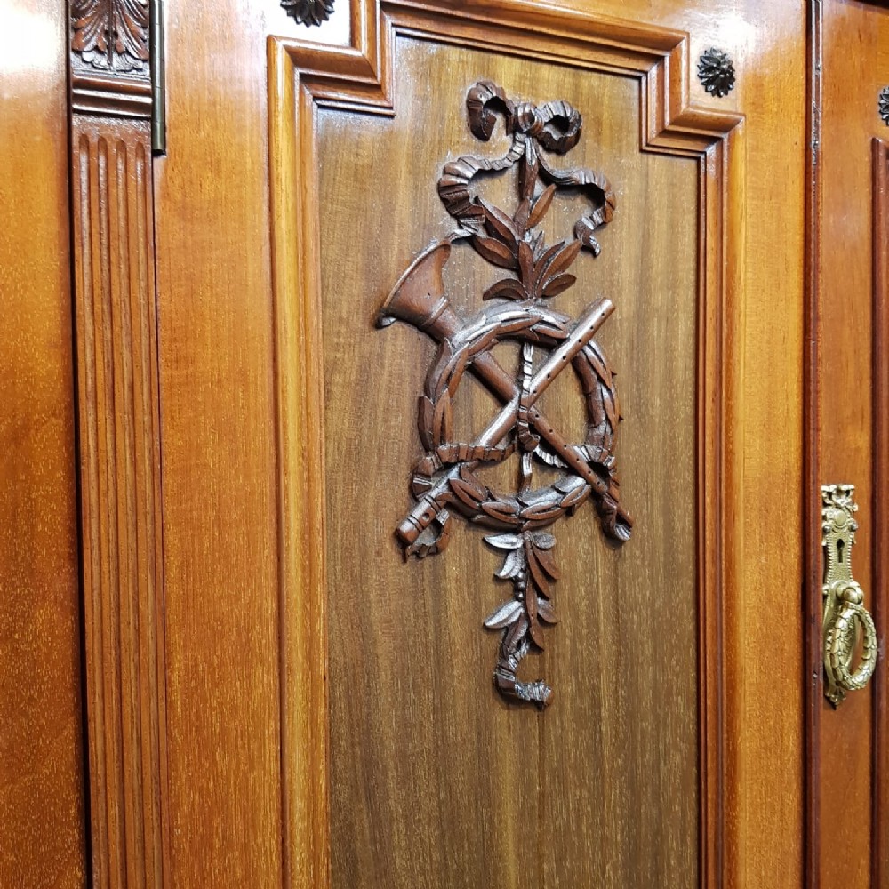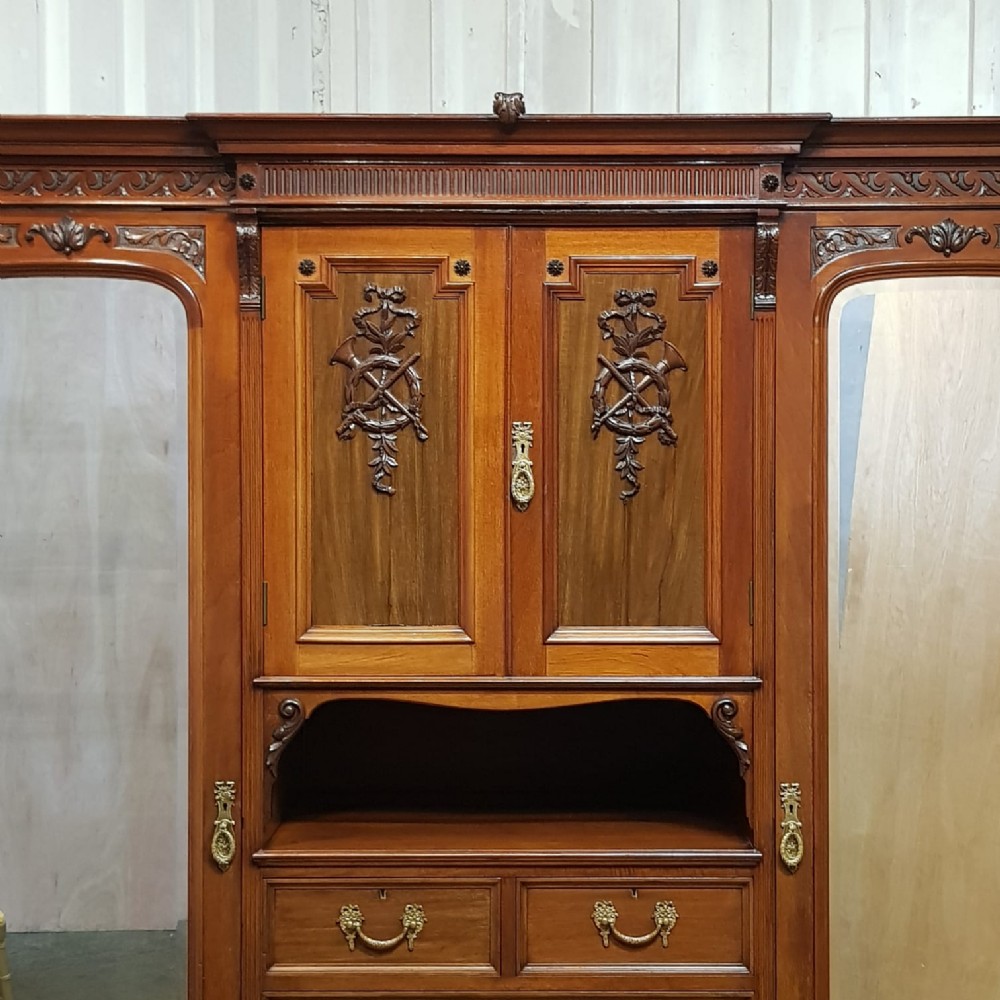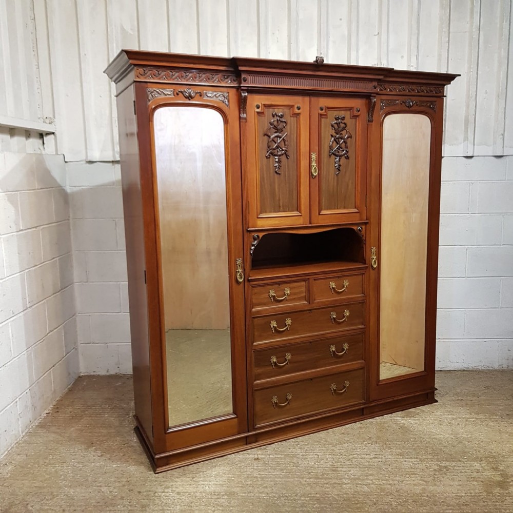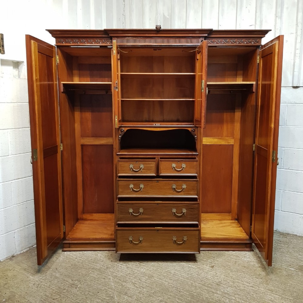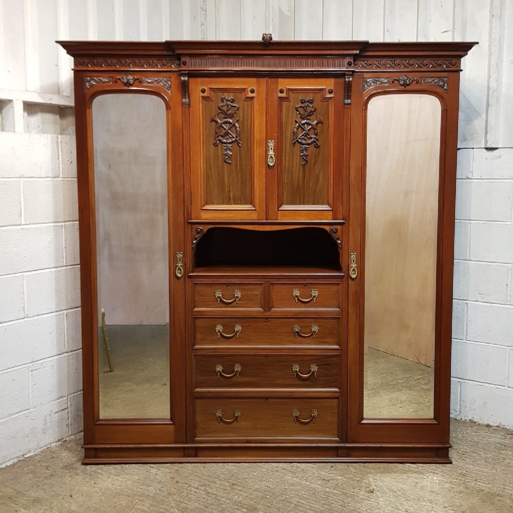 A late Victorian Mahogany triple wardrobe and dating from around 1900. This wonderful example has a moulded cornice with a carved lip underneath. It features mirrored doors to both ends and they have a small carved panel to the top of each mirror and both having original brass handles. Inside of both is a shelf with a hanging rail under. To the centre of both doors is two small doors both of which have a moulded panel with carved laurel and instruments to the centre and original brass handles with two shelves inside. Under this is an open compartment followed by two short over three long graduating drawers, all of which are Mahogany lined with original brass handles. The wardrobe stands on a moulded plinth and separates into seven pieces for ease of movement.