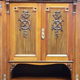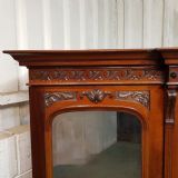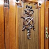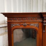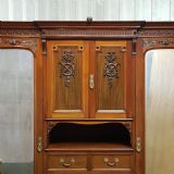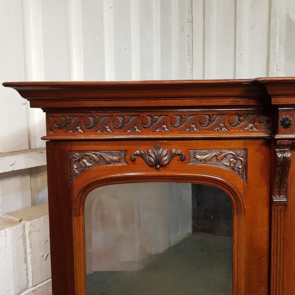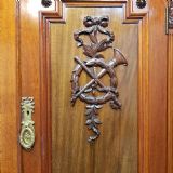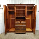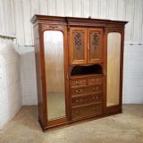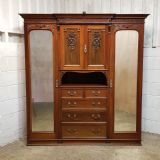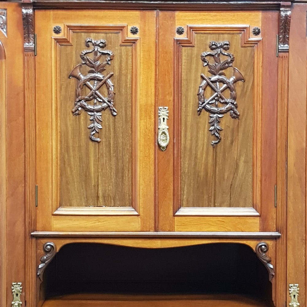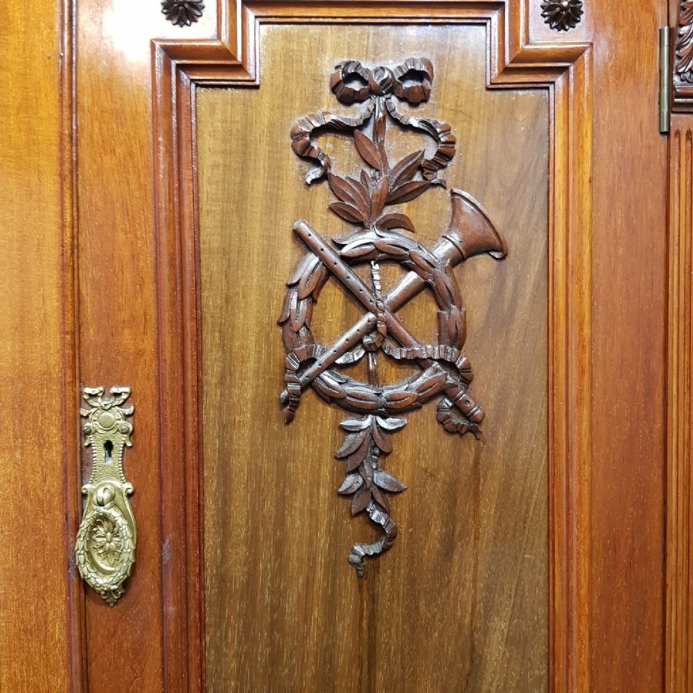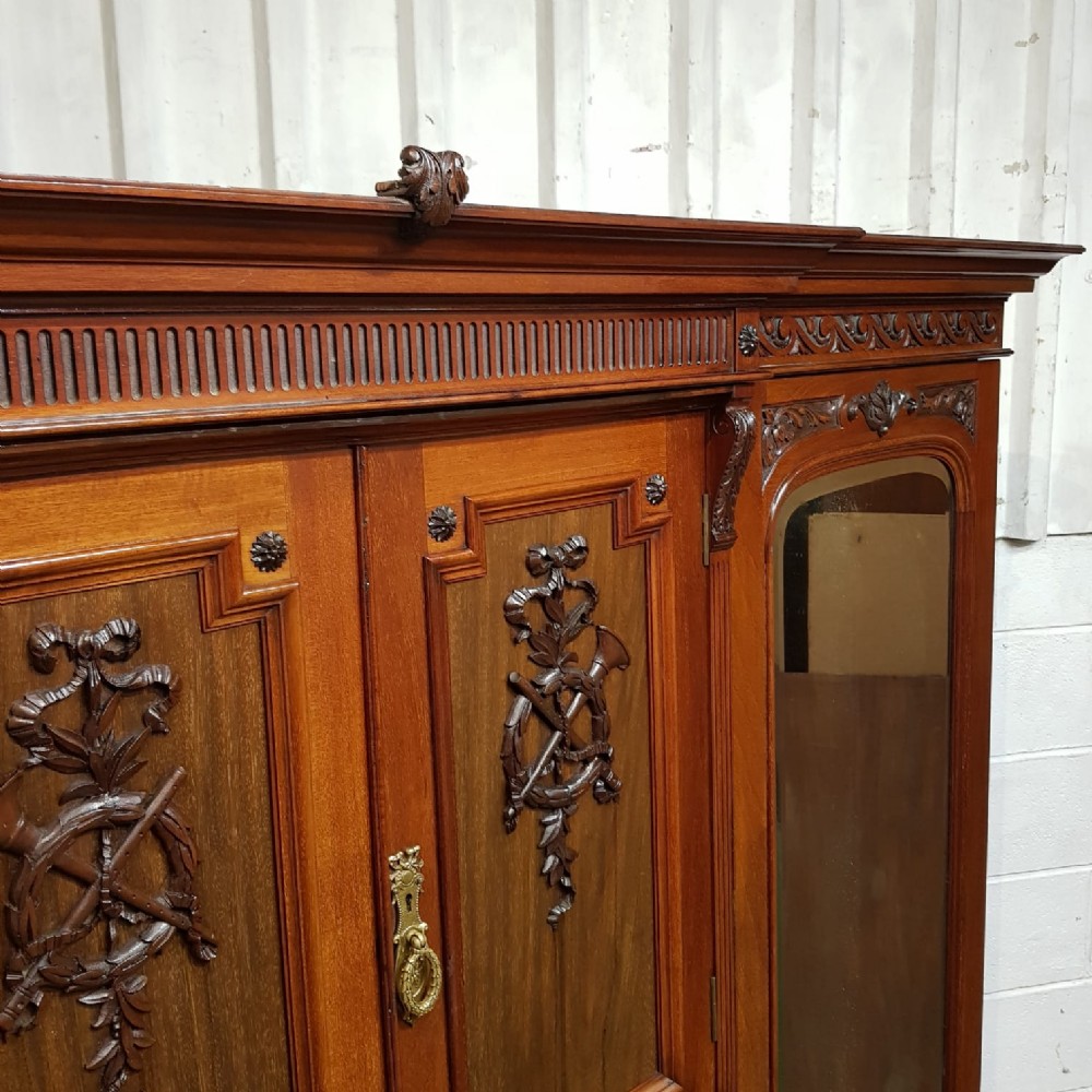 A late Victorian Mahogany triple wardrobe and dating from around 1900. This wonderful example has a moulded cornice with a carved lip underneath. It features mirrored doors to both ends and they have a small carved panel to the top of each mirror and both having original brass handles. Inside of both is a shelf with a hanging rail under. To the centre of both doors is two small doors both of which have a moulded panel with carved laurel and instruments to the centre and original brass handles with two shelves inside. Under this is an open compartment followed by two short over three long graduating drawers, all of which are Mahogany lined with original brass handles. The wardrobe stands on a moulded plinth and separates into seven pieces for ease of movement.