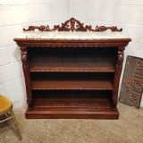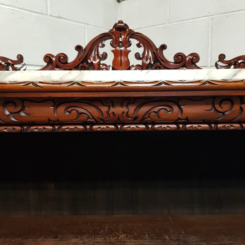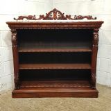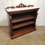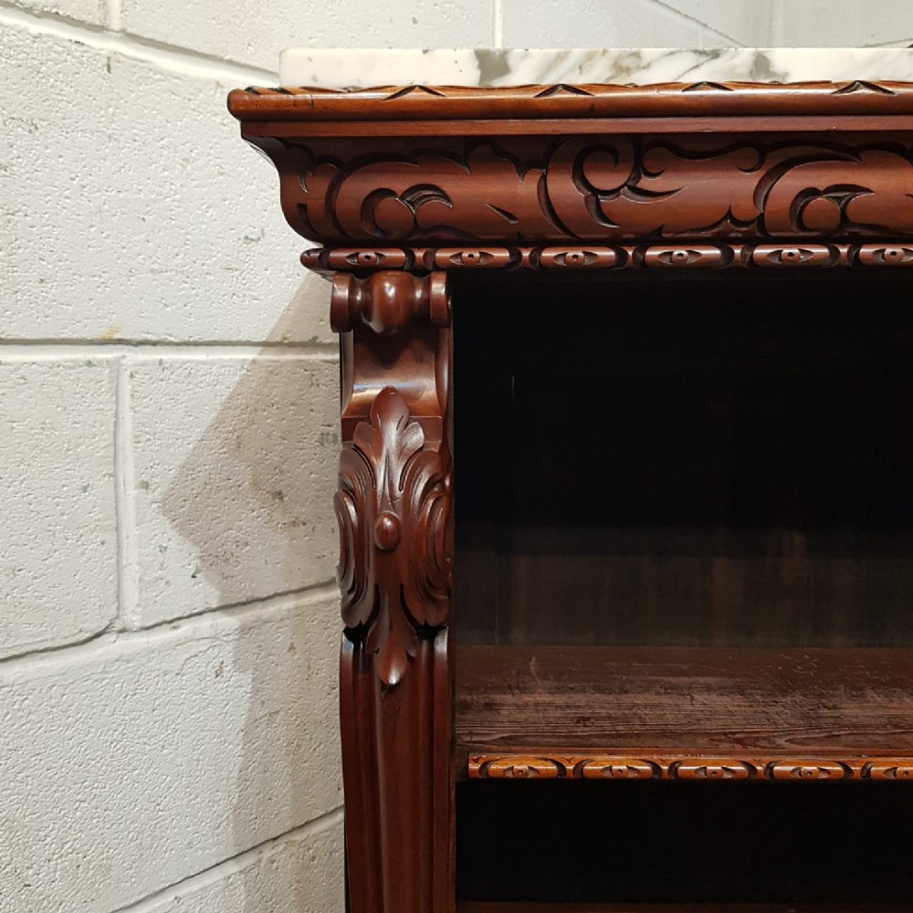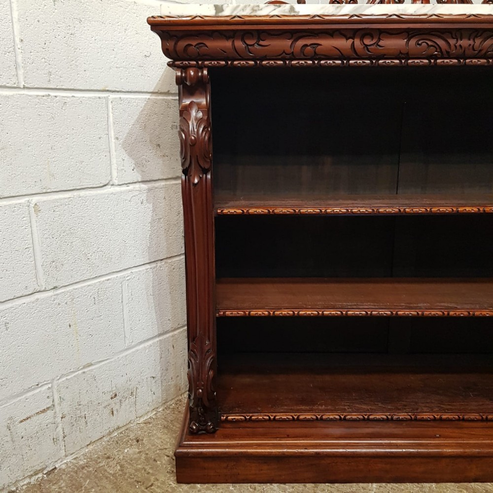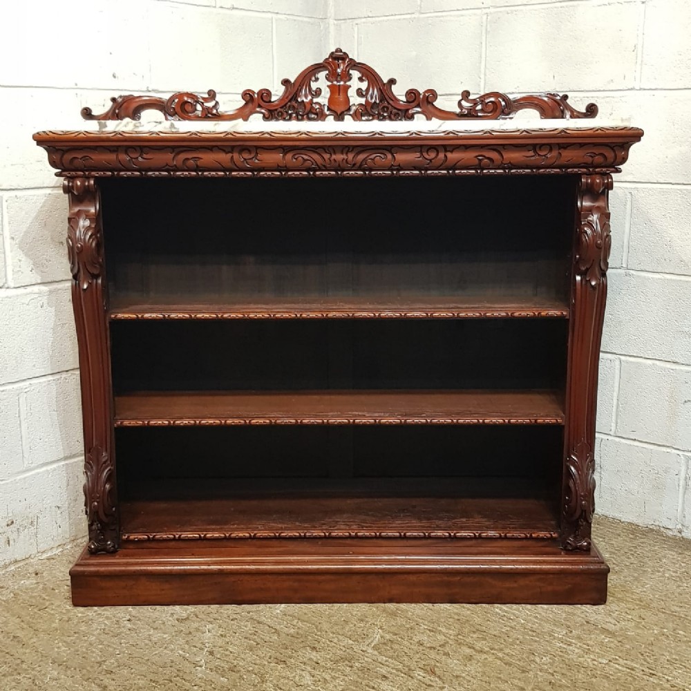 A Victorian Mahogany Marble topped open bookcase and dating from around 1880. This superb open bookcase has a Marble top, with a pierced and carved gallery back. The top also has a carved edge, with a carved conclave lip underneath. To each end is a carved column. It has two original fully adjustable shelves with carved edge. It is moulded around the bottom and stands on a plinth base.