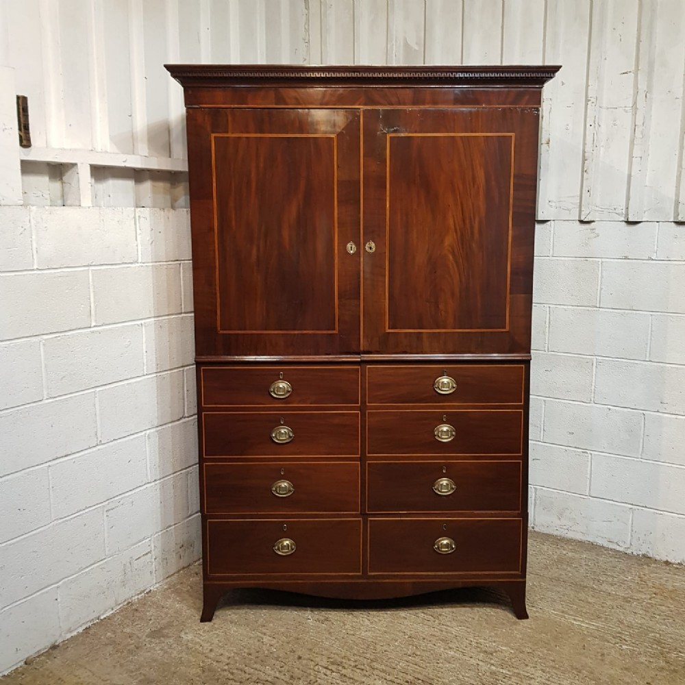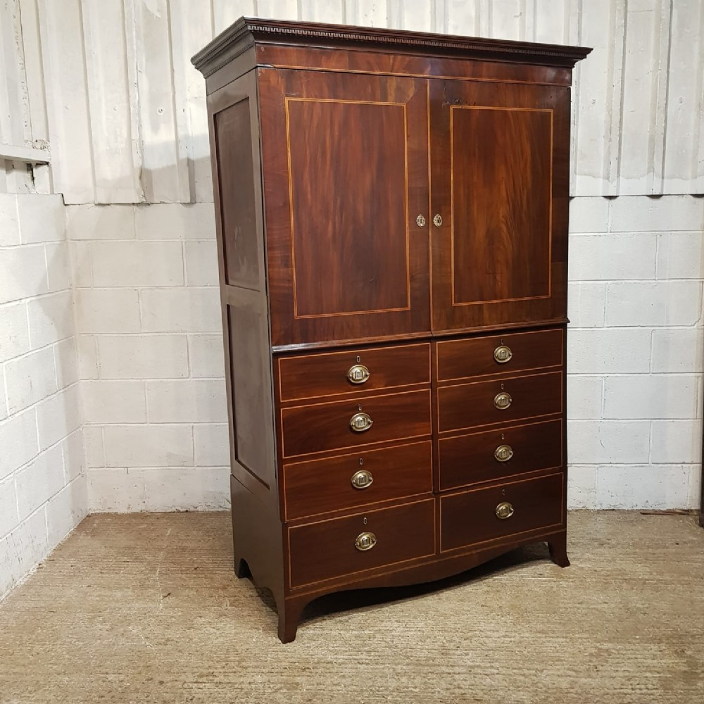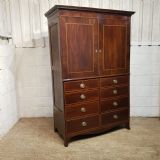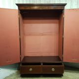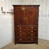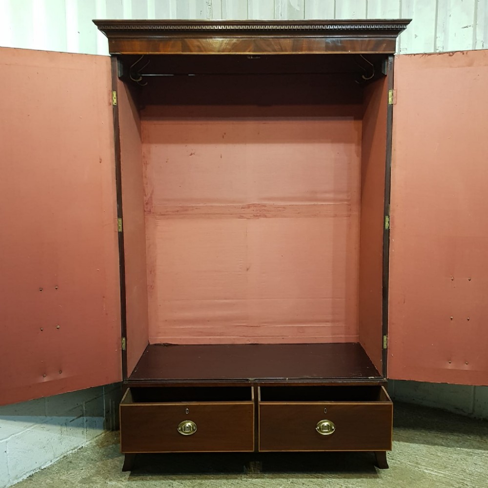 A Regency Mahogany campaign wardrobe and dating from around 1810. This wonderful example has a moulded cornice with Greek key moulding and cross banded lip underneath with a satinwood strung bottom edge. Both doors have a satinwood strung panel and these are above 3 dummy drawer fronts, which have original brass handles and satinwood strung drawer fronts. The main doors have brass escutheons and a key and inside is a hanging rail and hooks. The base has two deep drawers, pine lined with original brass handles and satinwood strung edge to the drawer fronts. It stands on splayed bracket feet with a shaped frieze between. It flat packs for ease of movement.