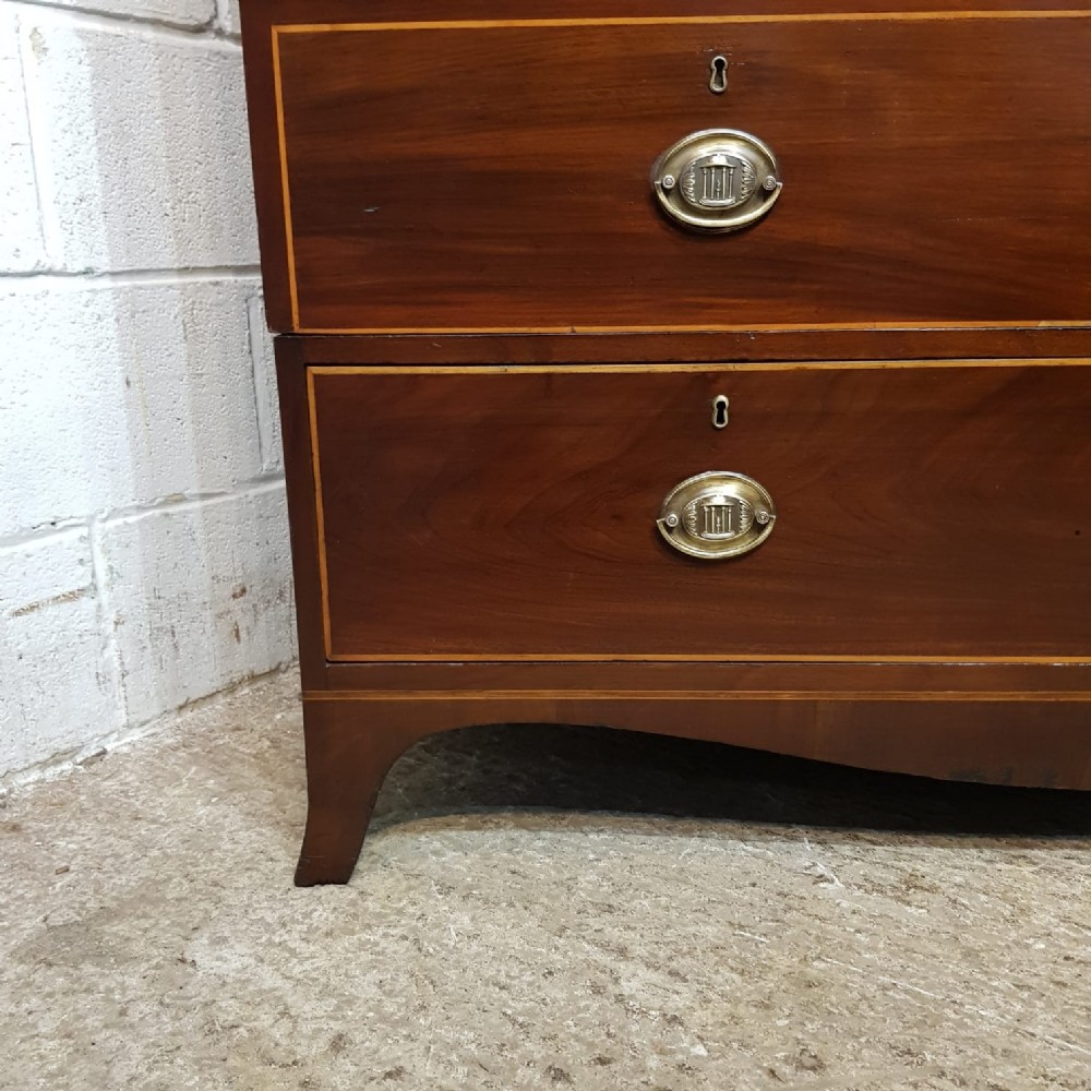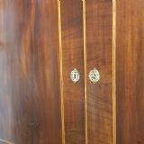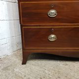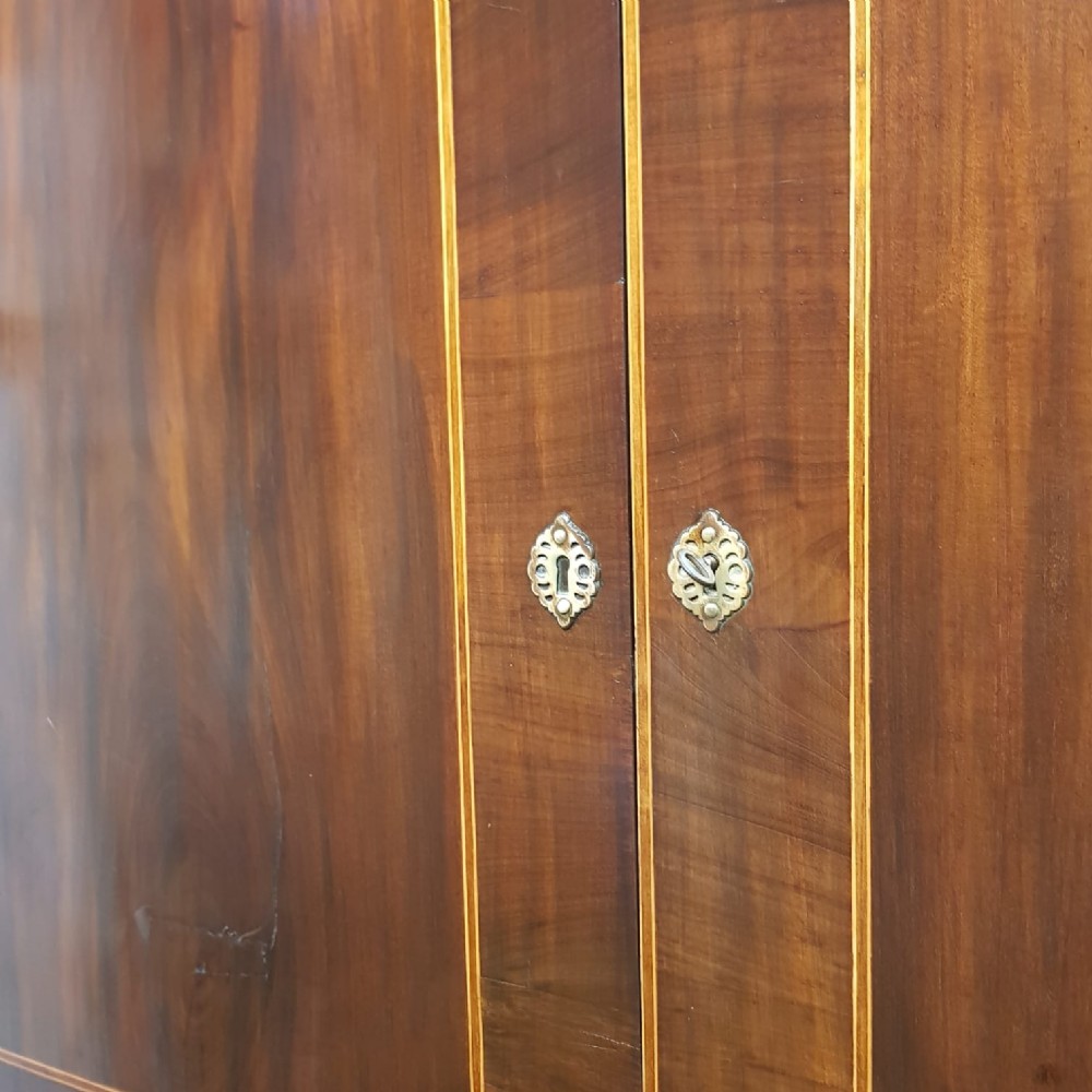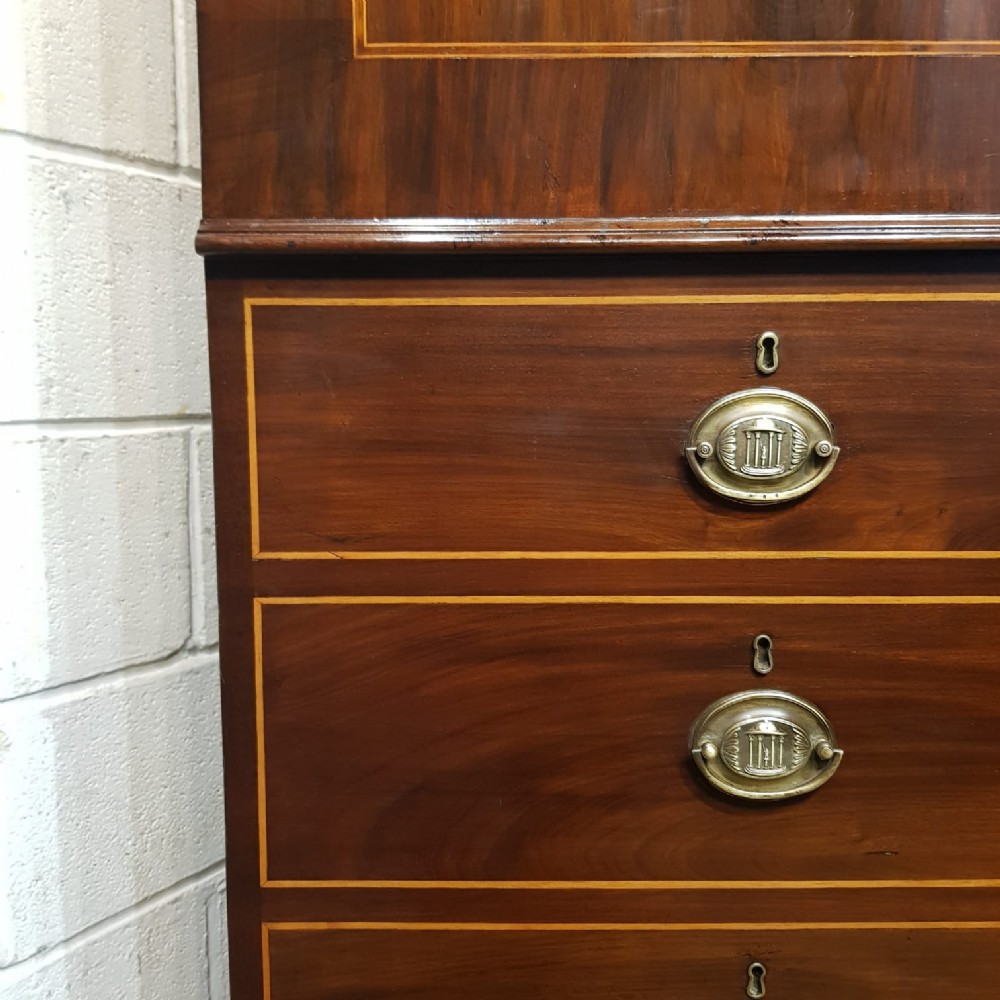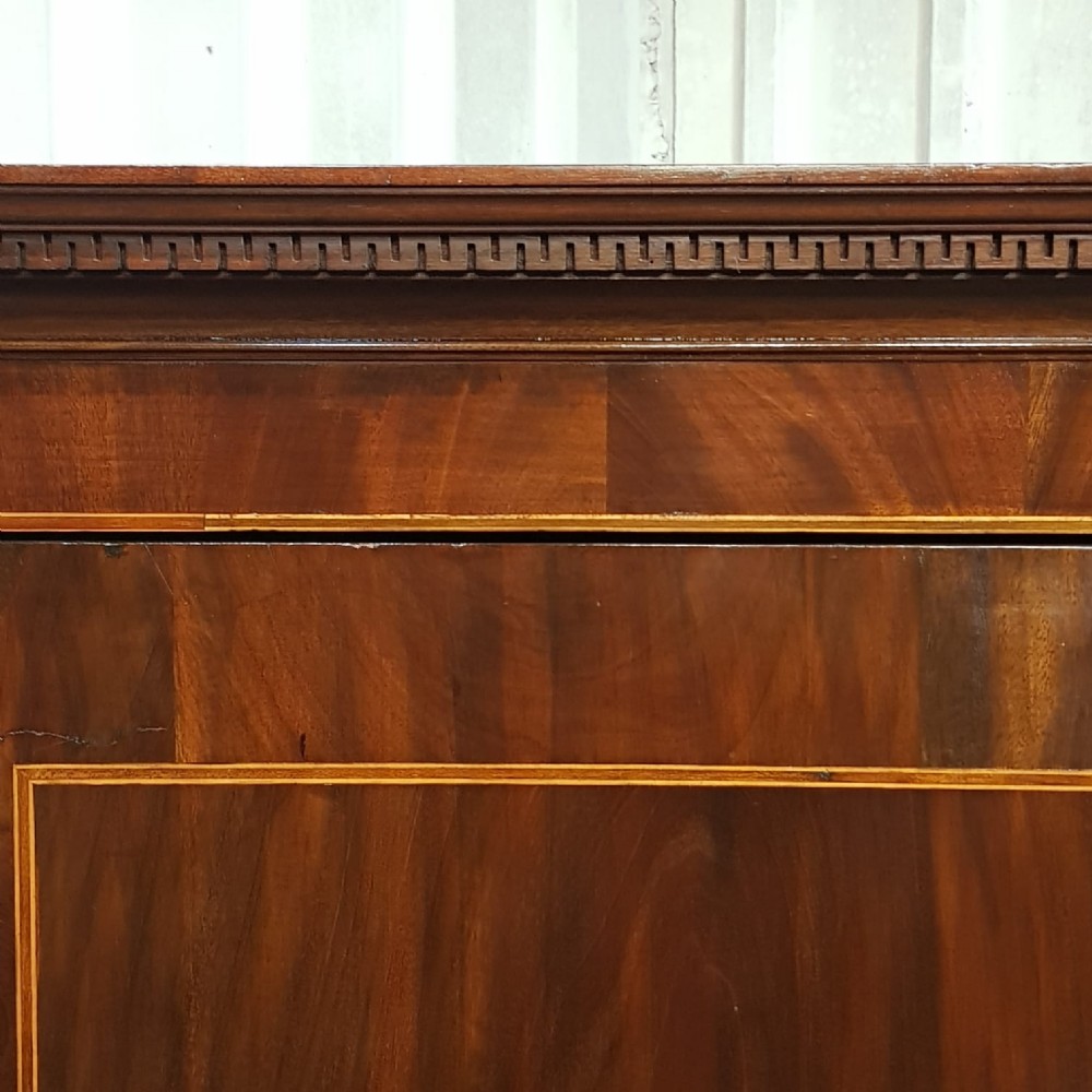 A Regency Mahogany campaign wardrobe and dating from around 1810. This wonderful example has a moulded cornice with Greek key moulding and cross banded lip underneath with a satinwood strung bottom edge. Both doors have a satinwood strung panel and these are above 3 dummy drawer fronts, which have original brass handles and satinwood strung drawer fronts. The main doors have brass escutheons and a key and inside is a hanging rail and hooks. The base has two deep drawers, pine lined with original brass handles and satinwood strung edge to the drawer fronts. It stands on splayed bracket feet with a shaped frieze between. It flat packs for ease of movement.
