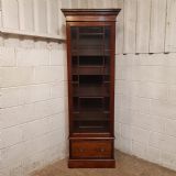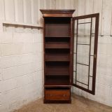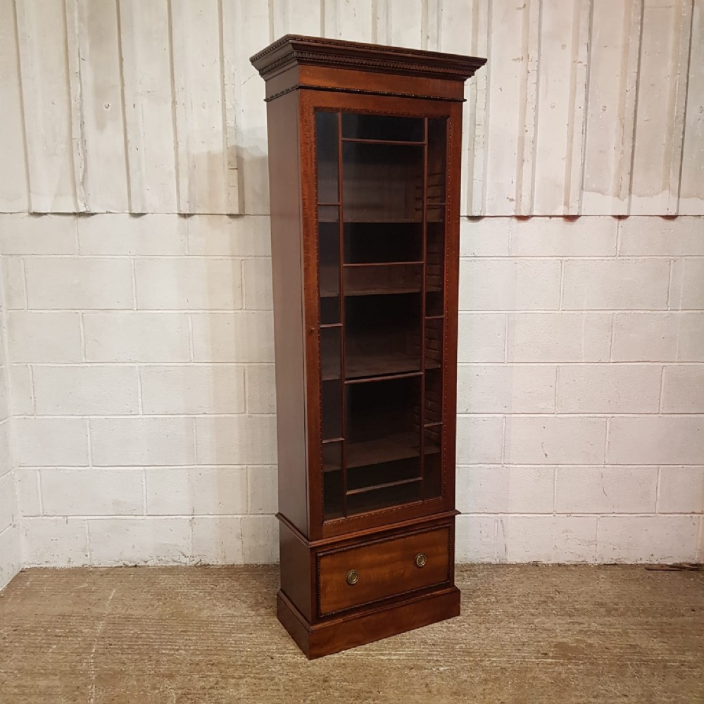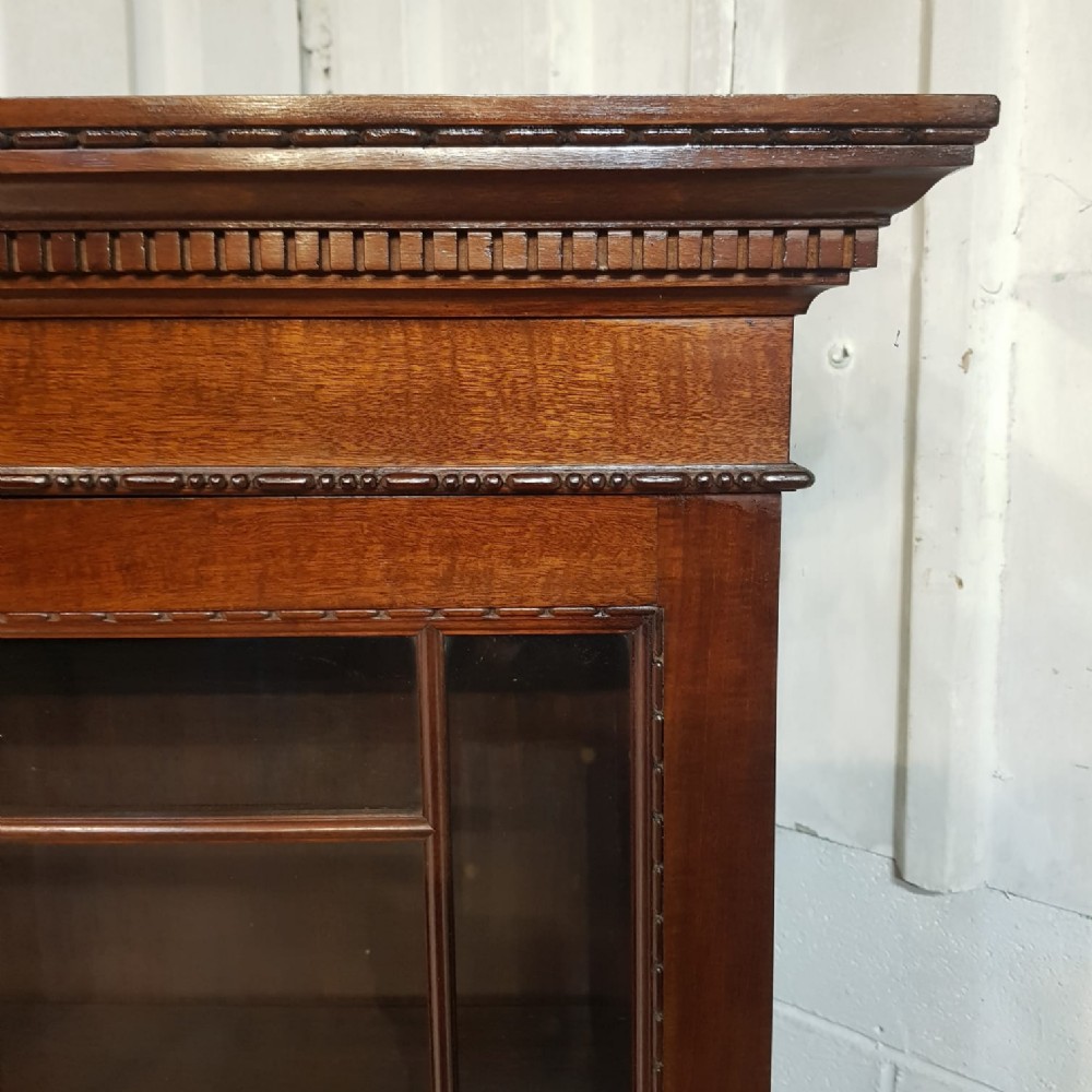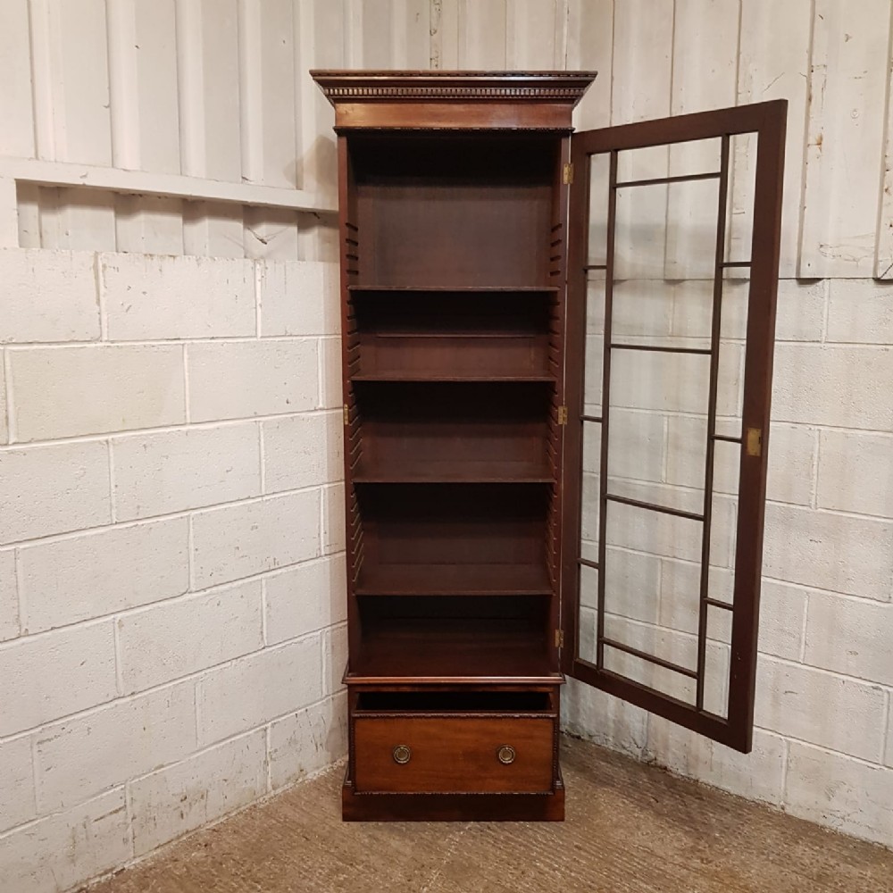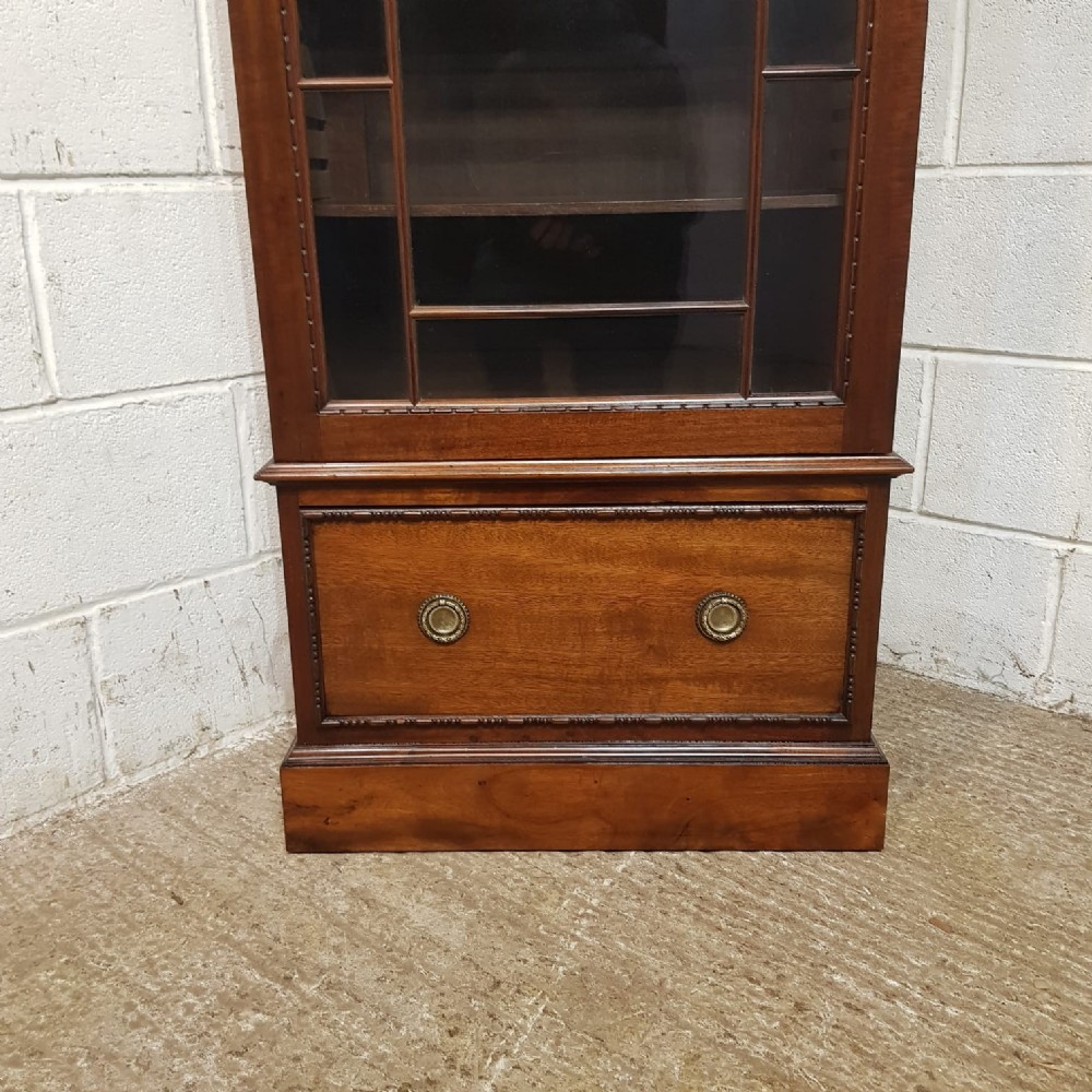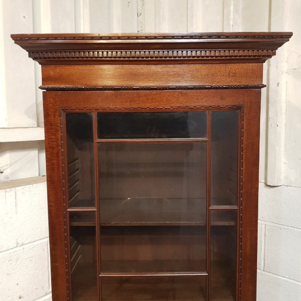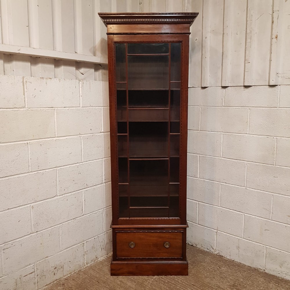 A tall Mahogany glazed antique bookcase and dating from around 1900. This lovely narrow bookcase features a cornice dental and carved moulding with a wide lip underneath. It has a single door with glazed panels with carved mouldings and key. Inside are four original and fully adjustable shelves. Under the door is a deep Mahogany lined drawer with original Brass handles with a carved moulded edge to the drawer front. It stands on a plinth base.