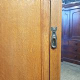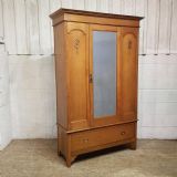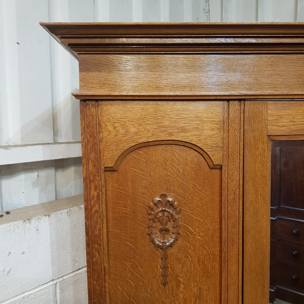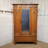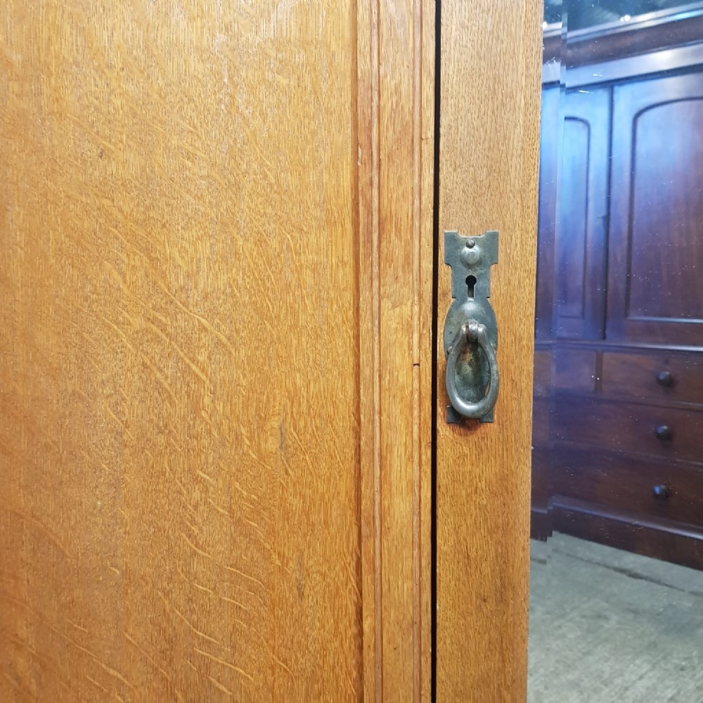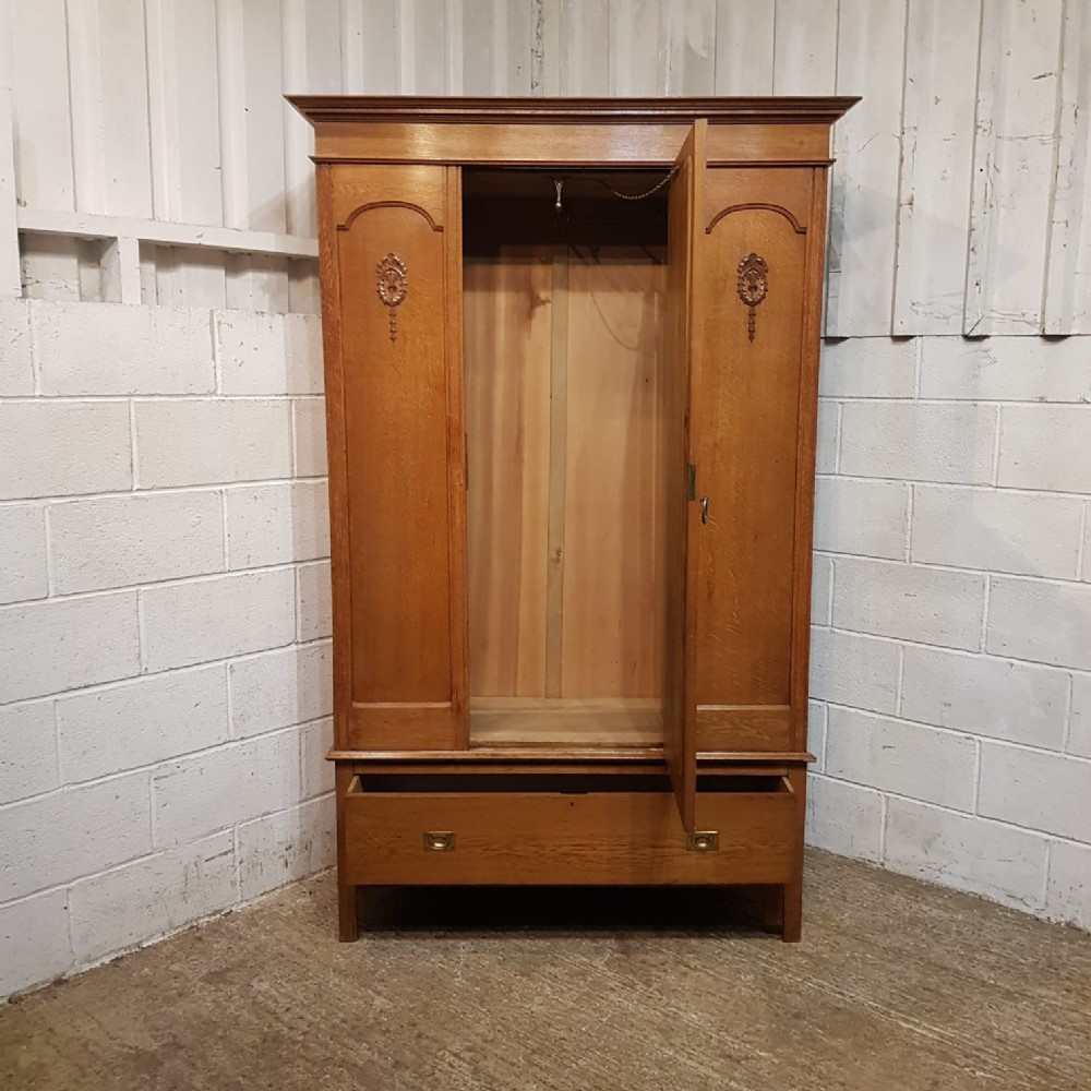 An Edwardian Arts & Crafts Oak wardrobe and dating from around 1900. This wardrobe has a moulded cornice with a wide lip underneath. It has a central mirror door with original handles and a rail inside. To each side is an arched top moulded panel with a carved motif to the top. The base has a long deep drawer which is Oak lined with original Brass handles. The wardrobe stands on styled feet and separates for ease of movement.