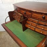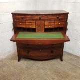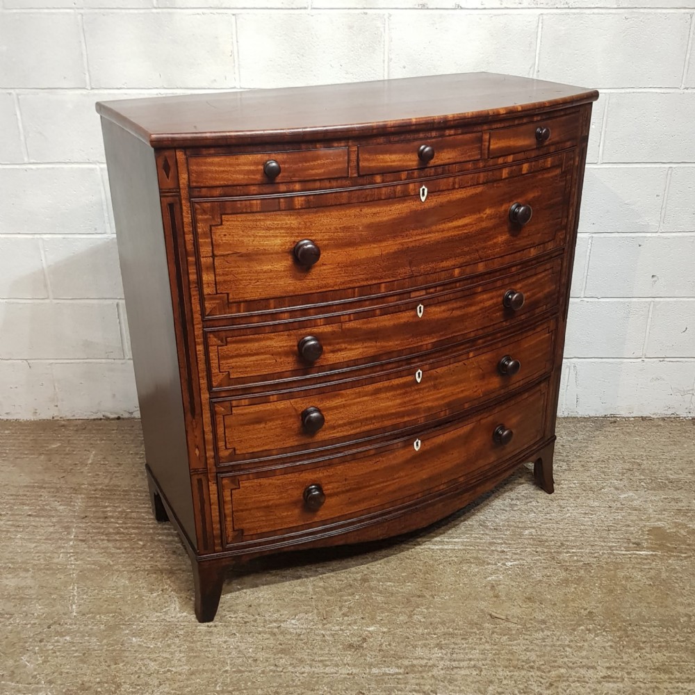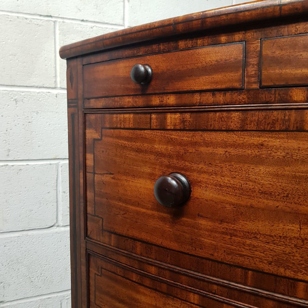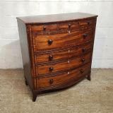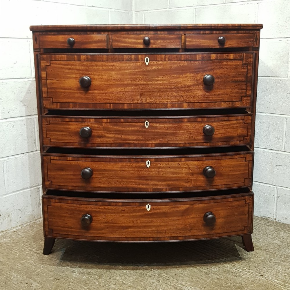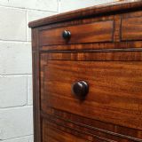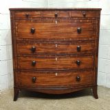 A Victorian Bow fronted Mahogany with Ebony string secretaire chest of drawers and dating from around 1850. This beautiful piece has a rounded edge to the top with three small drawers underneath. Following this is a long deep drawer which the front drops to reveal the secretaire. Inside is a small door to the centre with an inlaid shell on it and six drawers to each side with pigeon holes underneath and a baize writing surface. Under this are three long graduating drawers, all the drawers are pine lined with original knob handles and ivoreen escutcheons. The drawer fronts have a cross banded edge and are strung in ebony. It stands on a splayed bracket feet with a shaped frieze in between.