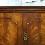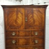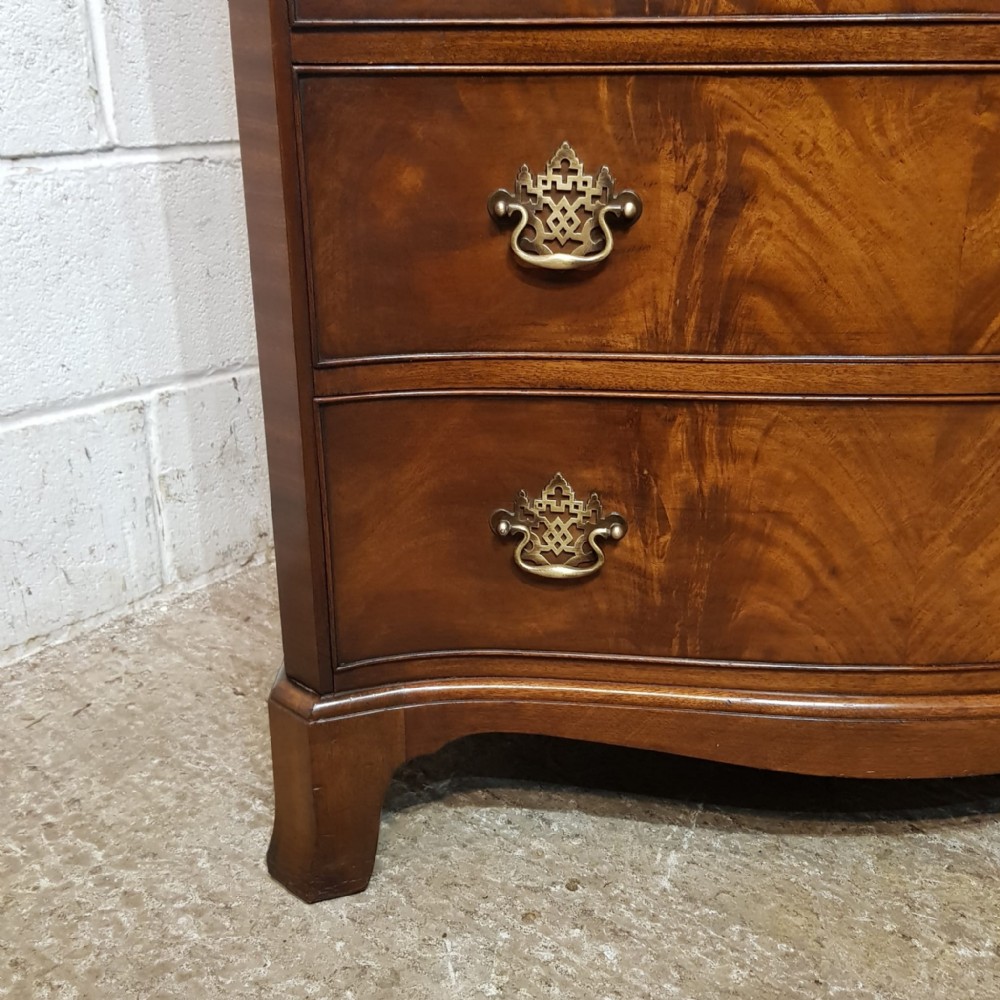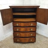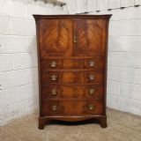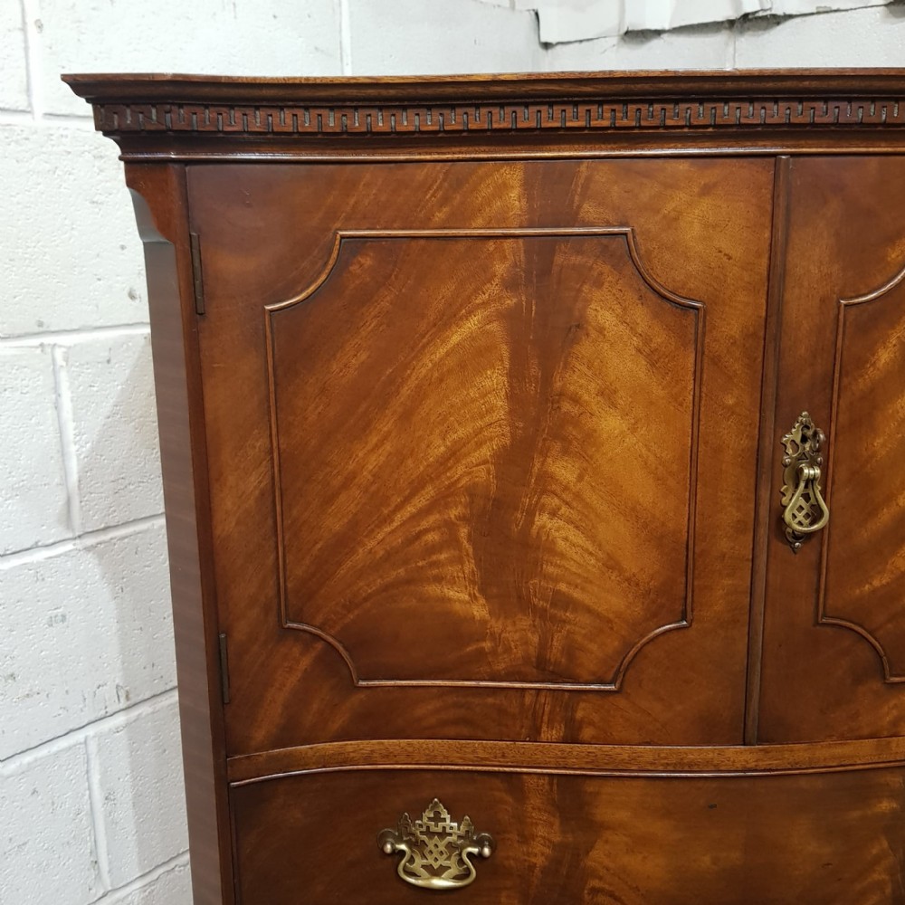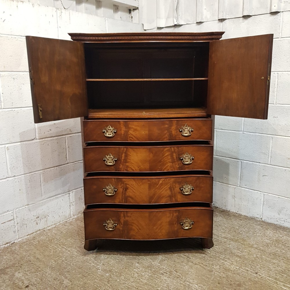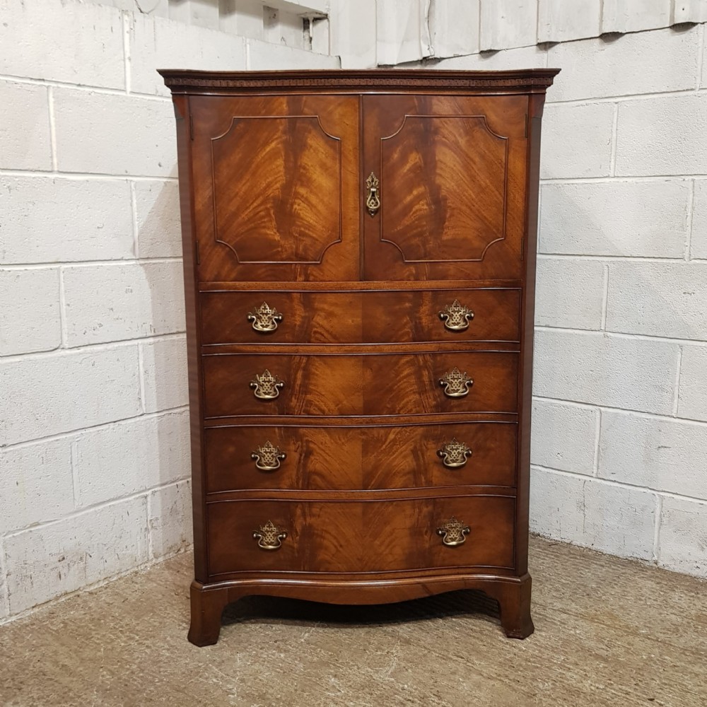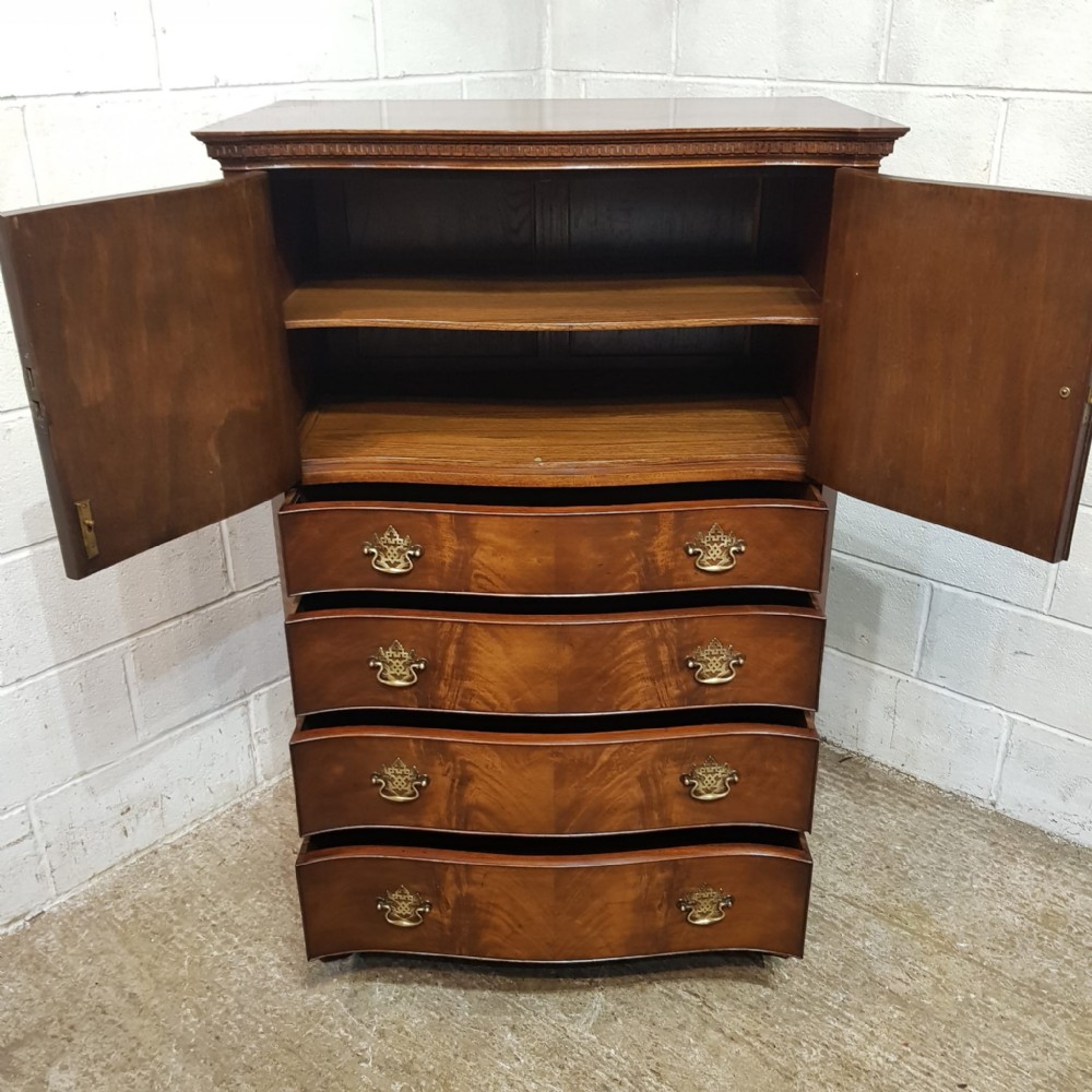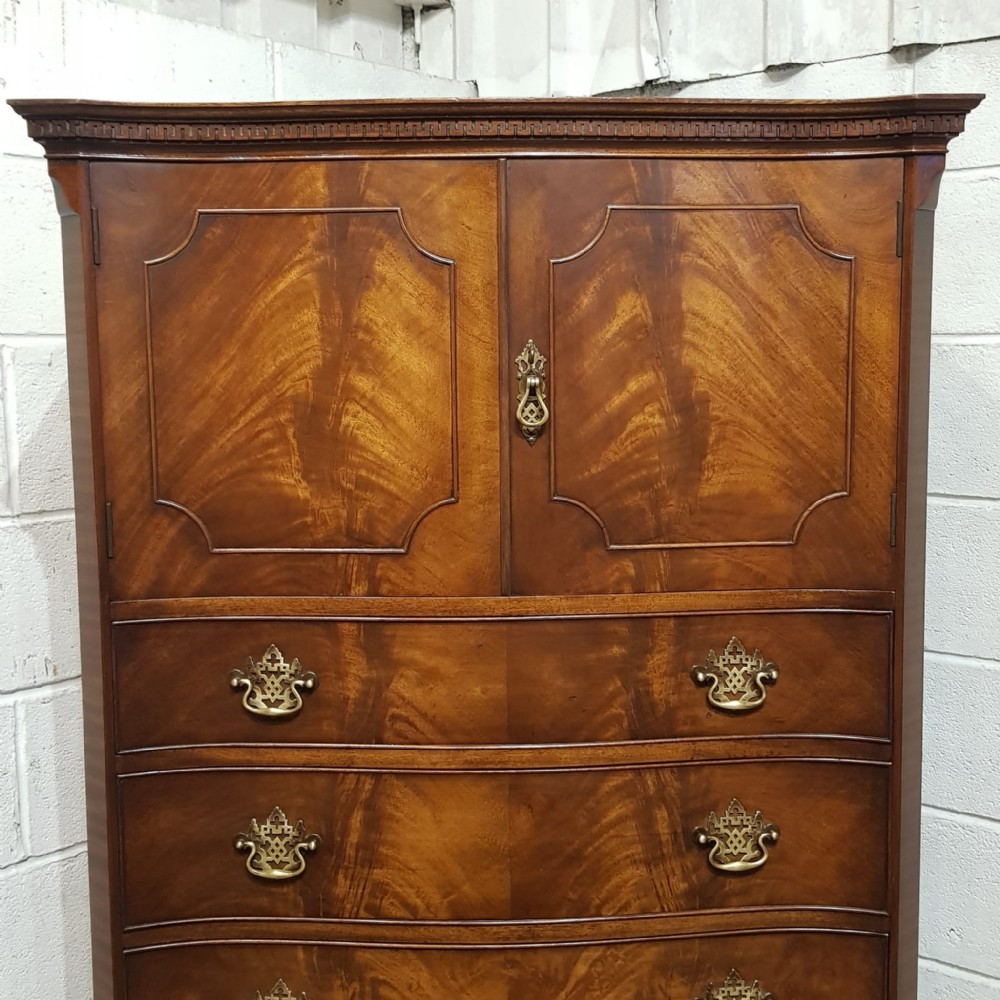 A Mahogany chippendale style serpentine front tall boy chest by Waring S Gillows and dating from around 1920. This original piece has a moulded and dental moulded edge to a polished top. It features two doors with original brass handles and key with a shelf inside. Below is four long graduating drawers, which are Mahogany lined with original brass handles. It is moulded around the bottom and stands on bracket feet.