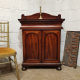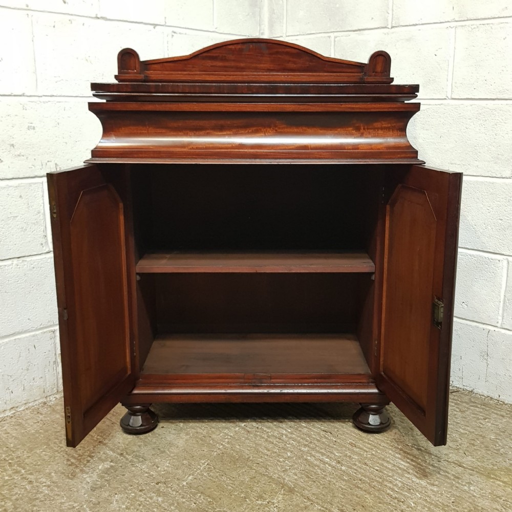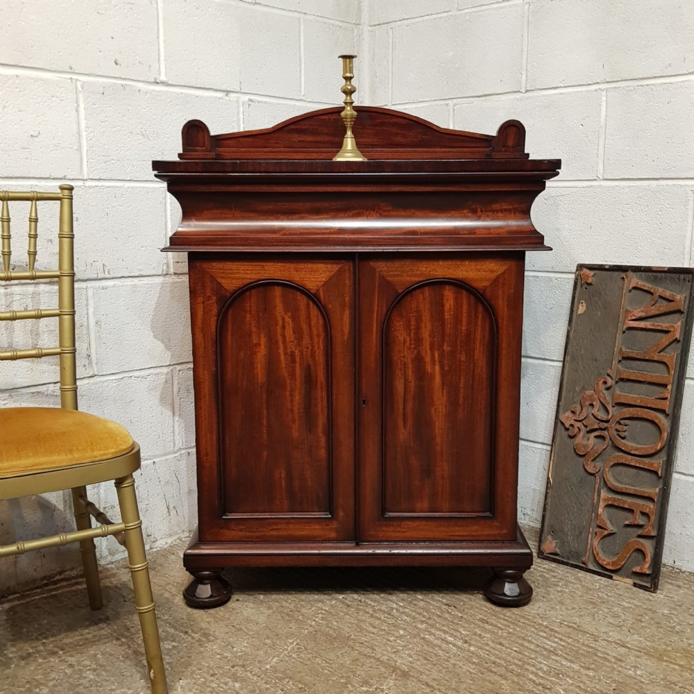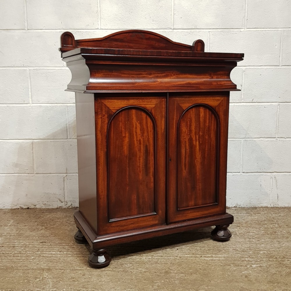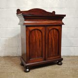 A small Mahogany William 4th chiffonier and dating from around 1830. This lovely chiffonier has a moulded low gallery back to the top with a moulded edge with a moulded frieze drawer underneath. It features two doors with an arched top and moulded panels with a shelf inside. It is moulded around the bottom and stands on turned feet.