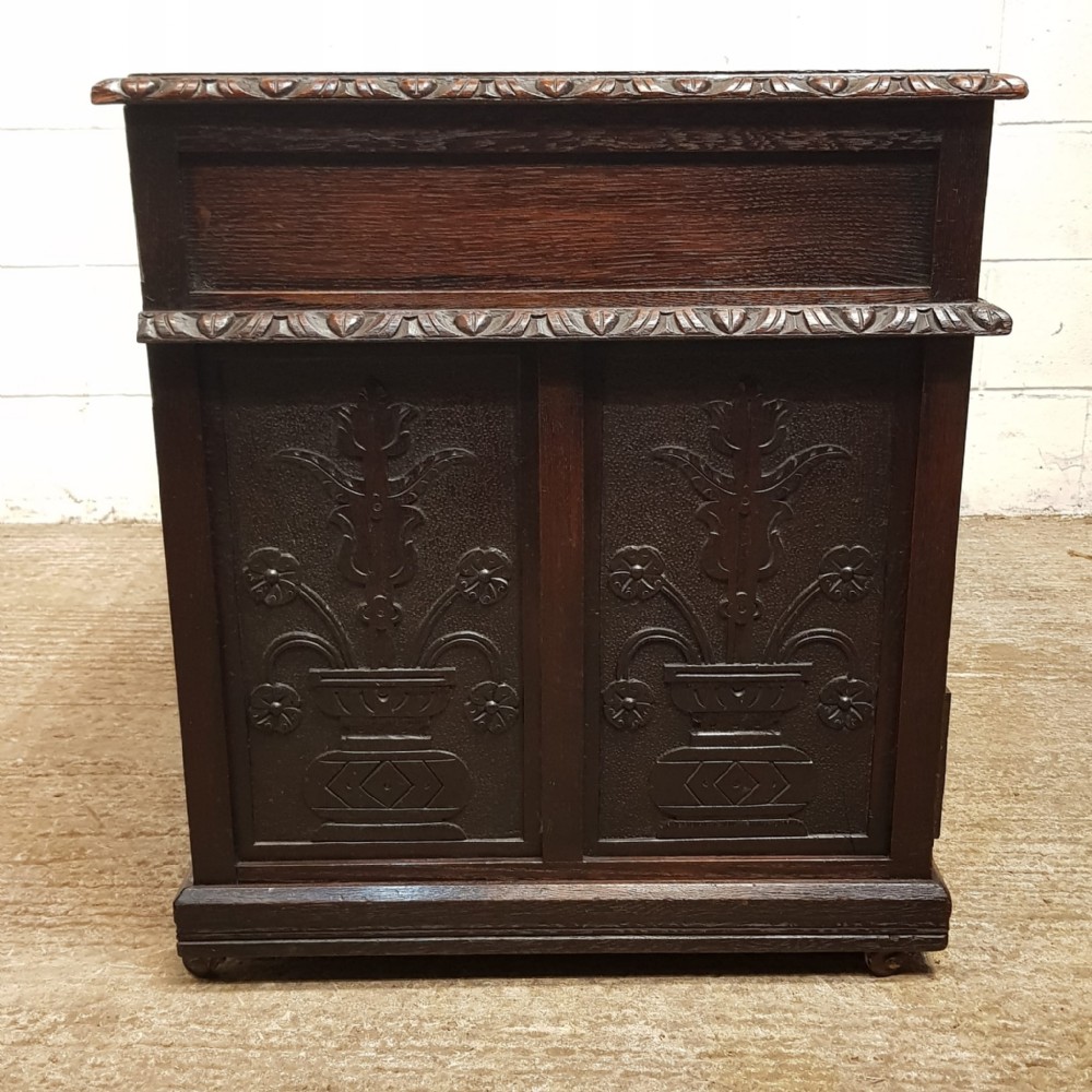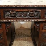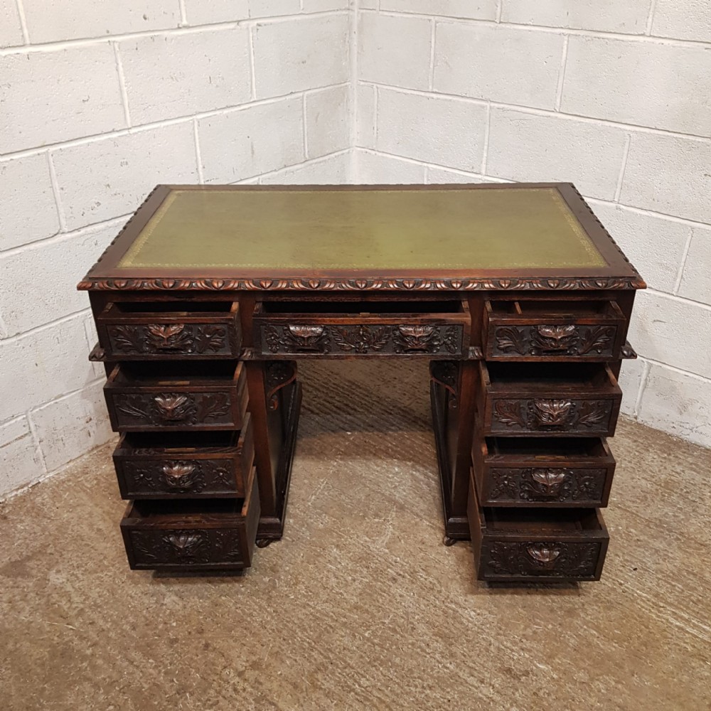 A Victorian green man carved Oak twin pedestal desk ad dating from around 1880. This lovely desk has a gold embossed leather writing surface and carved edge to the top. It has three drawers across the front of the desk with a carved lip underneath. All drawers are Mahogany lined with carved drawer fronts and carved green man handles. Each pedestal has three graduating drawers the same as above. It has a moulded plinth base on castors to each pedestal and it has carved panels to each side and is a complete piece.