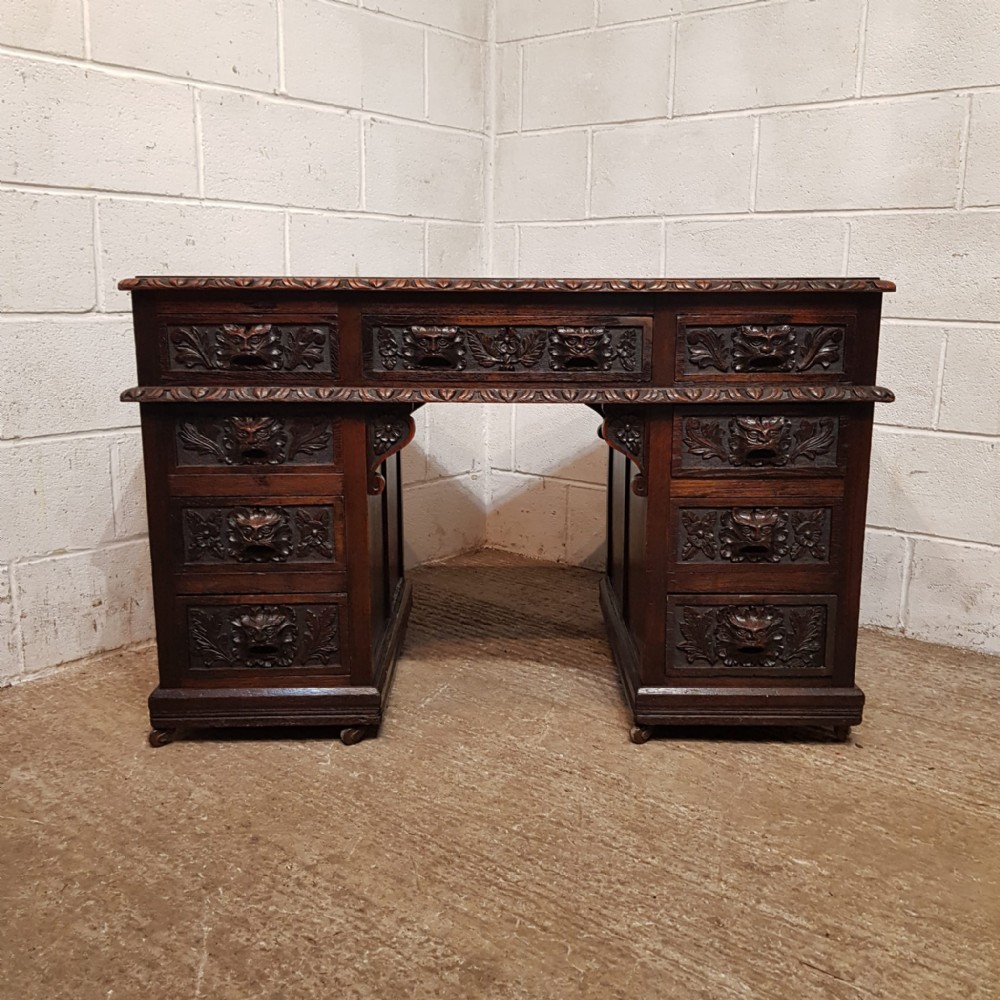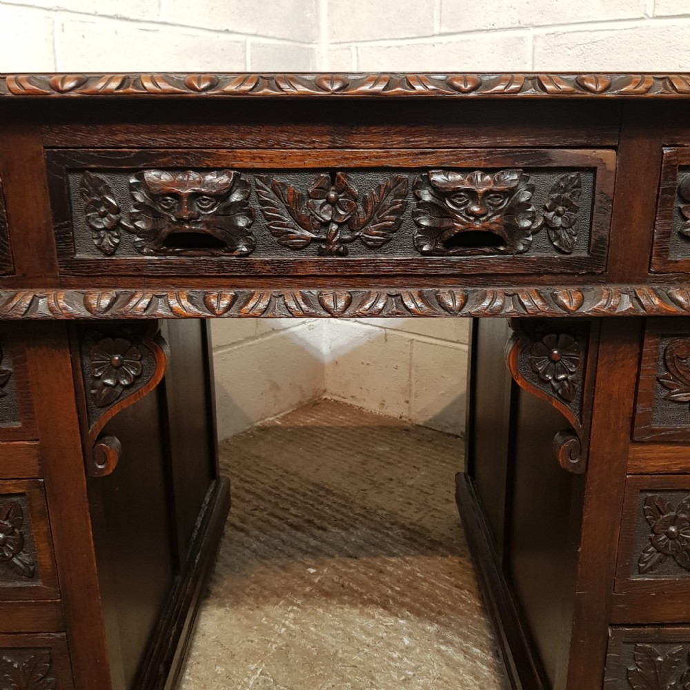 A VICTORIAN GREEN MAN CARVED OAK TWIN PEDESTAL DESK C1880