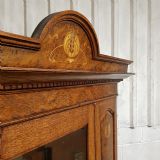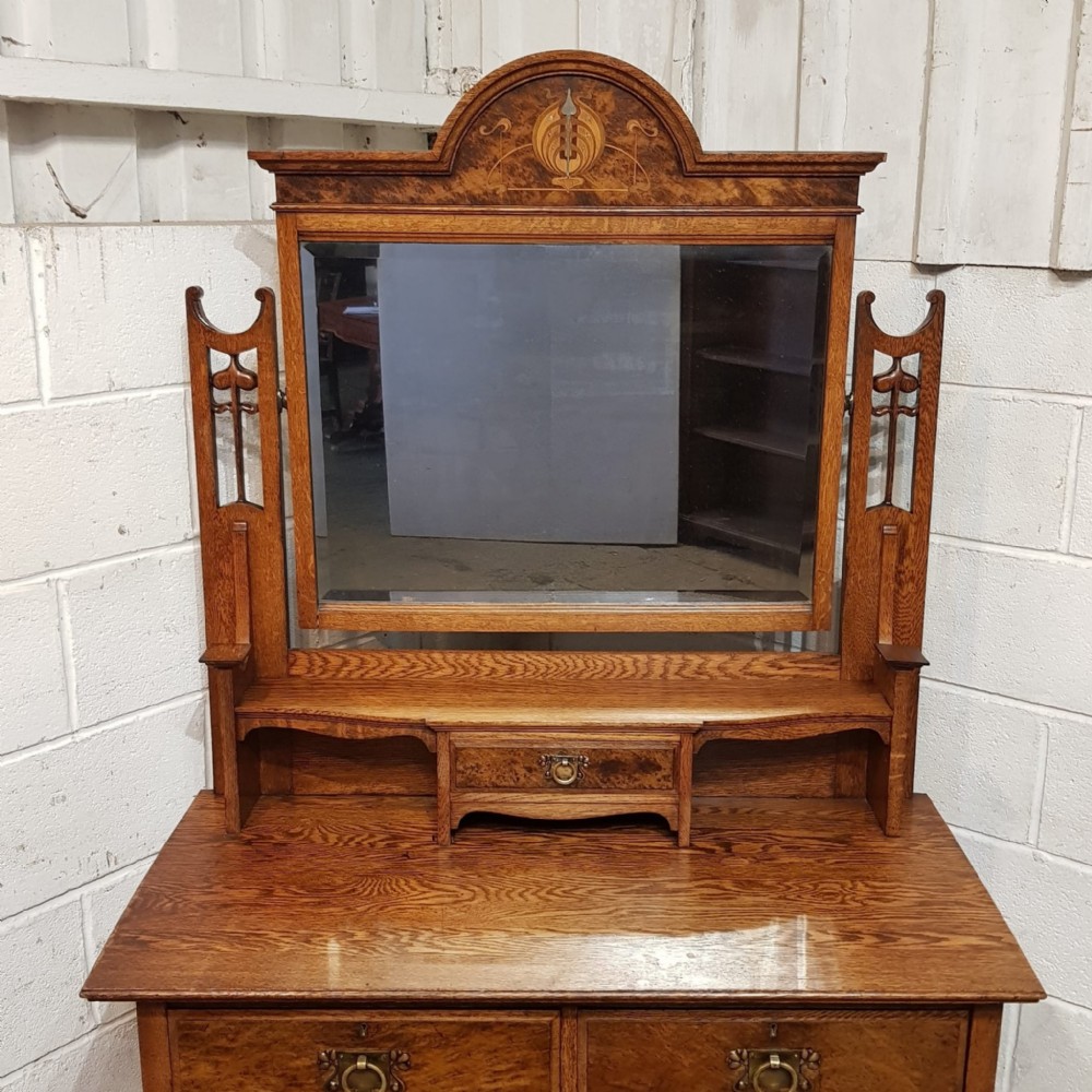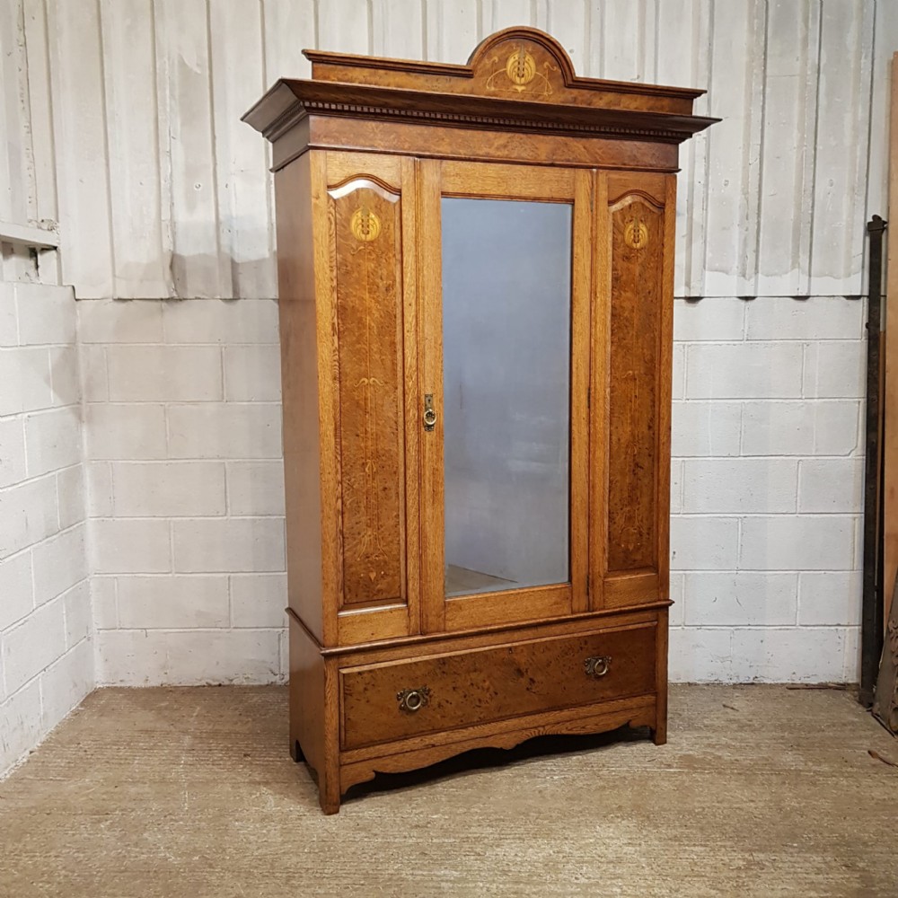 Wardrobe: The wardrobe has a moulded cornice with a Burr Oak lip under and a Burr Oak pediment above with an inlaid centre which is mother of pearl, rosewood, satinwood, olive wood and pewter. The washstand and dressing chest all have the same pediment. It has a central mirrored door with original Brass handle and a rail inside. To each side of the door is a fielded inlaid Burr Oak panel. The base has a long deep drawer which is Oak lined with original Brass handles and Burr drawer front. It stands on styled legs with a shaped pediment in between.