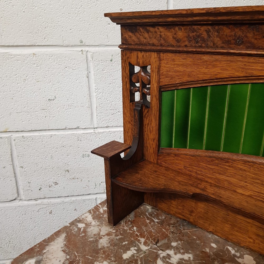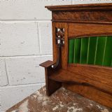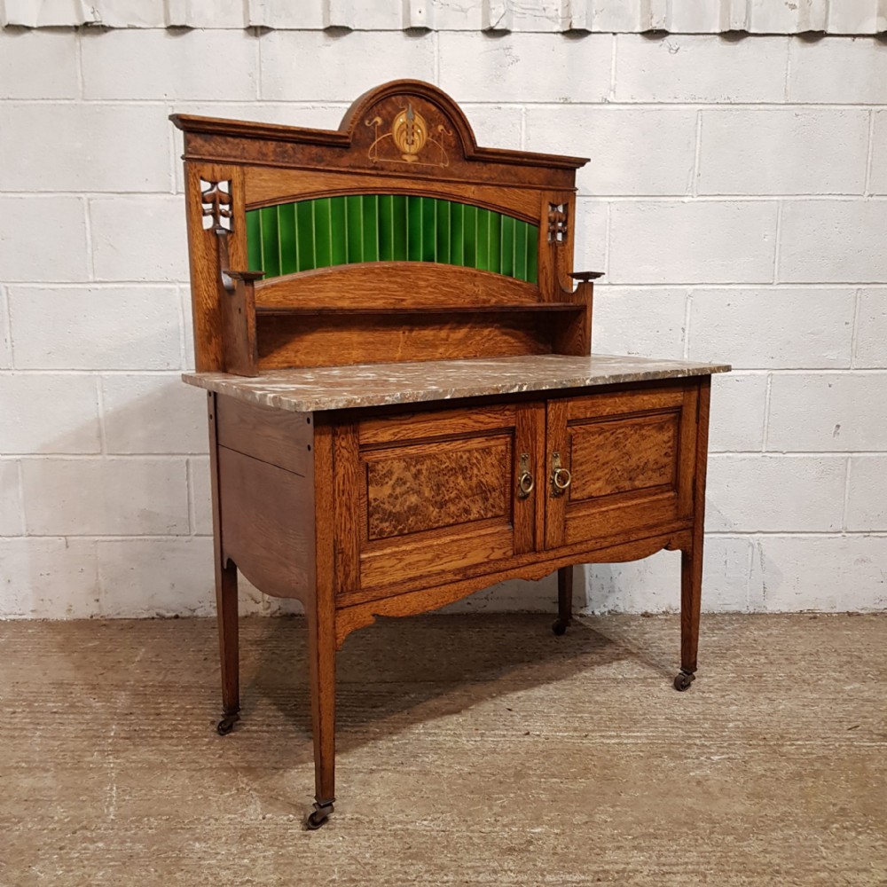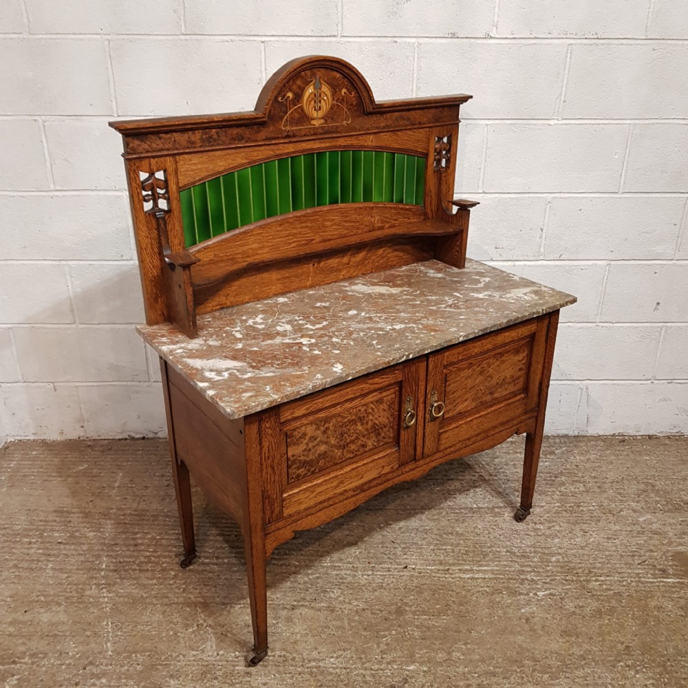 WASHSTAND: The washstand has a tiled back with the same pediment above and pierced supports to each side and a shelf with shaped ends. It has a marble top and two doors to the front both of which has a Burr Oak fielded panel and original Brass handles. It stands on square tapered legs on castors.
