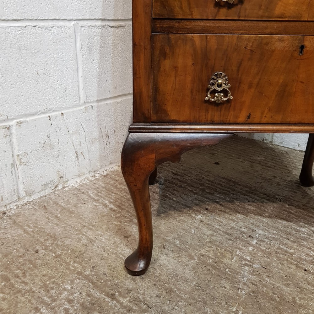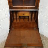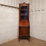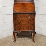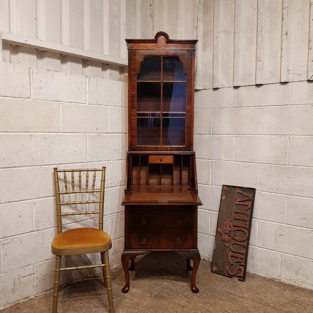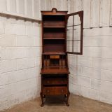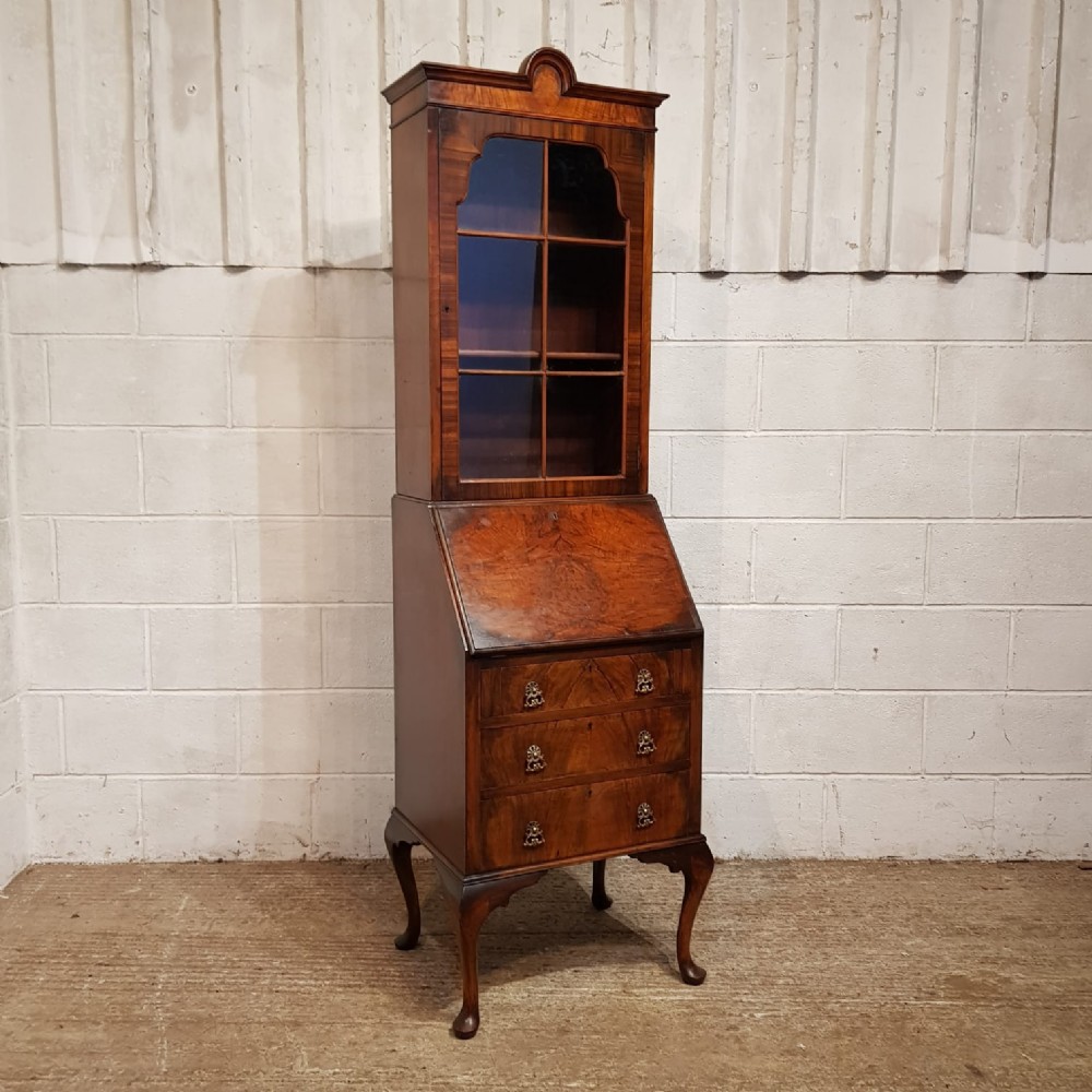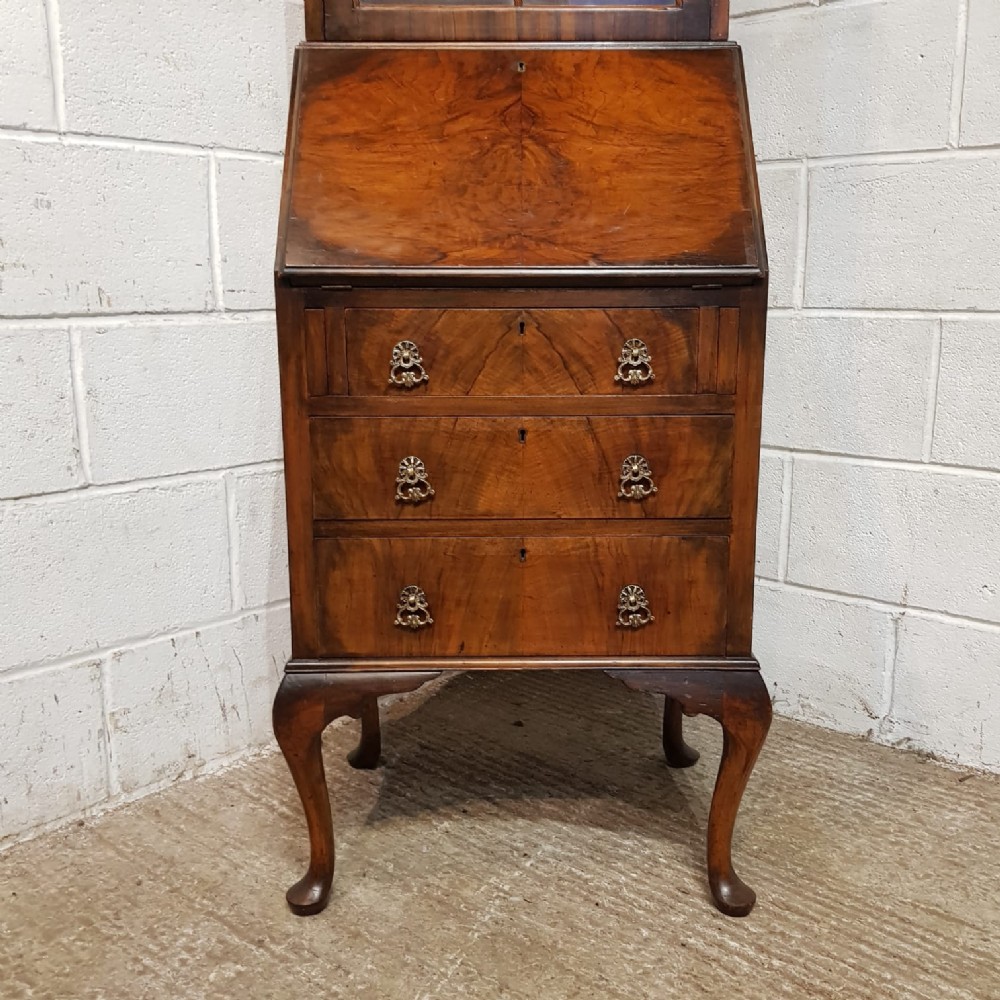 A Burr Walnut tall narrow Bereau bookcase and dating from around 1920. This beareau / bookcase has a moulded cornice with a wide lip underneath and a small pedament above. It features a single glazed door with two adjustable shelves inside. Under this is the fall front of the desk of which, inside is a drawer , assorted pigeon holes and a leather writing surface. It then has three long graduated drawers all of which are Mahogany lined with original Brass handles. It is moulded around the bottom and stands on cabriole legs. The top lifts off the base for ease of movement.