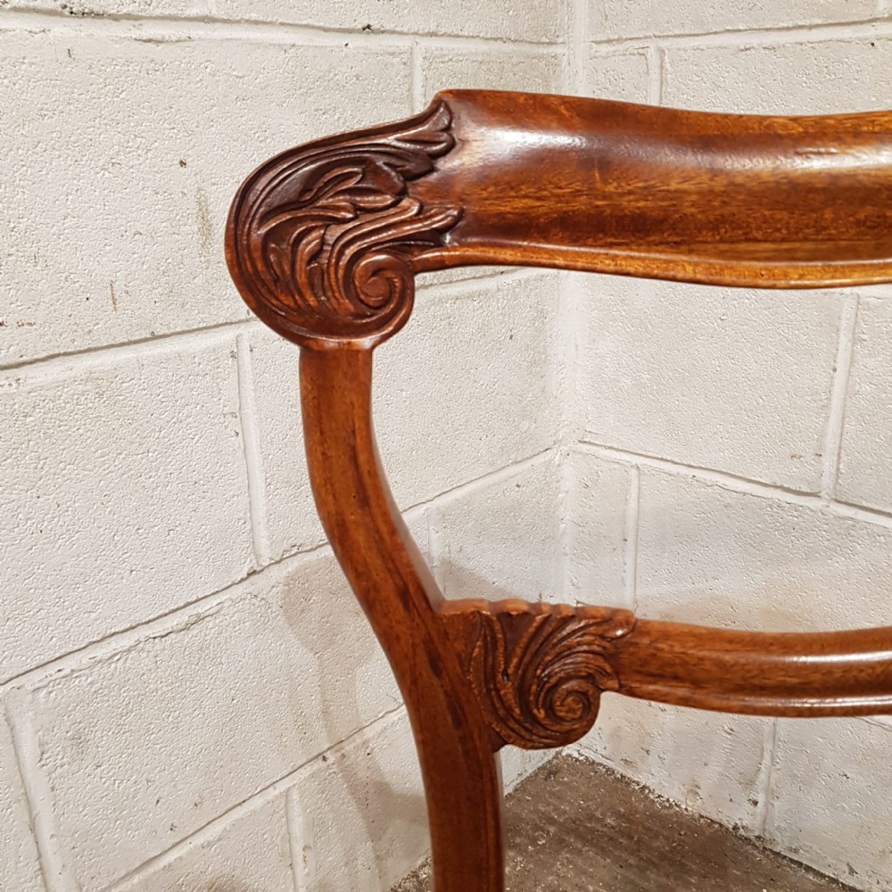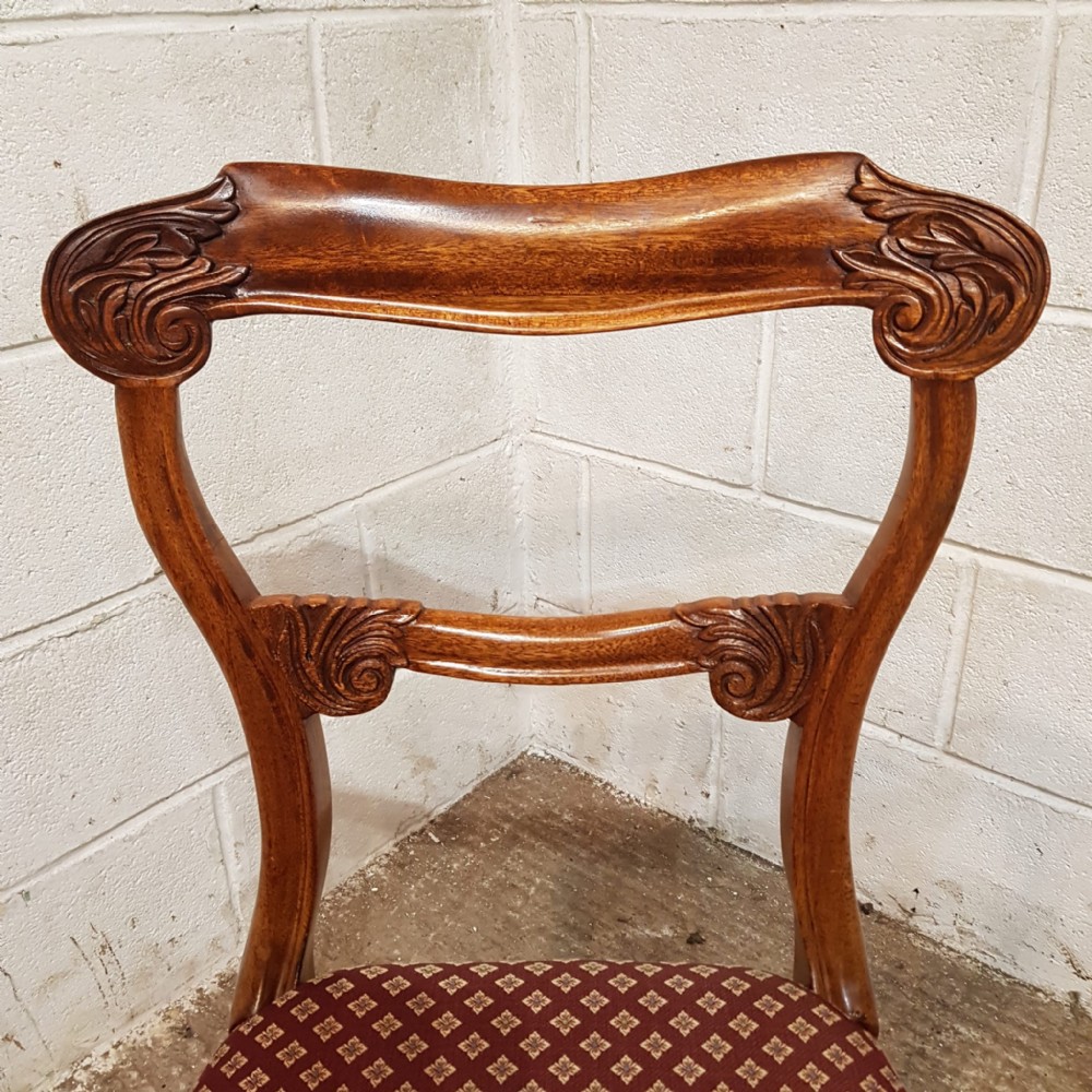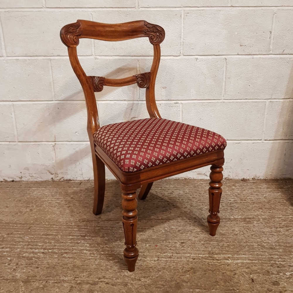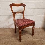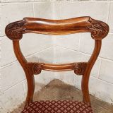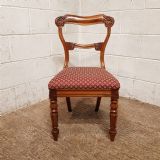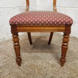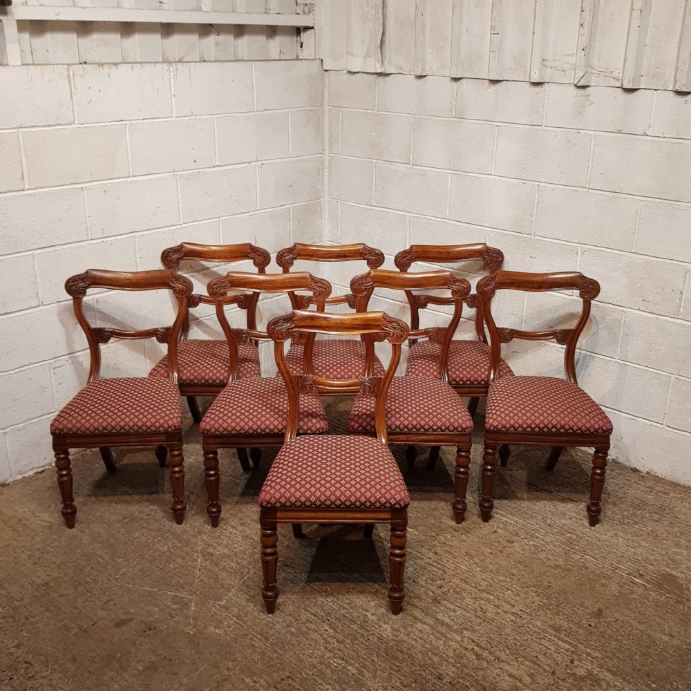 A set of 8 Walnut dining chairs and dating from around 1880. These beautiful chairs have a moulded and shaped sides to the back with a curved top rail. They are carved to each end with a carved cross splat under. The drop in seat pads are in very good condition with moquet material and have a moulded rail underneath the seat. They stand on turned legs and feet.