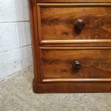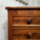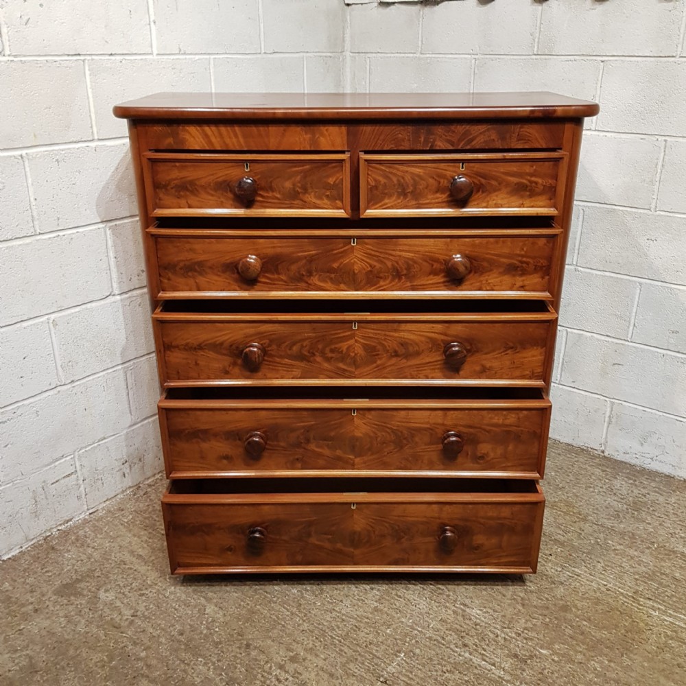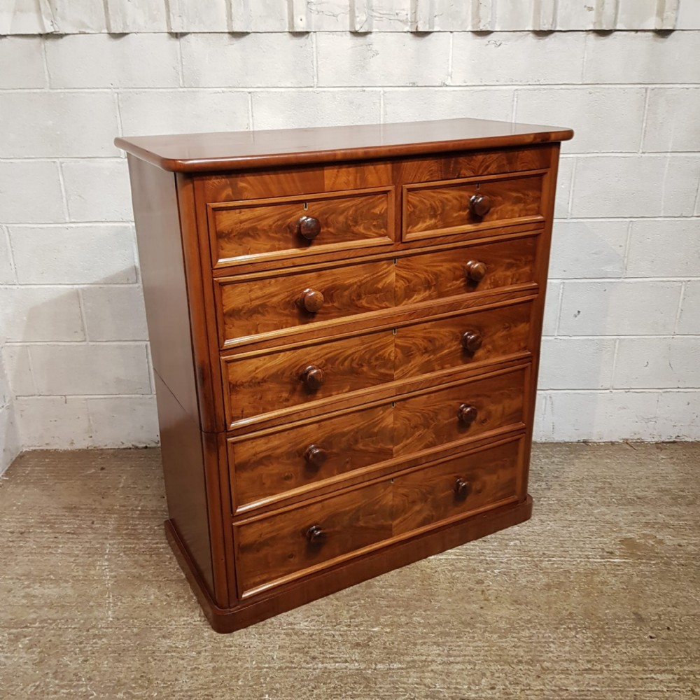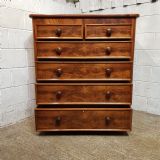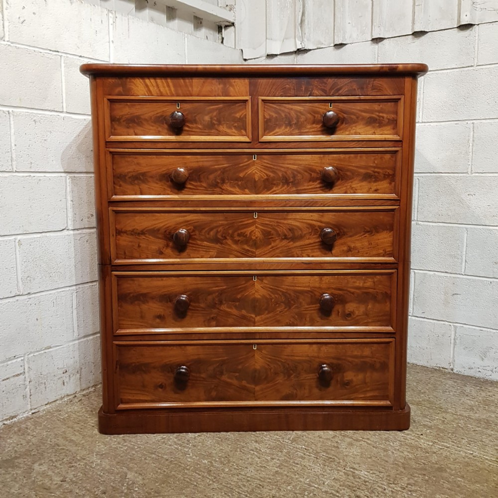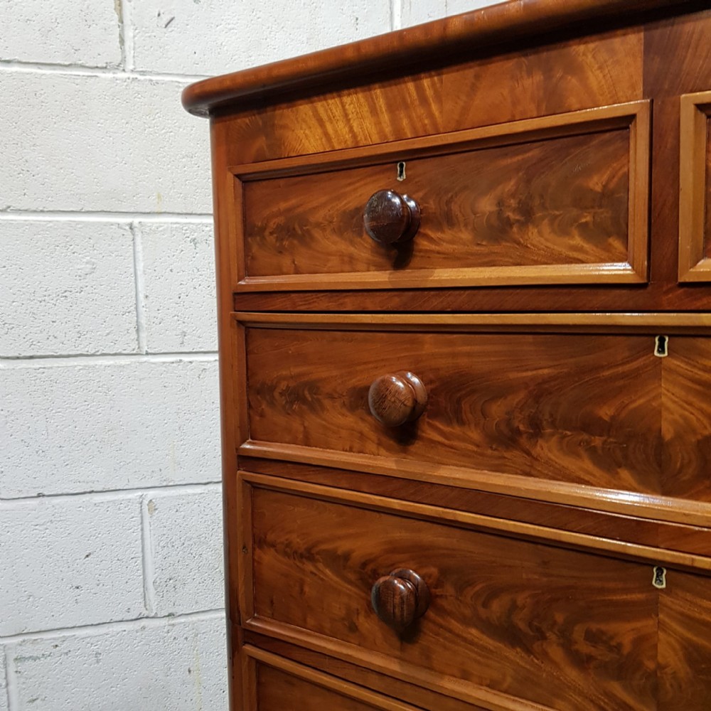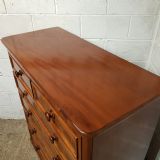 A Victorian Mahogany 5 height chest of drawers and dating from around 1860. This original chest of drawers has a rounded edge to the top with a lip underneath. It has two short drawers over four long graduating drawers which are pine lined with original knob handles and a moulded edge to the drawer fronts. The chest has moulded and rounded corners and stands on a plinth base. The chest was made to seperate into two pieces for ease of access. It is very good quality and excellent condition.
