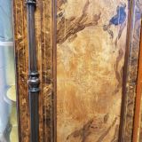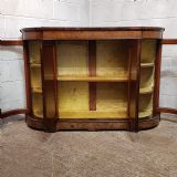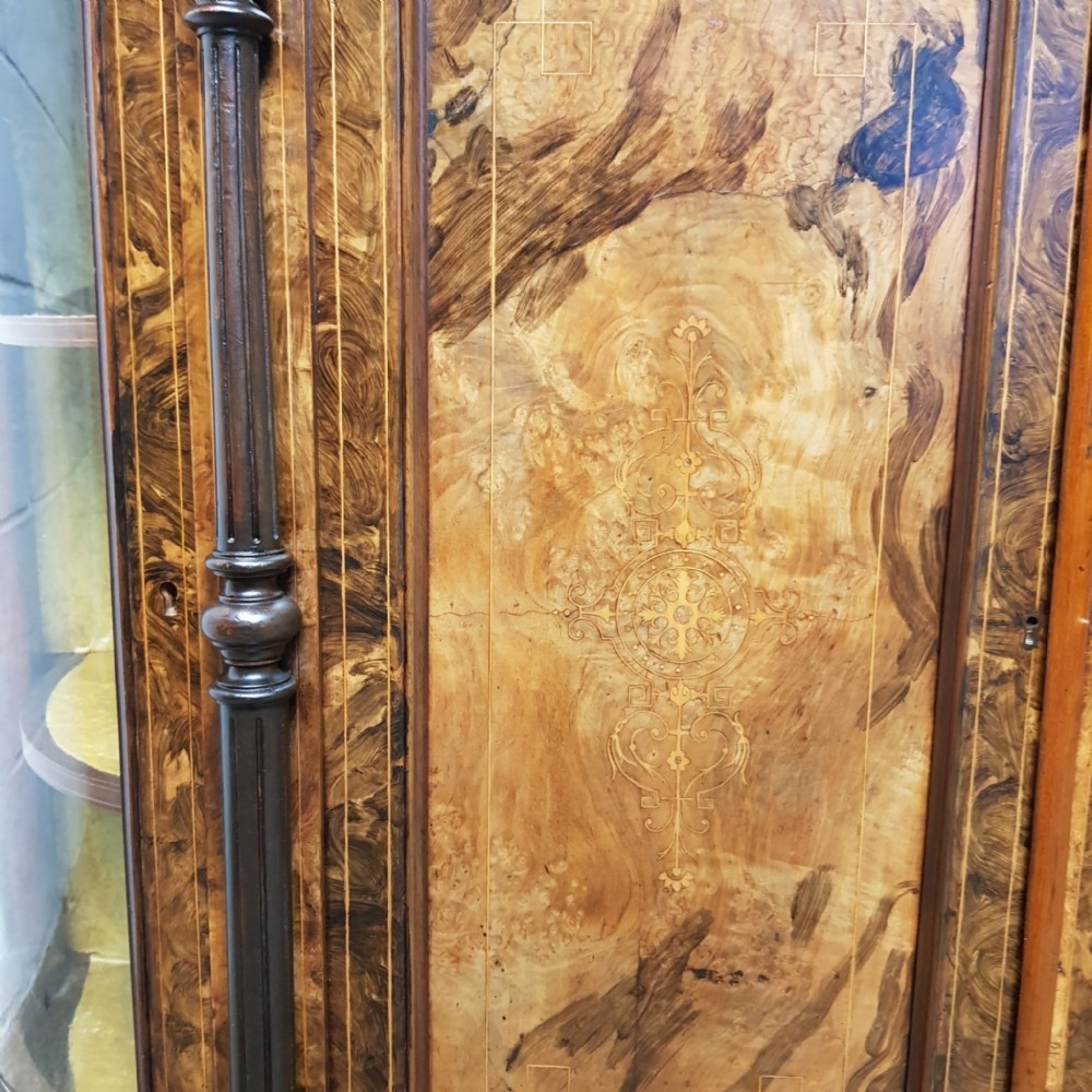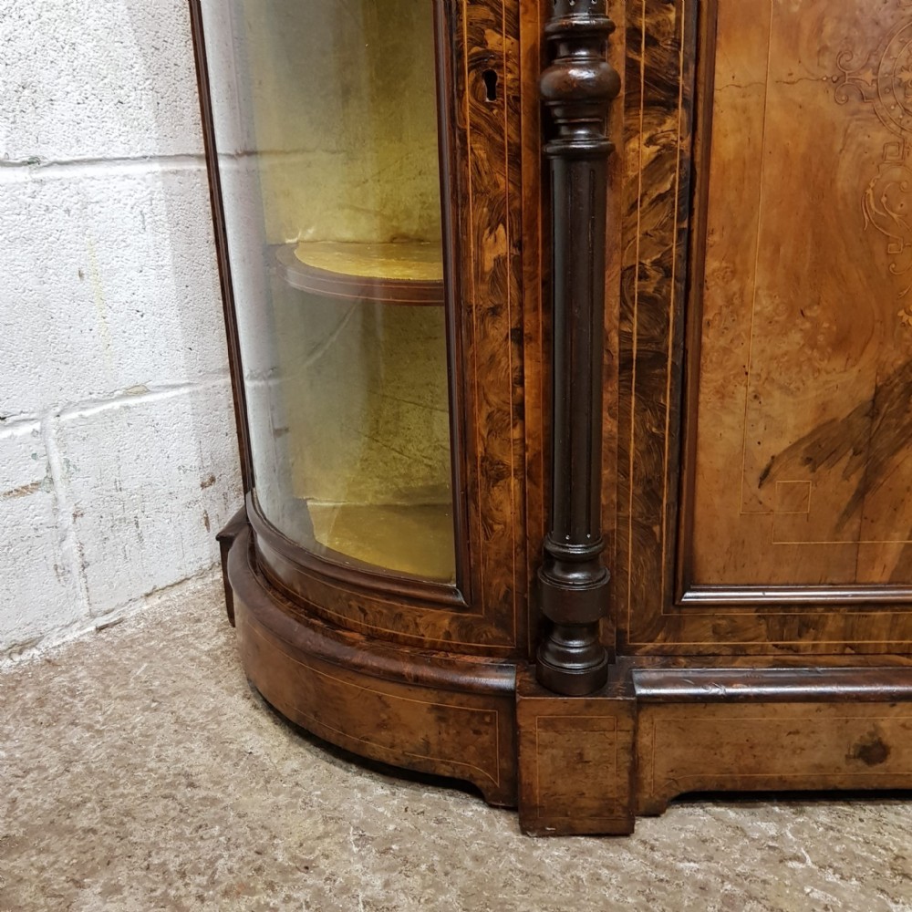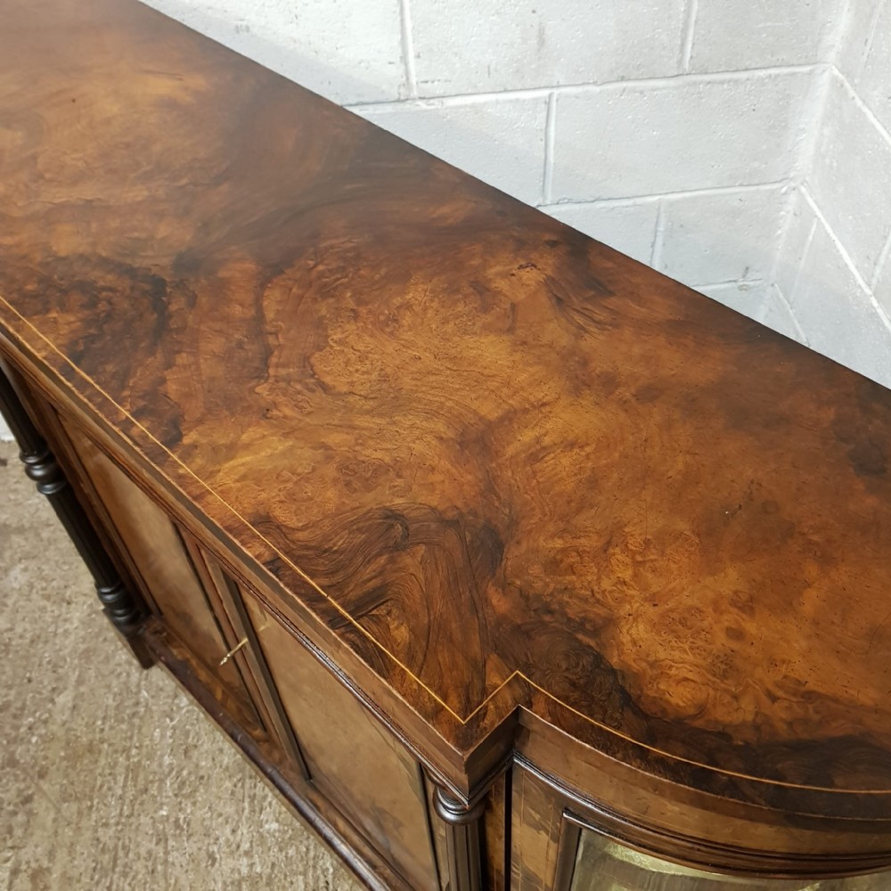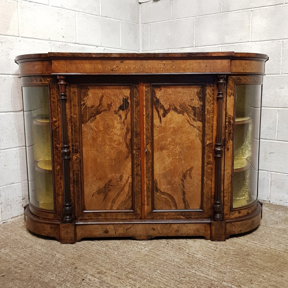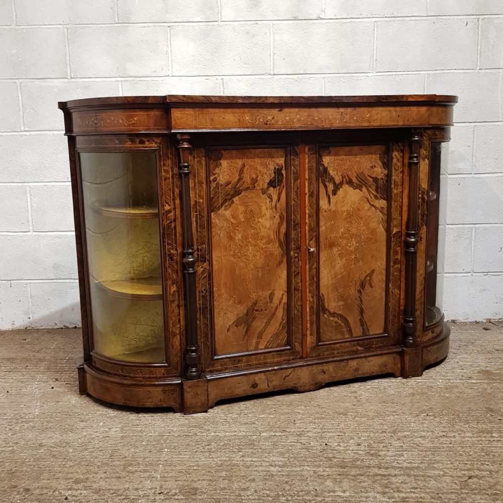 An antique Victorian Walnut credenza and dating from around 1880. This beautiful piece has a Satinwood strung edge to the top with an inlaid lip underneath. It has two doors to the centre both of which have a moulded panel in a strung door frame with a key. Inside is a shelf. To each side of the doors is a turned column. It has a bow glazed door on each end in a strung door frame and two original shelves inside with original velvet lining and it stands on a plinth base.