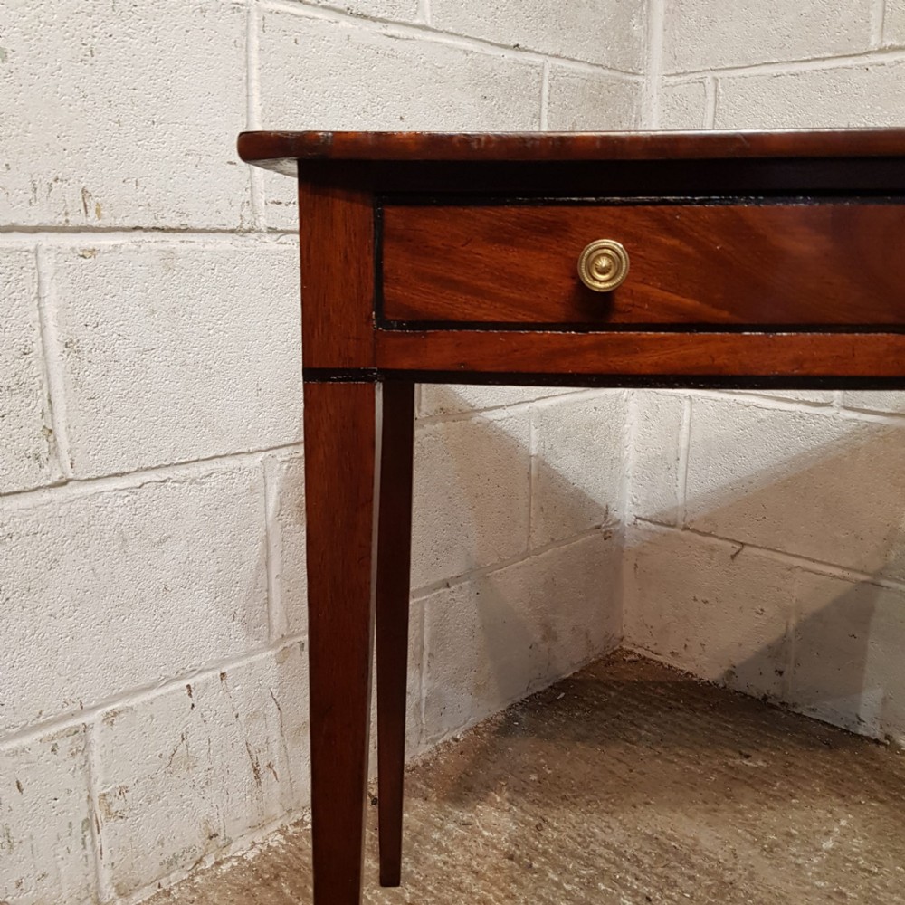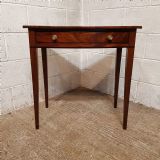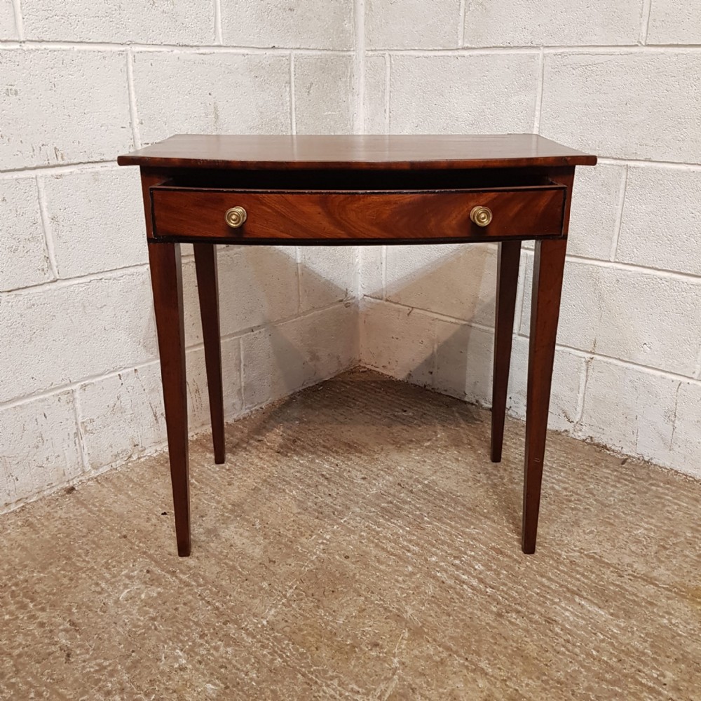 A George 3rd Mahogany bow fronted side table and dating from around 1800. This original Georgian side table has a long drawer to the front which is Oak lined and has its original brass handles and an ebony strung edge to the drawer front. It stands on square tapered and splayed legs.