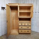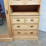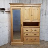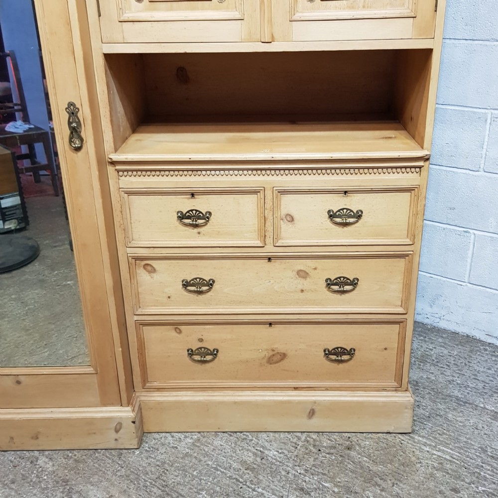 A late Victorian Pine combination wardrobe and dating from around 1890. This wonderful piece has a moulded cornice with dental moulding and a wide lip underneath. On the right hand side is a long mirror door with original brass handle and a hanging rail inside. On the right hand side are tow cupboard doors with moulded panels and a carved spandrell in each corner with original brass handles, inside is a shelf and an open compartment underneath. Following this are two short over two long drawers all of which are pine lined with original brass handles. The wardrobe stands on a plinth base and separates into five pieces for ease of movement,