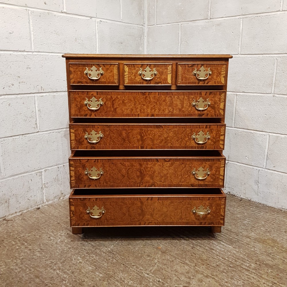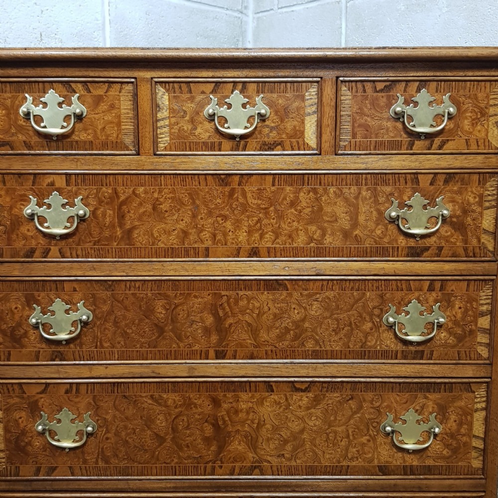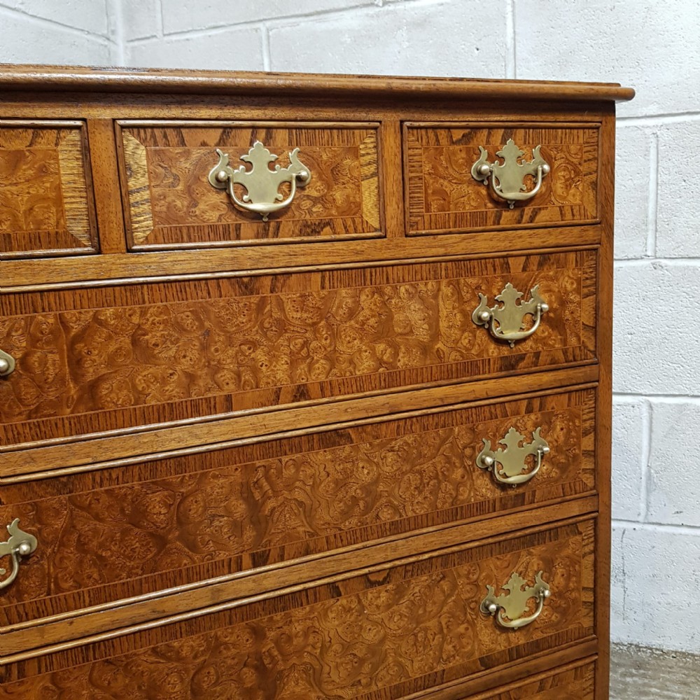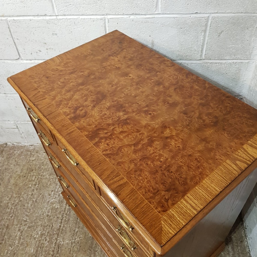 A Burr Walnut and Oak chest of drawers and dating from around 1920. This wonderful piece has an Oak cross banded and moulded edge to the top with three short drawers above three long graduating drawers all of which are Oak lined with original Brass handles and the drawer fronts have an Oak cross banded edge. It is moulded around the bottom and stands on bracket feet.