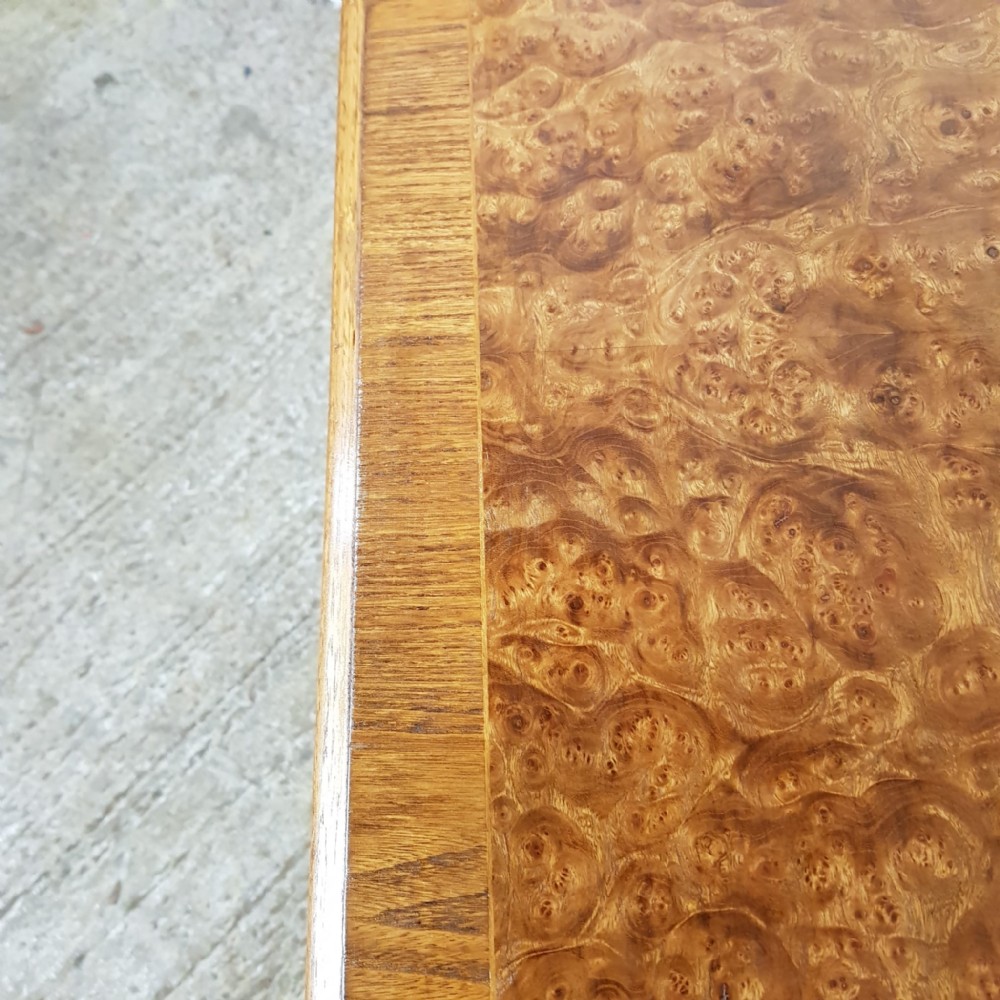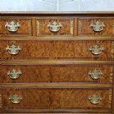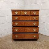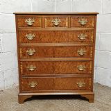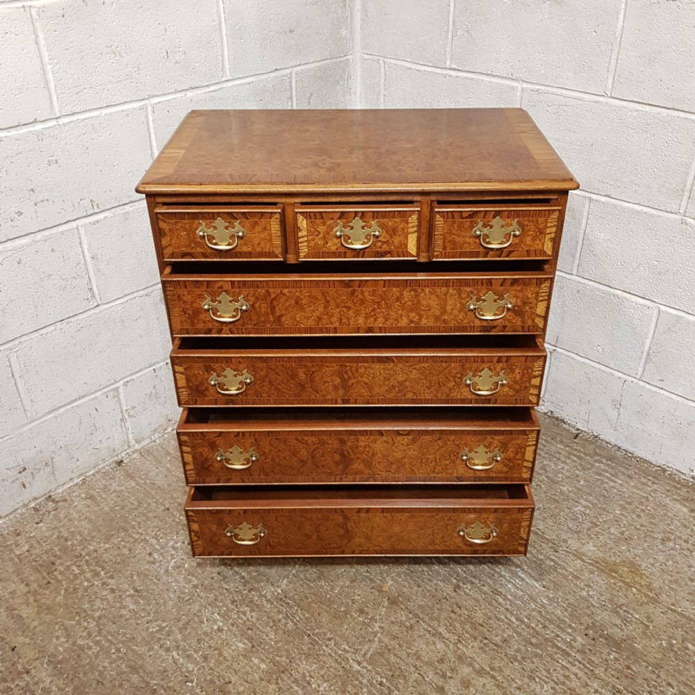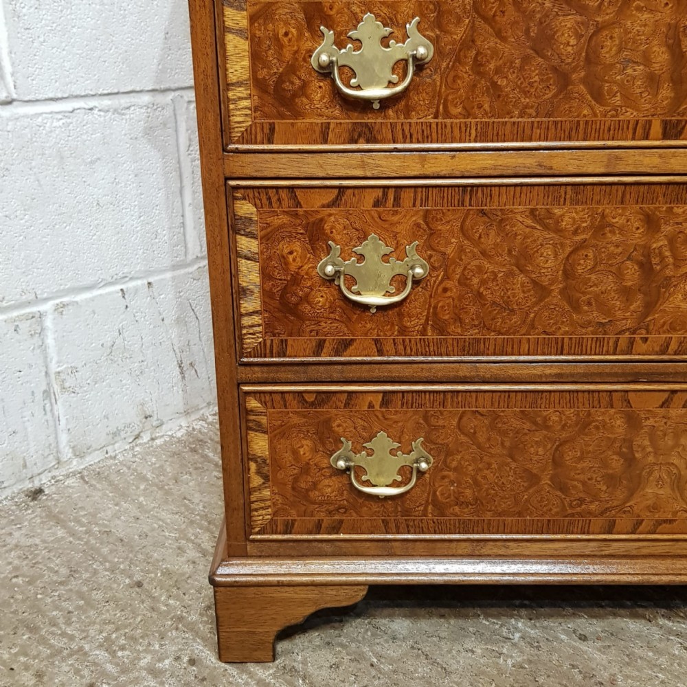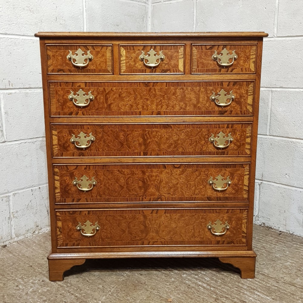 A Burr Walnut and Oak chest of drawers and dating from around 1920. This wonderful piece has an Oak cross banded and moulded edge to the top with three short drawers above three long graduating drawers all of which are Oak lined with original Brass handles and the drawer fronts have an Oak cross banded edge. It is moulded around the bottom and stands on bracket feet.