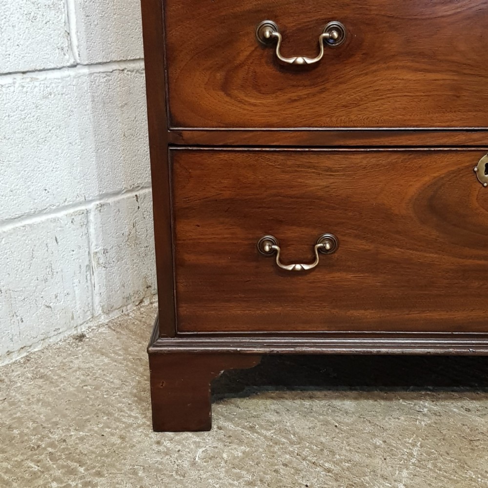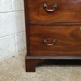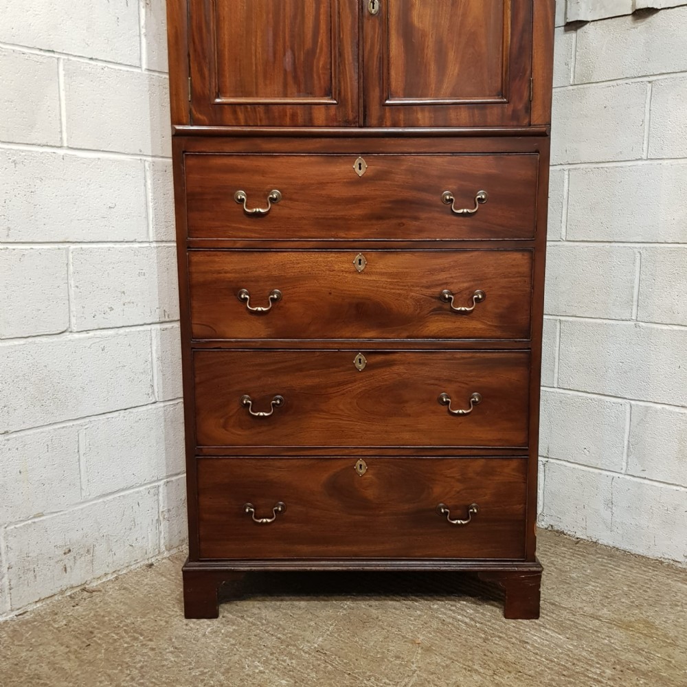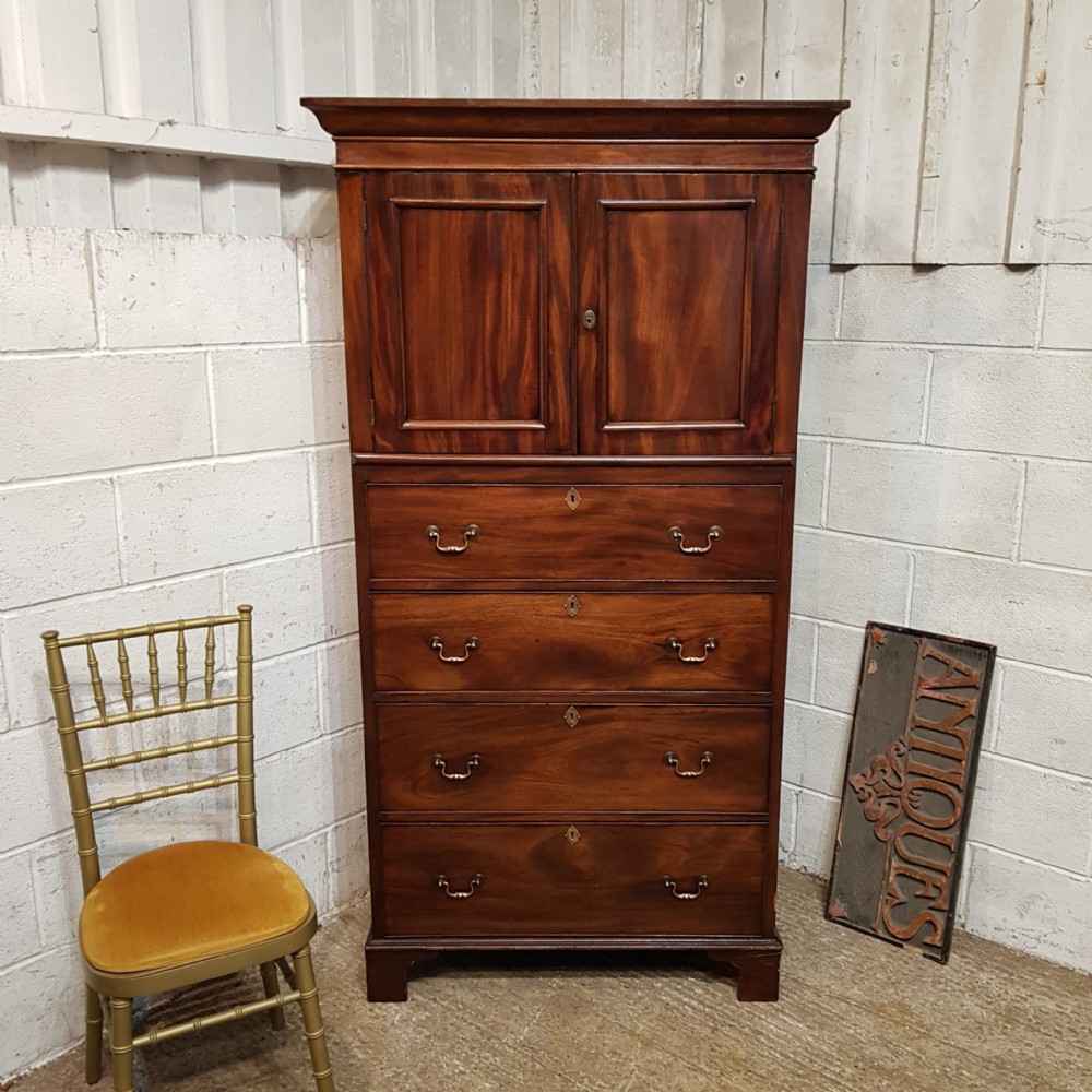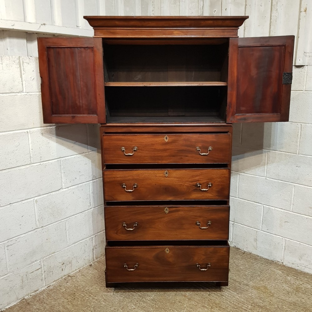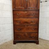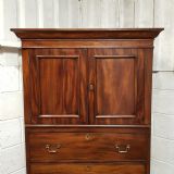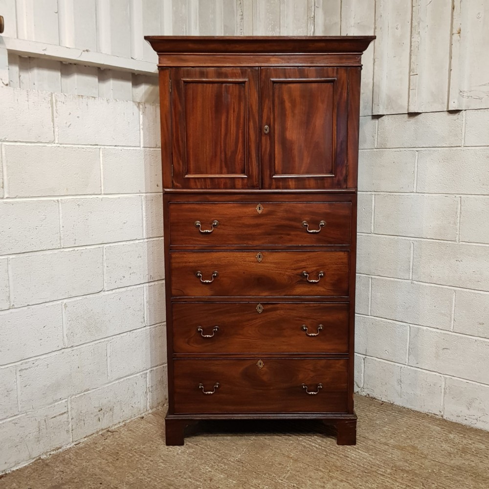 A Victorian Mahogany small lined press and dating from around 1860. This wonderful example has a moulded cornice with a lip underneath. It has two small doors both of which have a moulded panel brass escutcheons and a Key with a shelf inside. Following the doors are four long graduating drawers all of which are Oak lined with Brass escutcheons and Brass handles. It is moulded around the bottom and stands on bracket feet.
