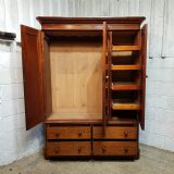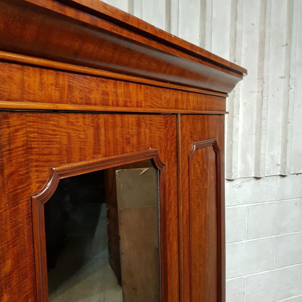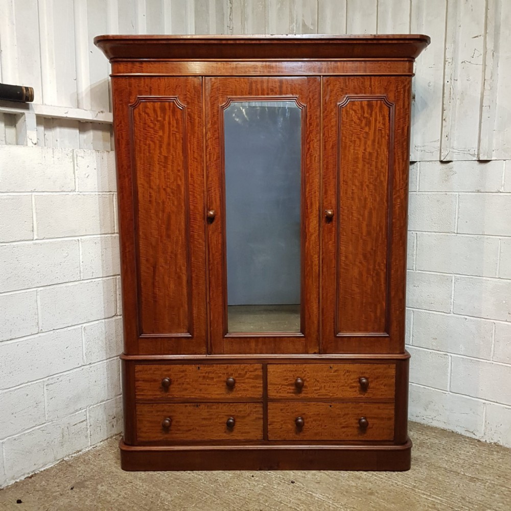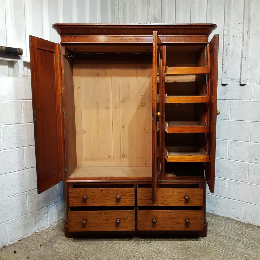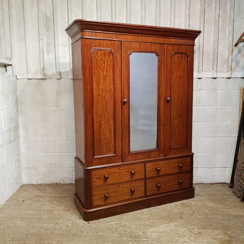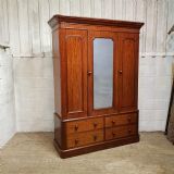 A Victorian Mahogany small triple wardrobe and dating from around 1880. This beautiful piece has a moulded cornice with a lip underneath and features a central mirrored door in very good condition. The doors to each side have a long moulded panel with original nob handles. Behind the left and centre doors is a hanging rail and behind the right hand door are four slide tray drawers. The base is moulded around the top with two rows of two short drawers all of which are Mahogany lined with original nob handles. The wardrobe stands on a plinth base and separates into six pieces for ease of movement.
