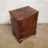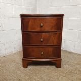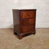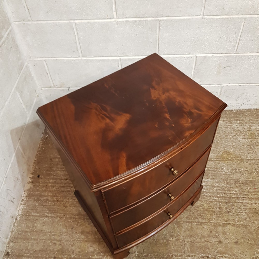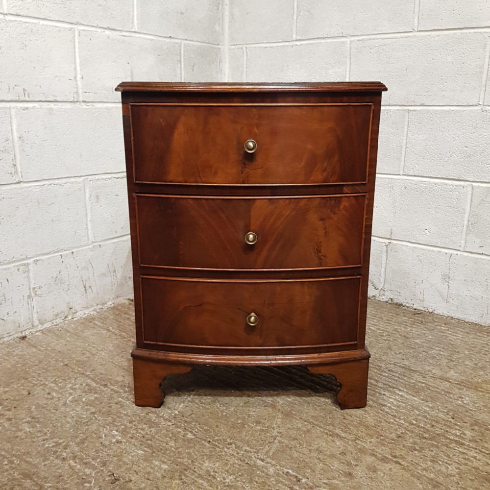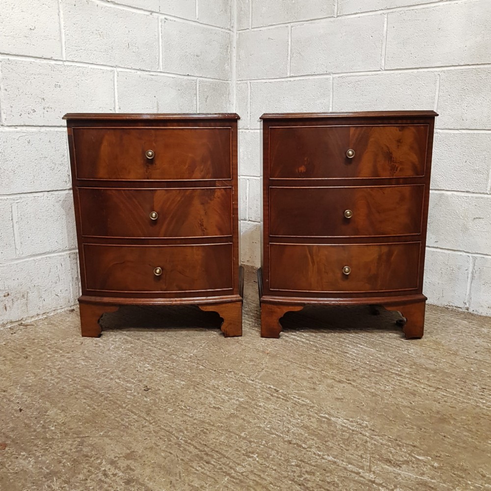 A pair of Mahogany bow fronted bedside chests and dating from around 1920. This pair of bedside chests have a moulded edge to the top with three long drawers all of which are Oak lined with original Brass handles. They are moulded around the bottom and stand on bracket feet.