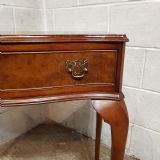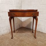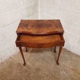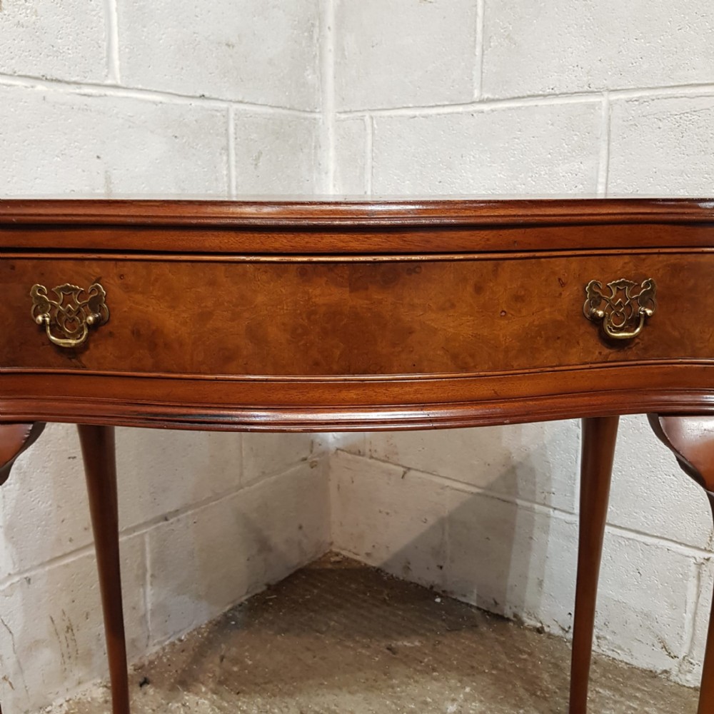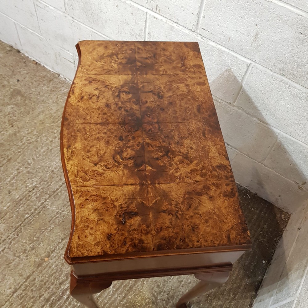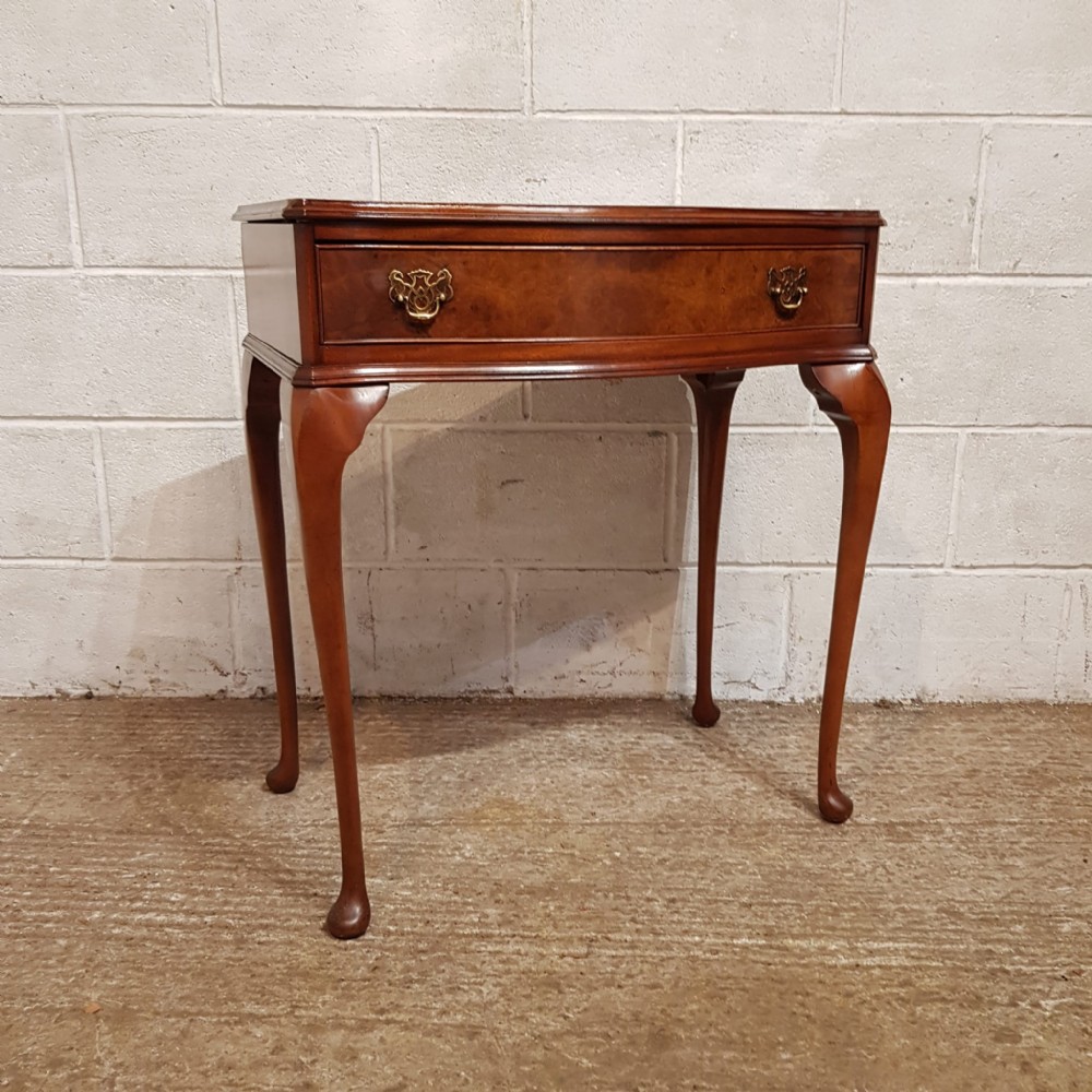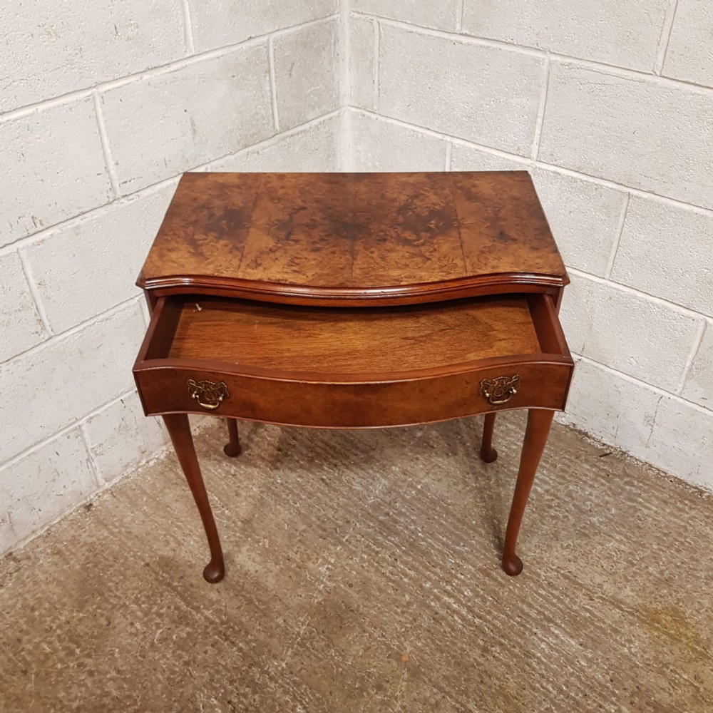 A small serpentine fronted Burr Walnut side table and dating from around 1920. This Burr Walnut side table has a moulded edge to the top with a serpentine lip underneath and a long Mahogany lined drawer with original Brass handles. The table stands on long cabriole legs on a pad foot.