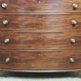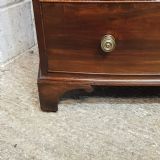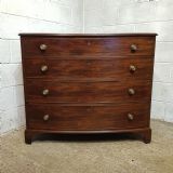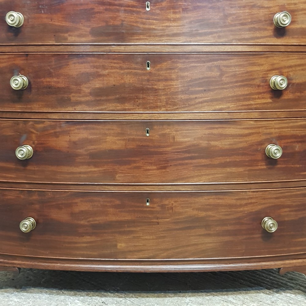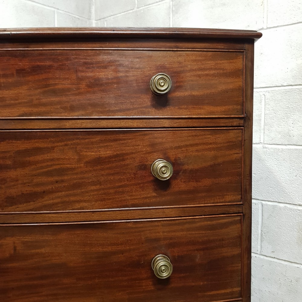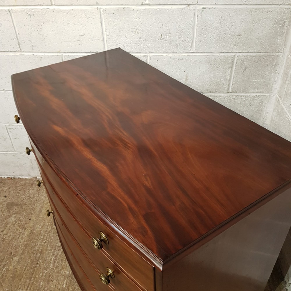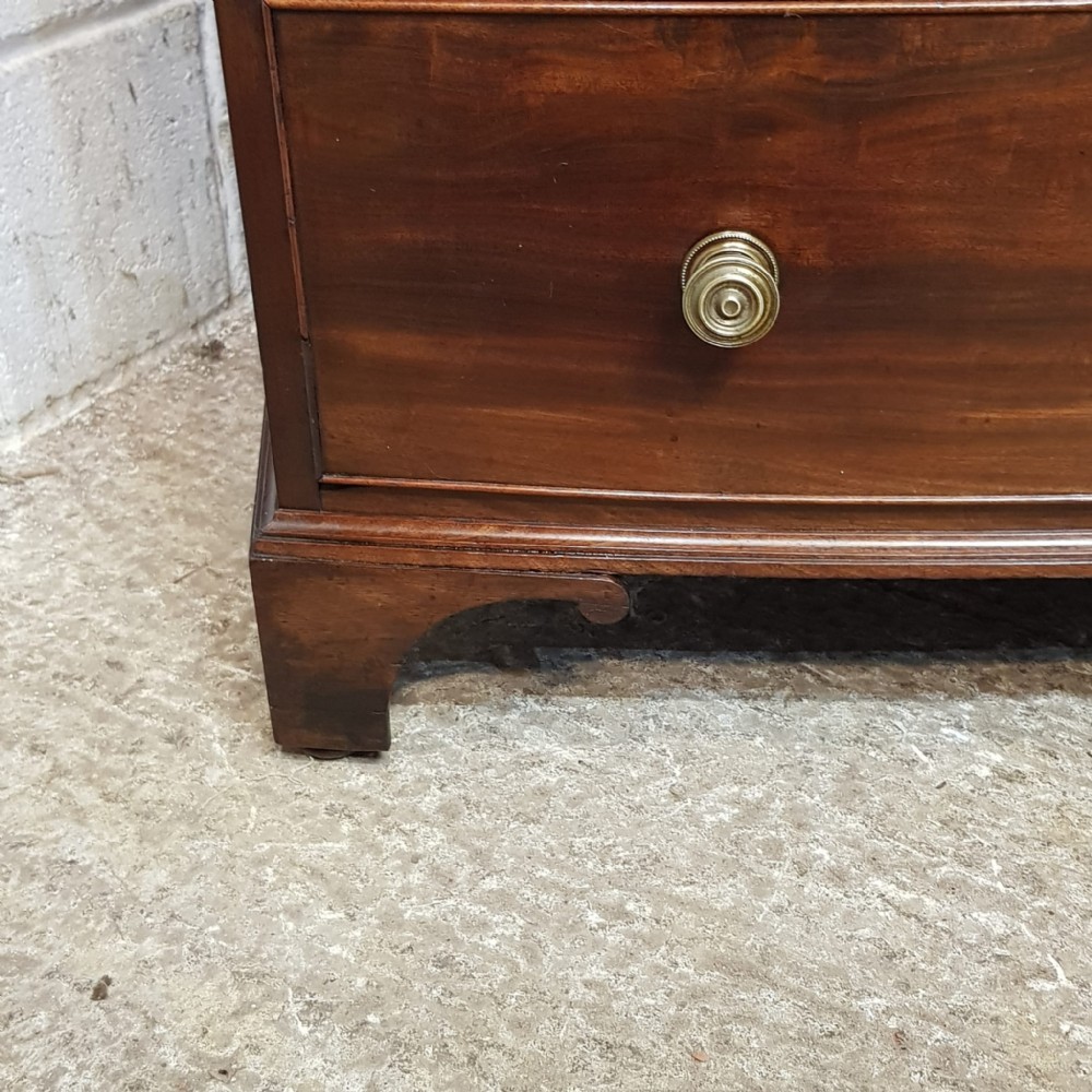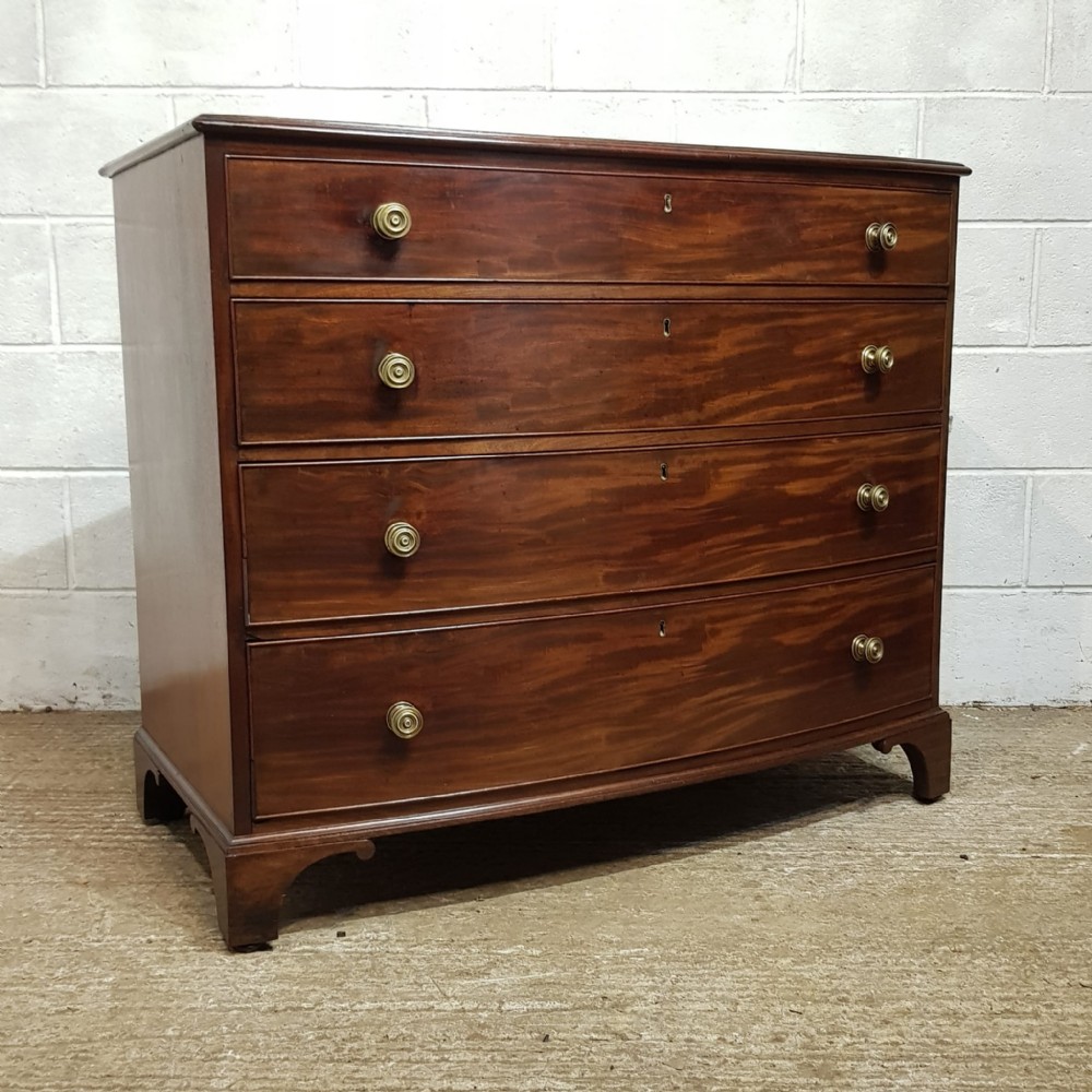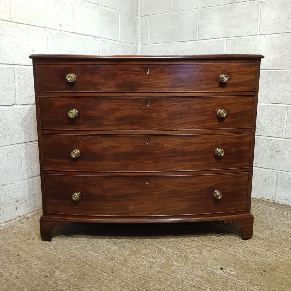 A George 3rd Mahogany bow fronted 4 height chest of drawers and dating from around 1800. This stunning piece has a moulded edge to the top with four long graduating drawers all of which are Oak lined with original Brass nob handles. It is moulded around the bottom and stands on bracket feet.