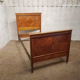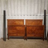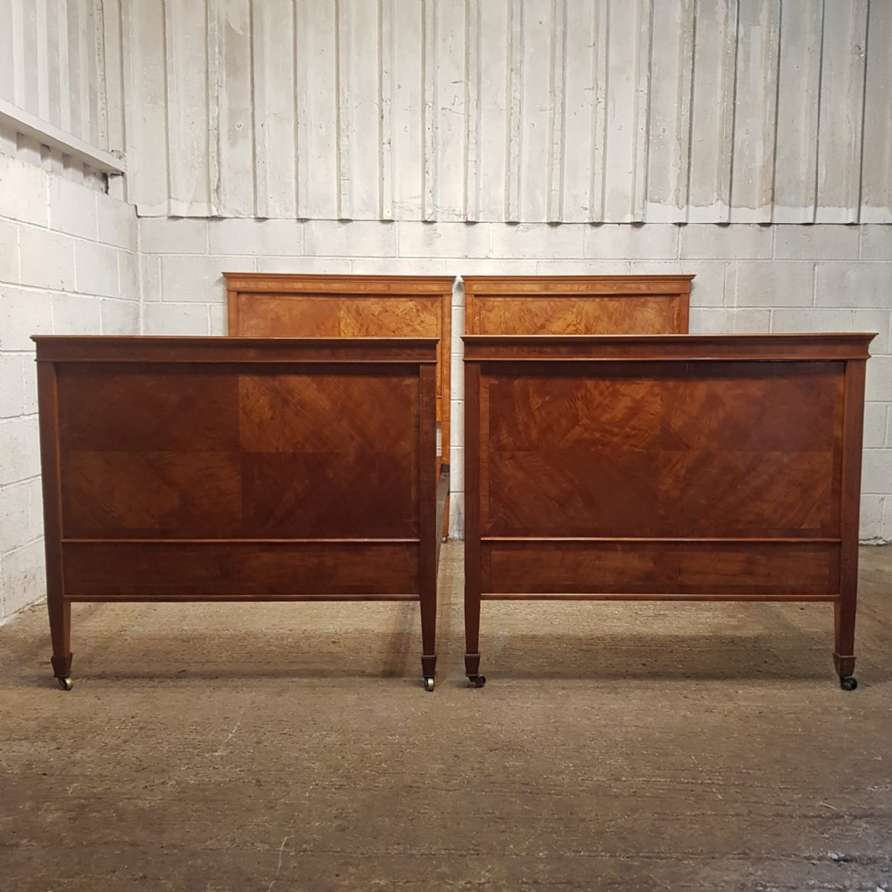 A pair of Satinwood Shapland and Petter single besd and dating from around 1890. This lovely pair of single beds have a strung side rail headboard and moulded strung top rail with a lip underneath with a large cross banded and strung panel and the foot board is the same. They stand on square tapered legs on castors with original Iron screw in side rails.