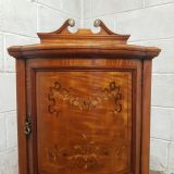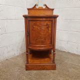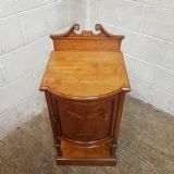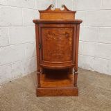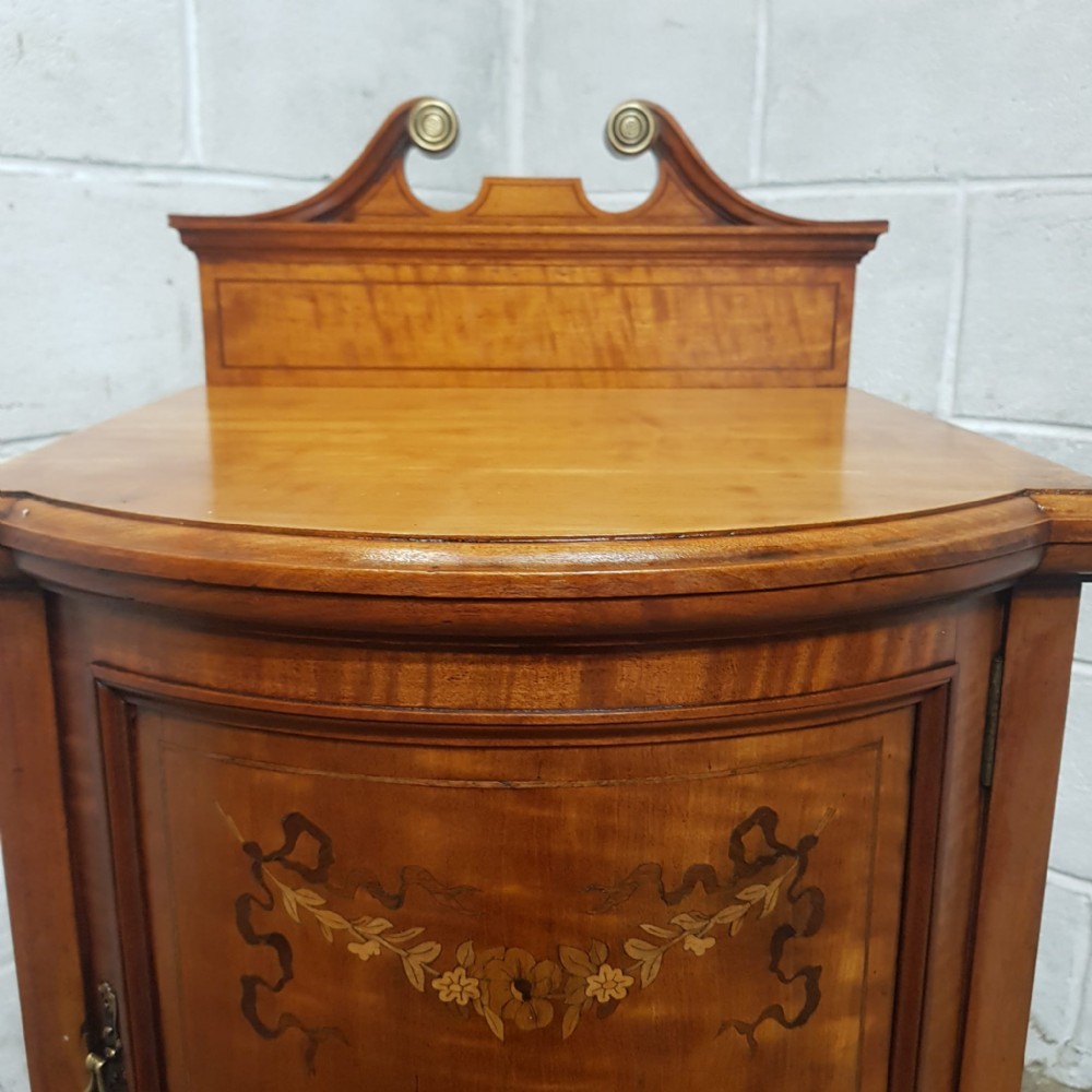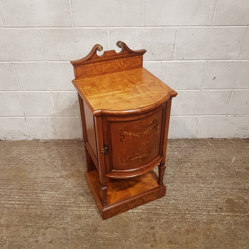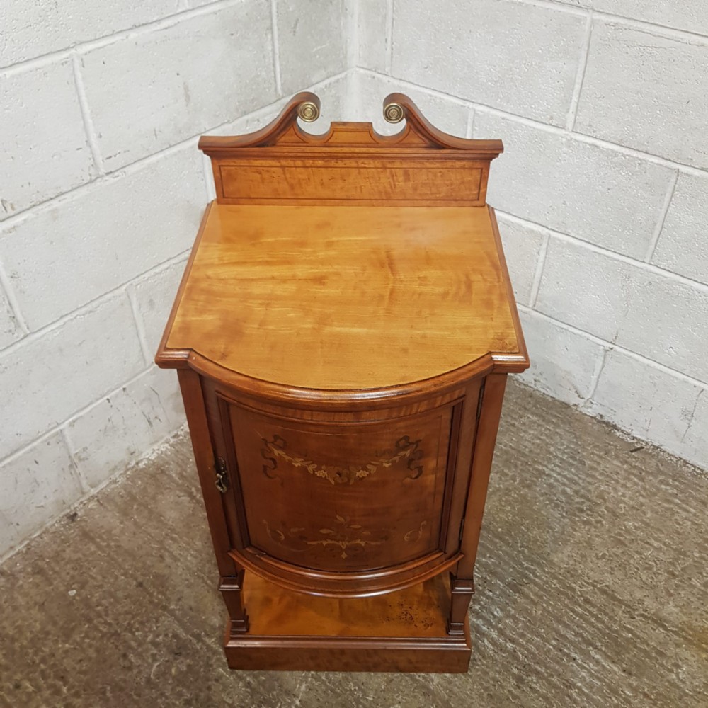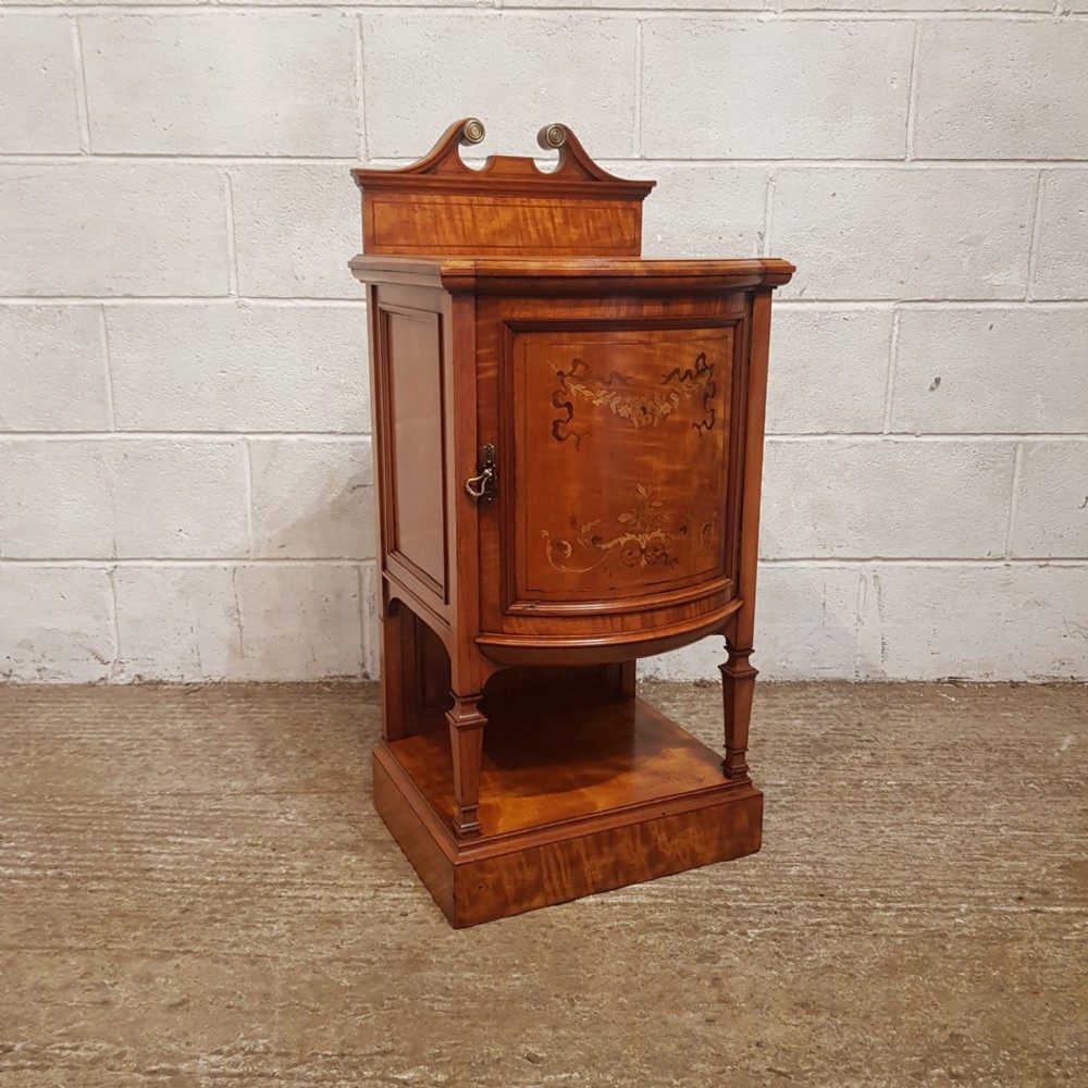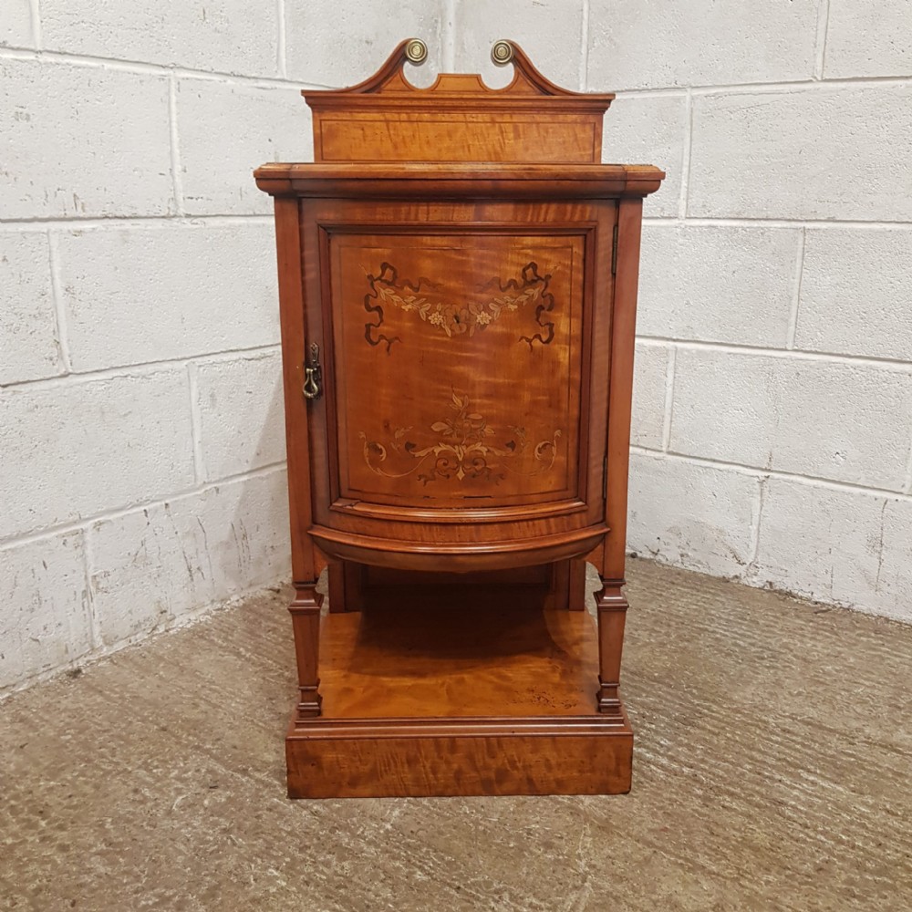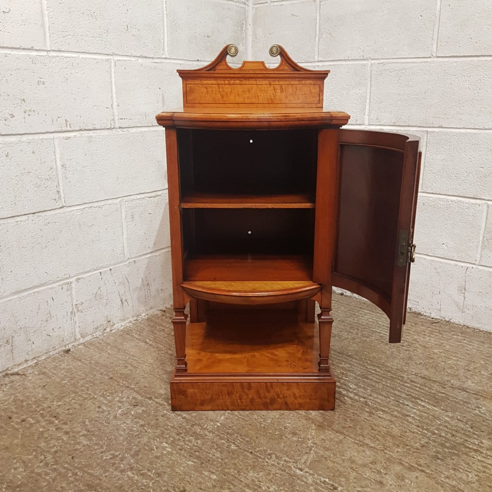 A Shapland and Petter satinwood bedside cabinet and dating from around 1880. This original piece has a moulded edge to the top with a Brass mounted pediment to the back. It features a bow fronted door with an inlaid moulded panel, original Brass handle and a shelf inside. It stands on square tapered moulded legs on a plinth base with a shelf and has panelled sides.