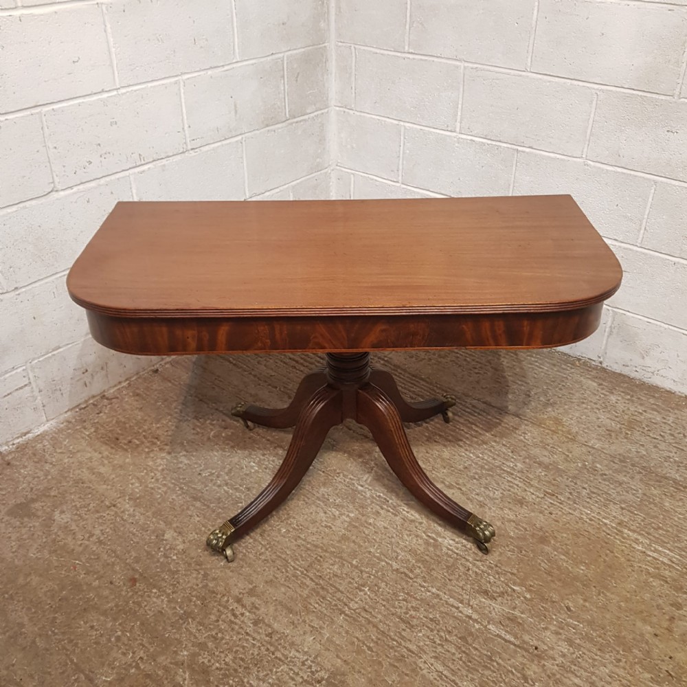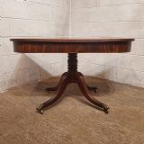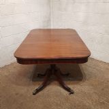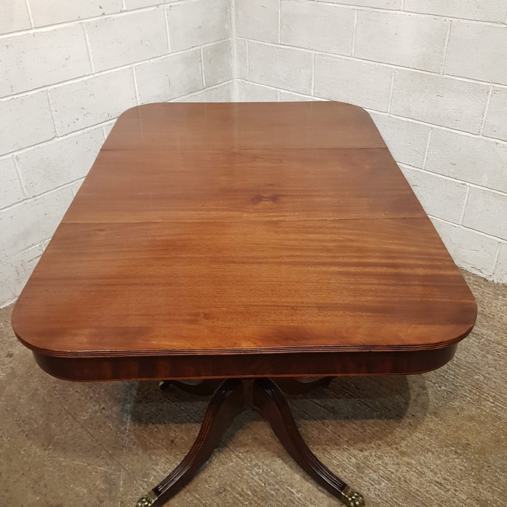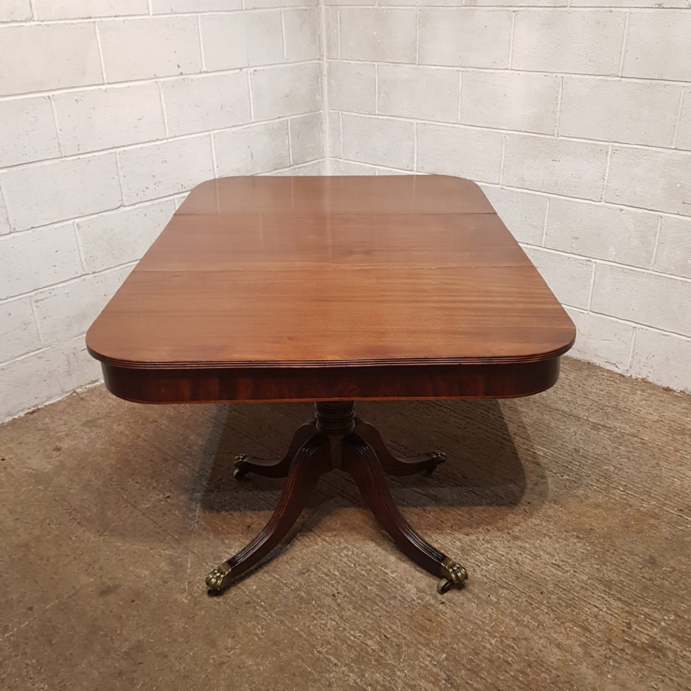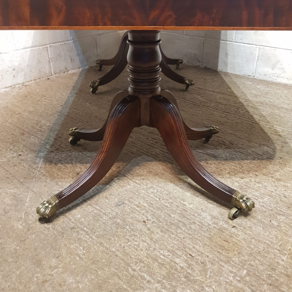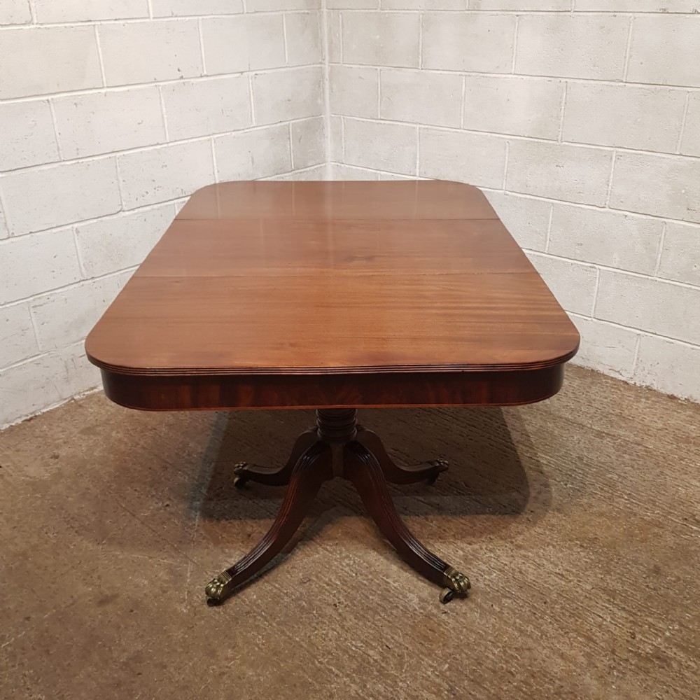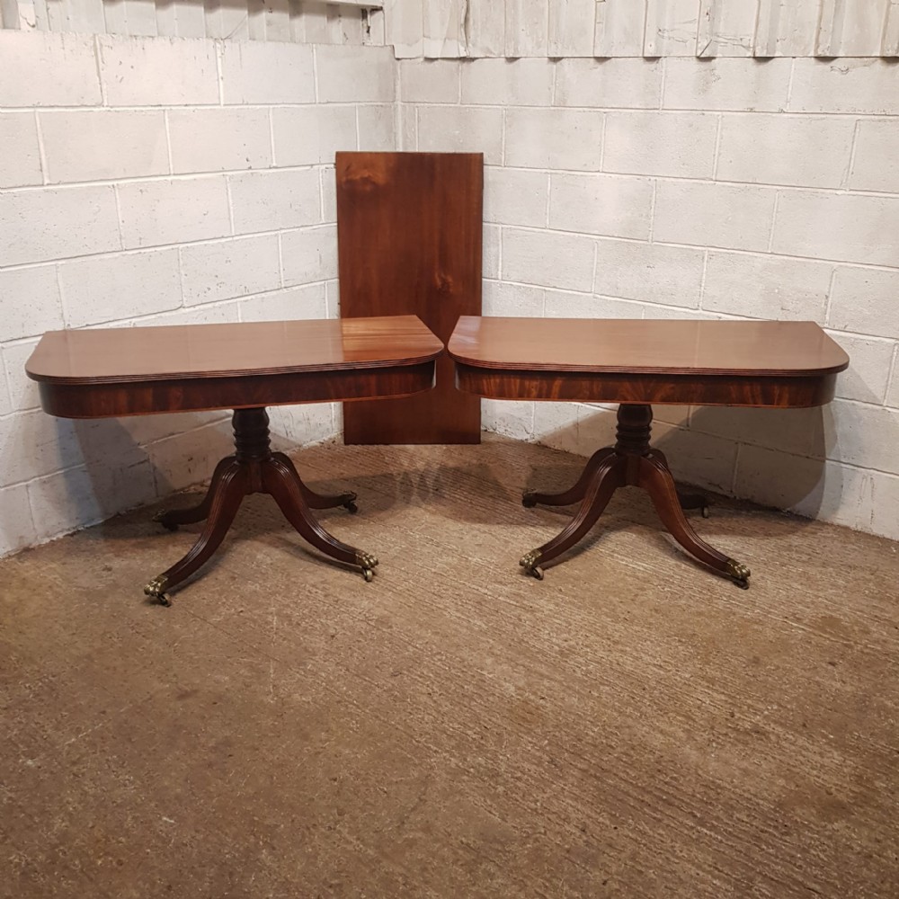 A Regency Mahogany twin pillar dining table and dating from around 1800 - seats 8 comfortably. This twin pillar dining table has a readed edge to the top with a wide lip underneath with an inlaid bottom edge. The pillars have a turned central support on four shaped and readed legs on original Brass paw castors. The two ends can also be used as side tables.