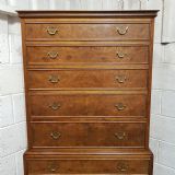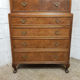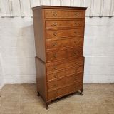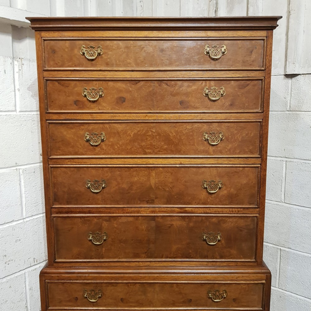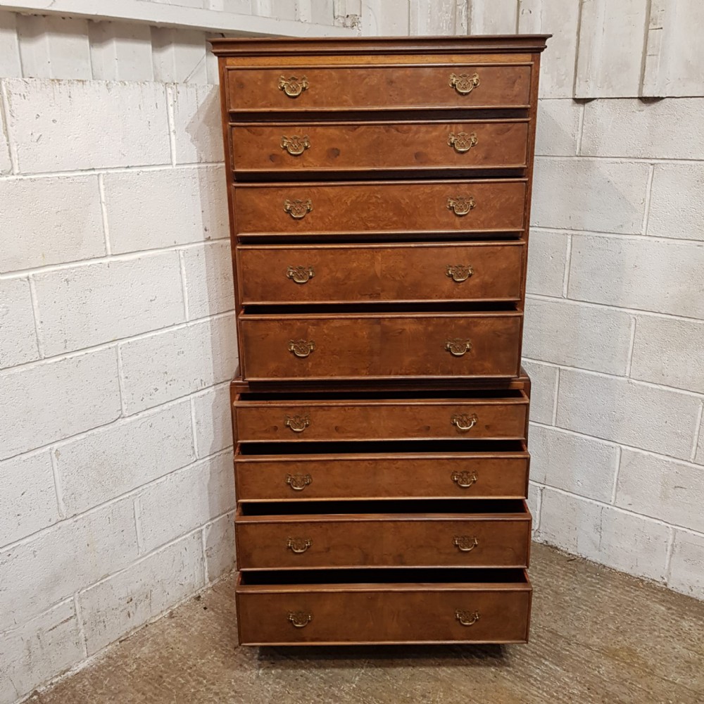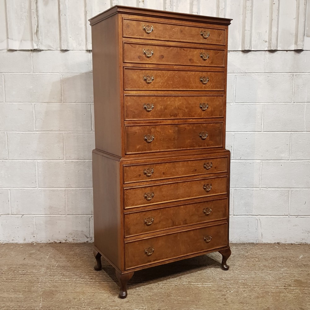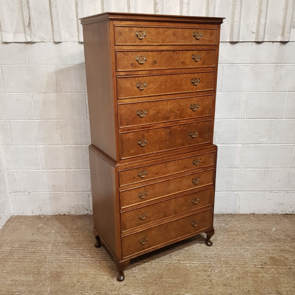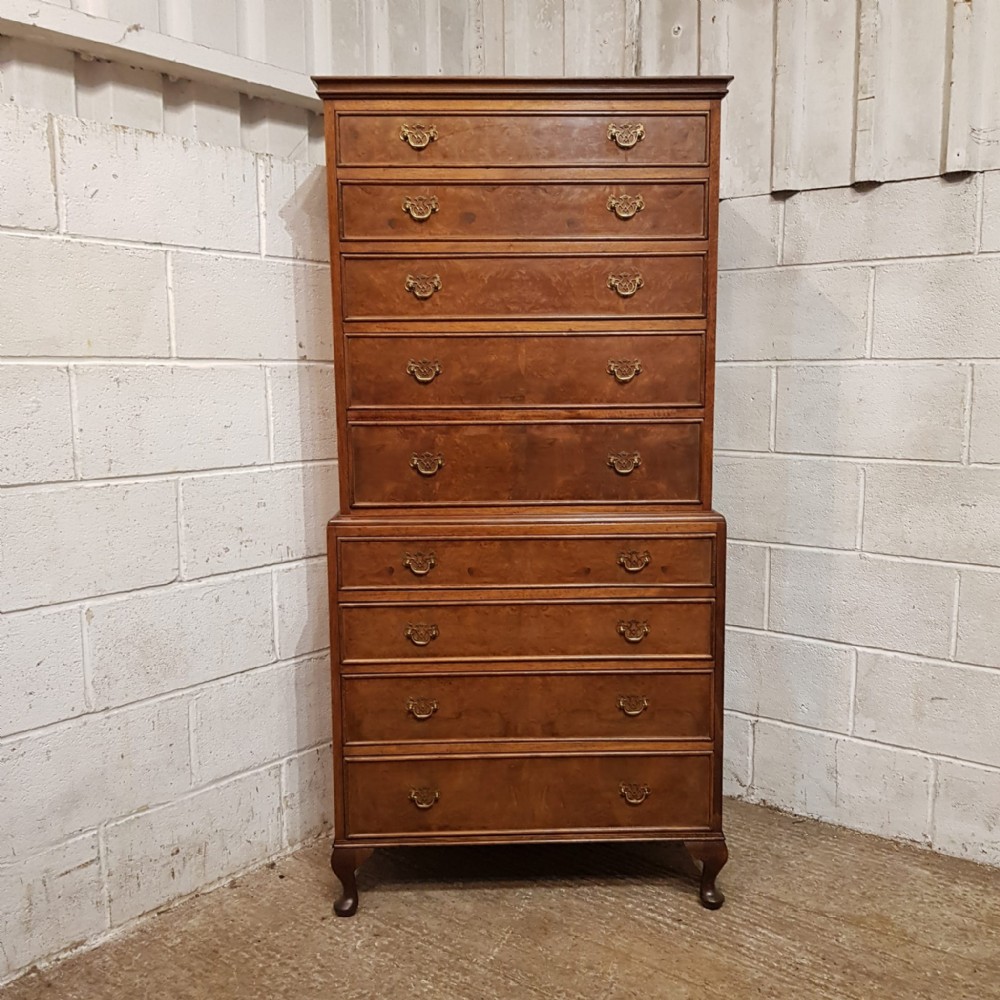 A Walnut chest on chest and dating from around 1920. This lovely piece has a moulded cornice with five long graduating drawers underneath all of which are Mahogany lined with original Brass handles and Burr Walnut drawer fronts. The base is moulded around the top with four long graduating drawers which are the same as above. It is moulded around the bottom and stands on short cabriole legs.