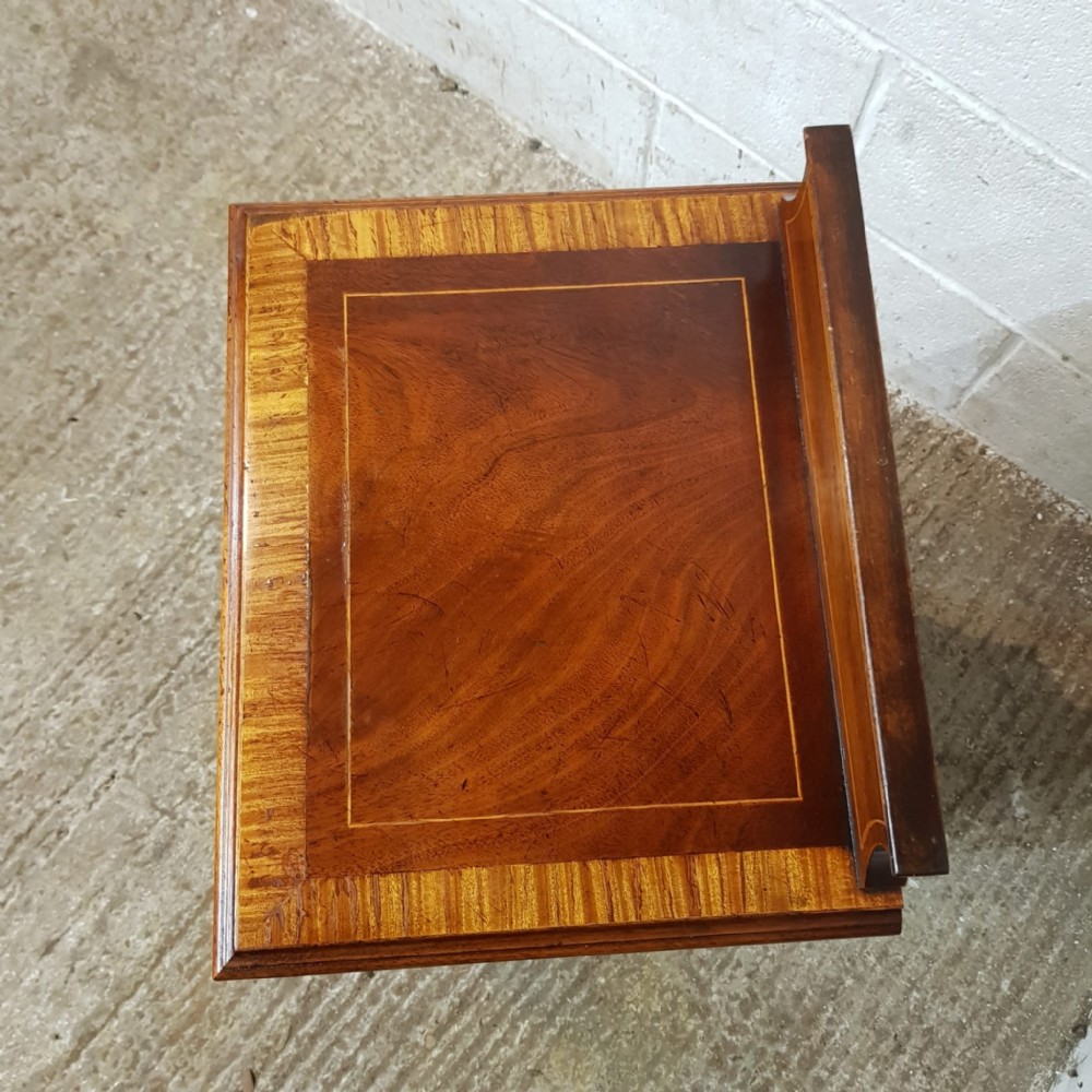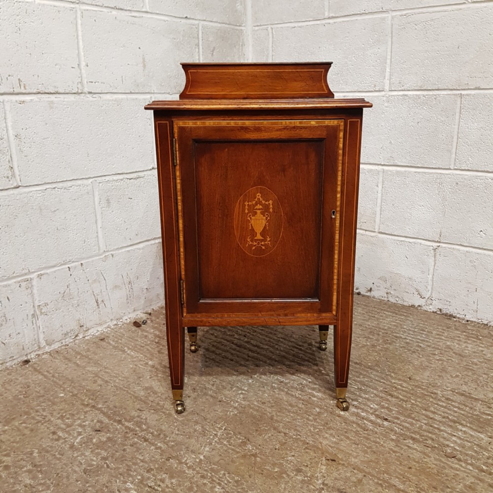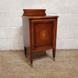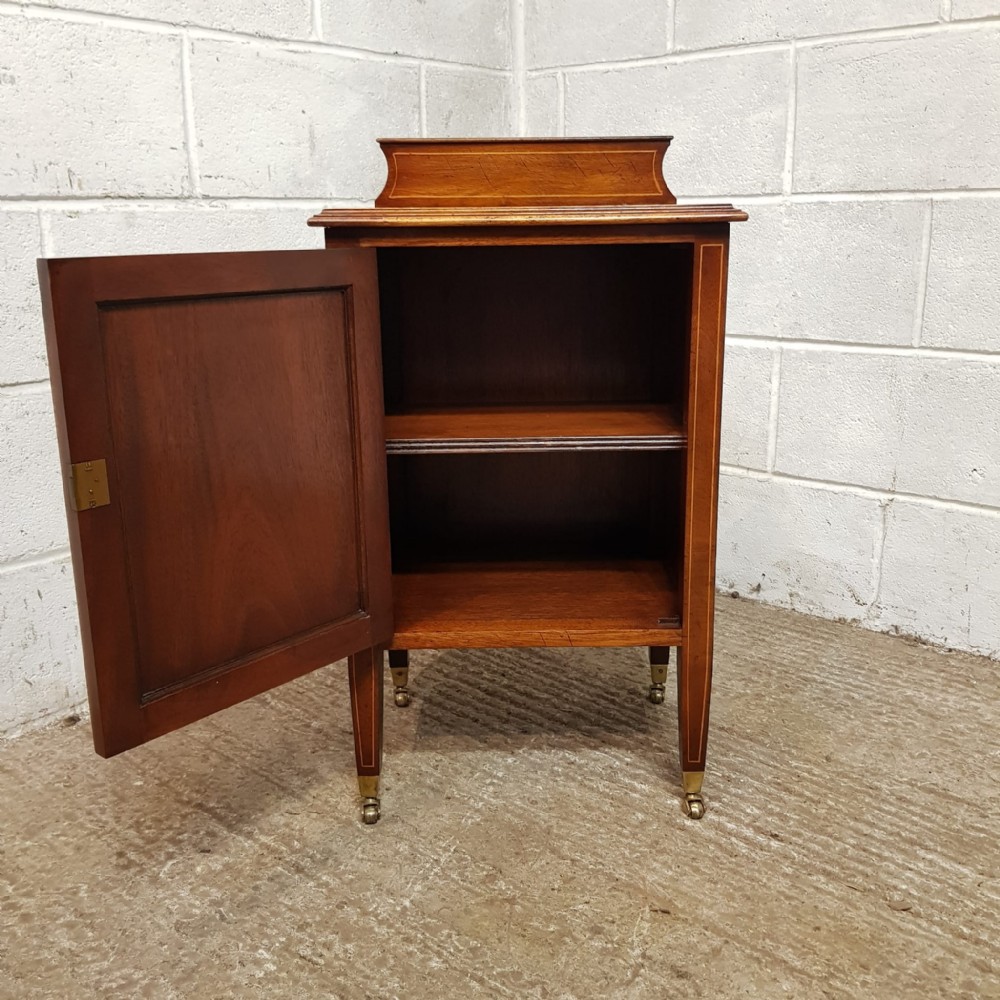 A pair of Edwardian Mahogany and Satinwood bedside cabinets and dating from around 1900. These beautiful pair of bedside cabinets have a Satinwood strung gallery back and a Satinwood Strung cross banded and moulded edge. The door fronts have a Satinwood cross banded edge and an inlaid moulded panel door with a shelf inside. It stands on Satinwood strung tapered legs on Brass shoe castors.