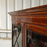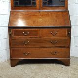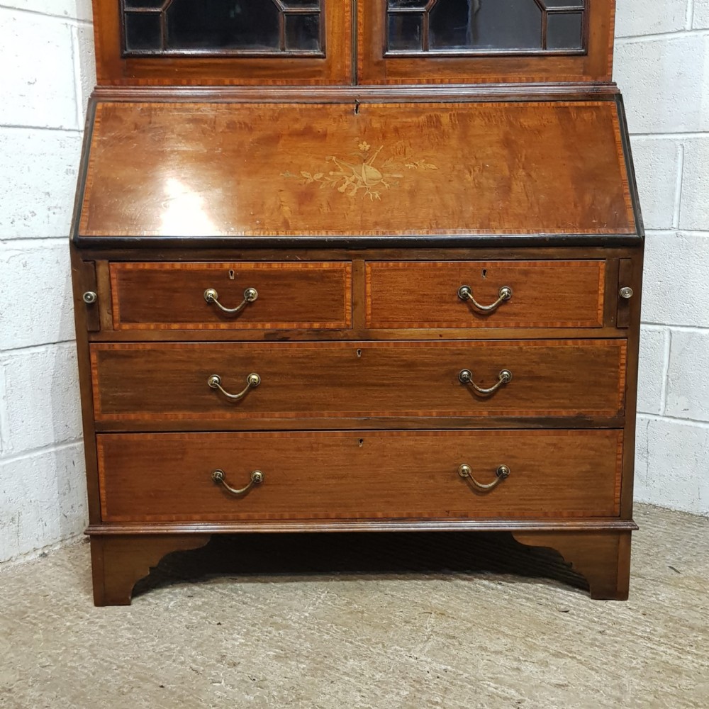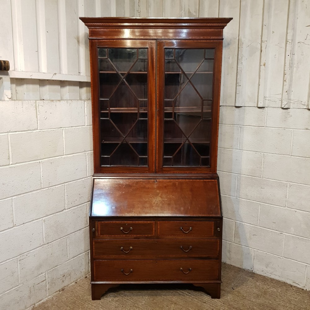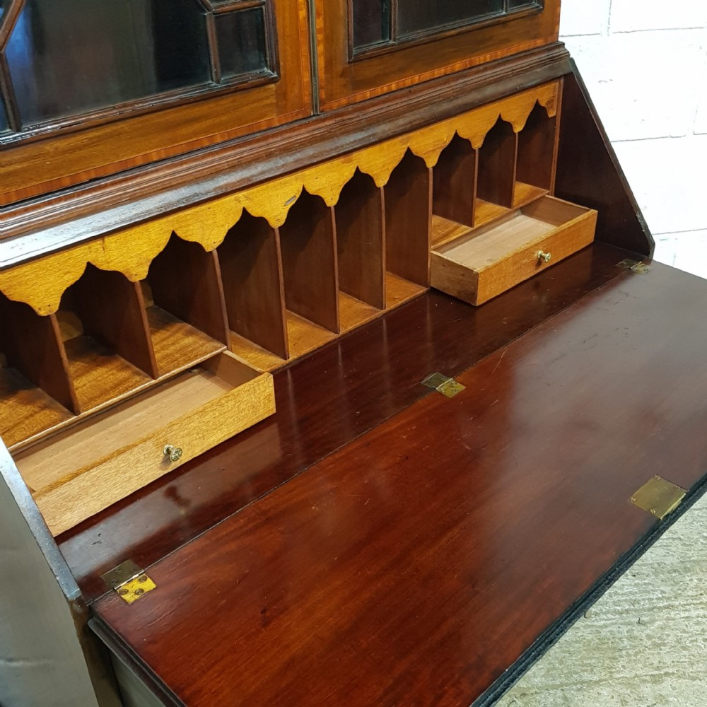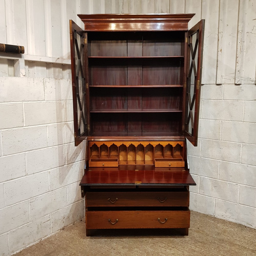 An Edwardian Mahogany bureau bookcase and dating from around 1900. This wonderful example has a dental moulded cornice with a strung lip underneath. It has two Astragal glazed doors with strung door frames and a key with three fully adjustable shelves inside. The base has a moulded edge to the fall front with an inlaid centre with a key. Inside are pigeon holes and two small draws. Under the desk are two short above two long graduating Oak lined drawers with original handles and a cross banded edge to the drawer fronts. It stands on bracket feet and separates into two pieces for ease of movement.